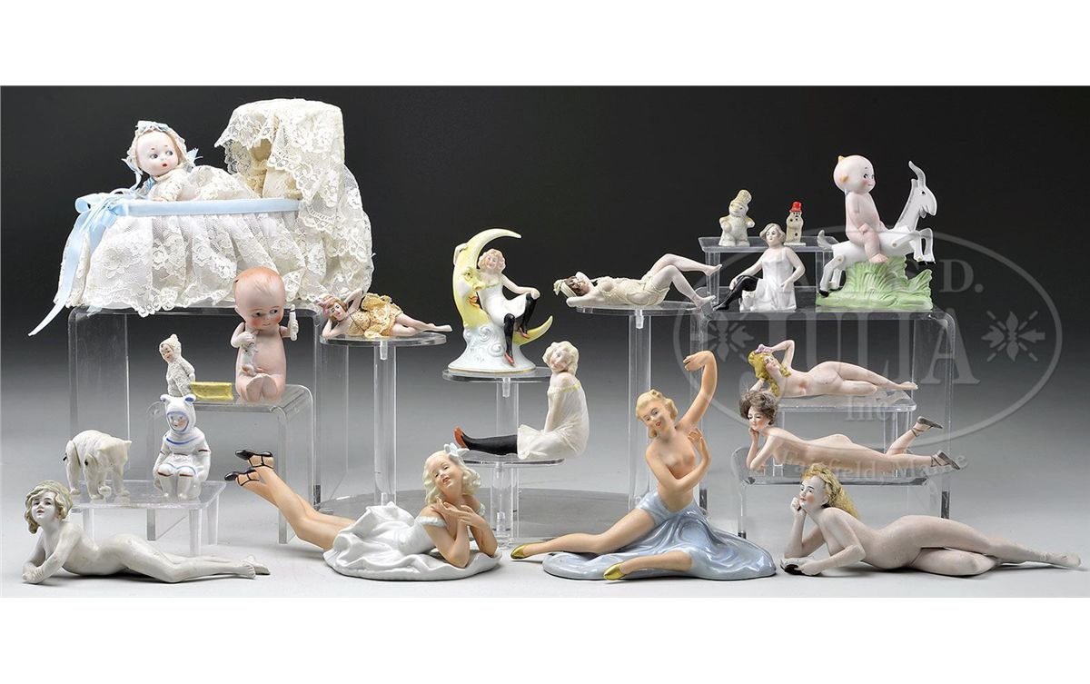 Included are several bathing lady type figures. Amongst them is Galluba and Hoffman lady with original wig, several by Schaffer & Vater, a Kewpie riding a rocking goat (of more recent vintage), several snow babies, a jointed bear, and an unusual seated baby with jointed arms with molded baby bottle in one arm and a bisque cat molded to the belly. SIZE: Tallest 5-1/2" (14 cm). Smallest 1-1/2" t (4 cm). CONDITION: Fair to very good. Minor chips and or restorations found on several. 1-13309