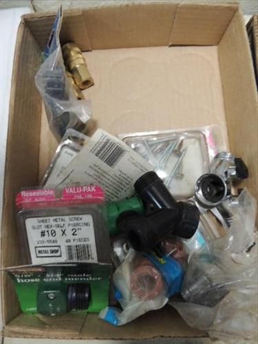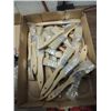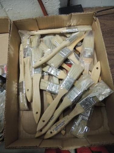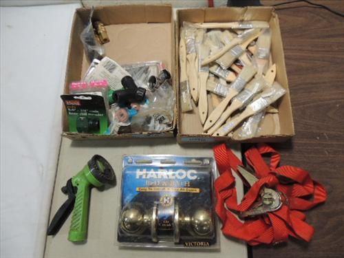 ASSORTED LOT: PAINT BRUSHES, HARLOC INTERIOR BRASS DOOR HANDLE. STRAP DOWN AND MORE. AS SHOWN. VIEW PICTURE FOR DETAIL.