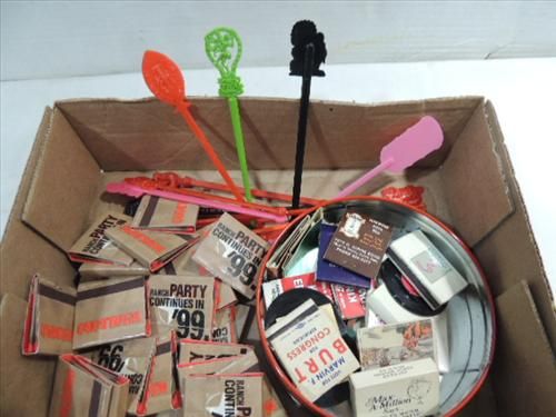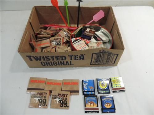 ASSORTED LOT TOBACIANA VINTAGE MATCHBOOKS: CAMEL, MARLBORO AND A SELECTION OF SWIZZEL STICKS. AS SHOWN. VIEW PICTURE FOR DETAIL.