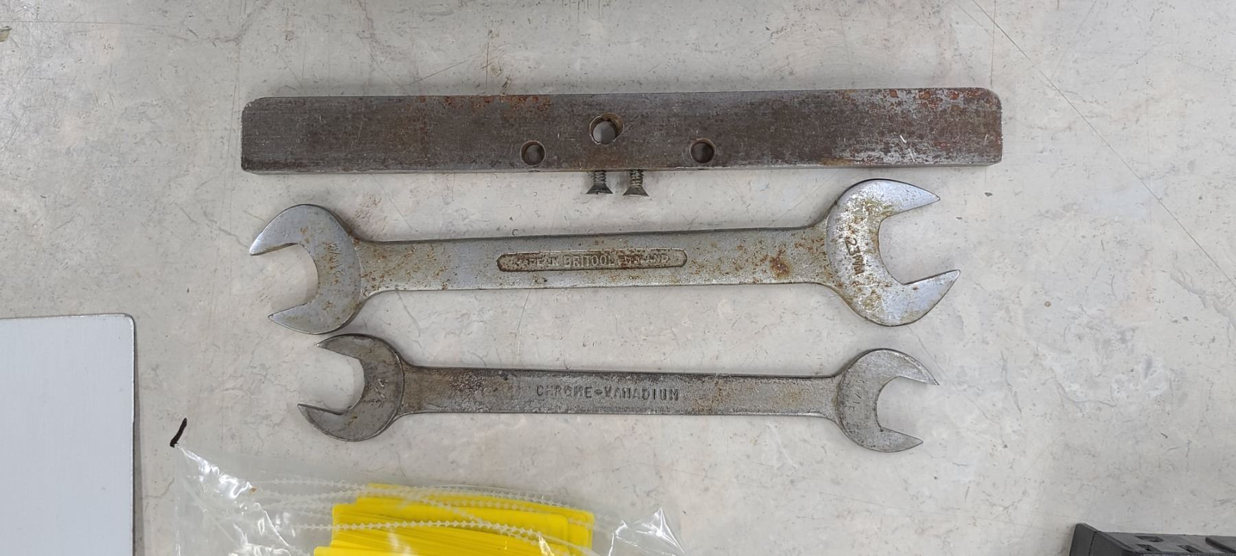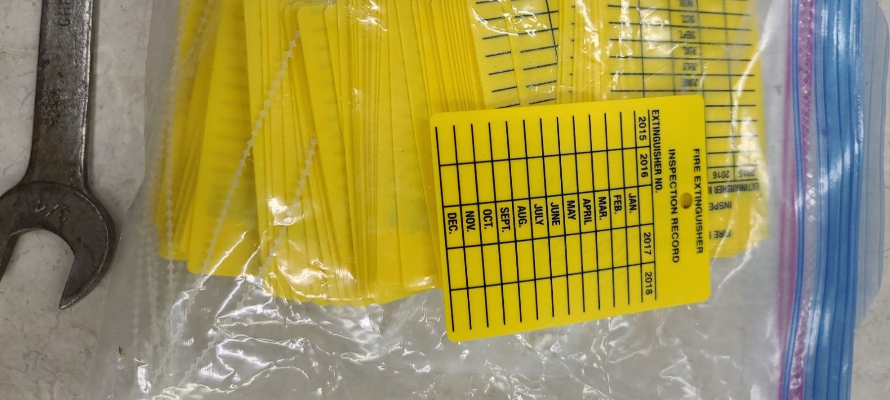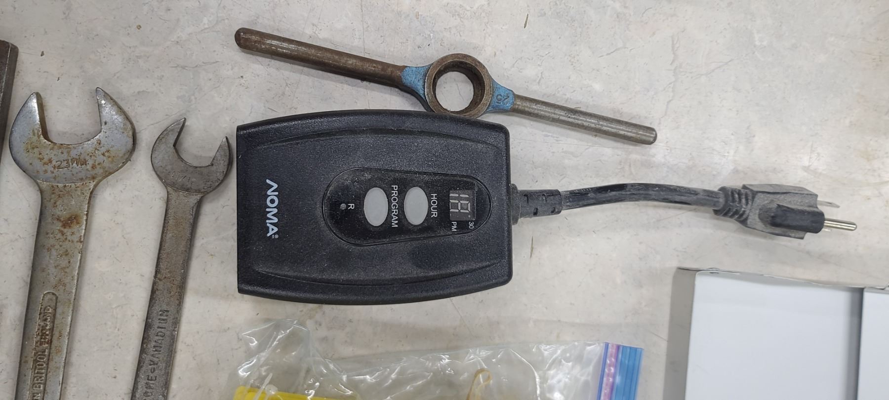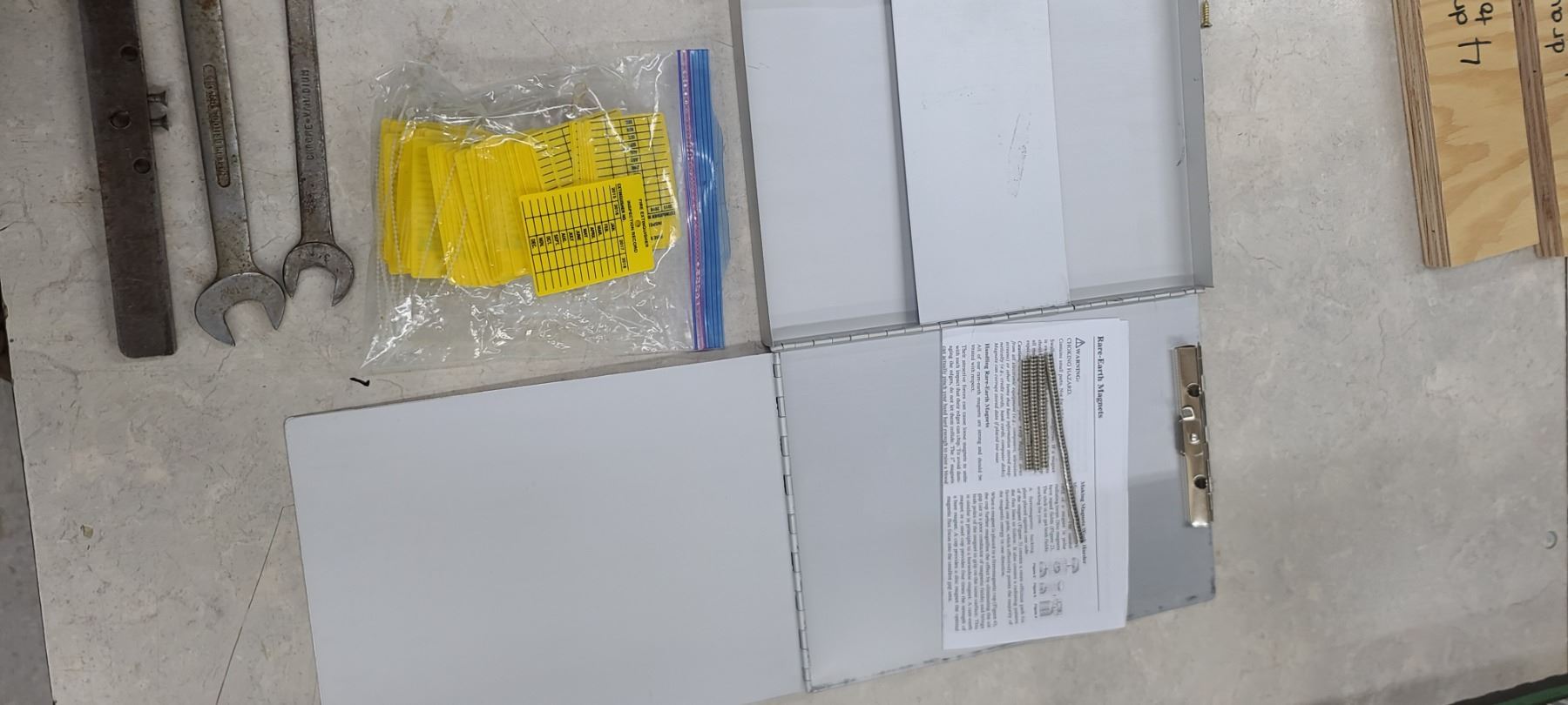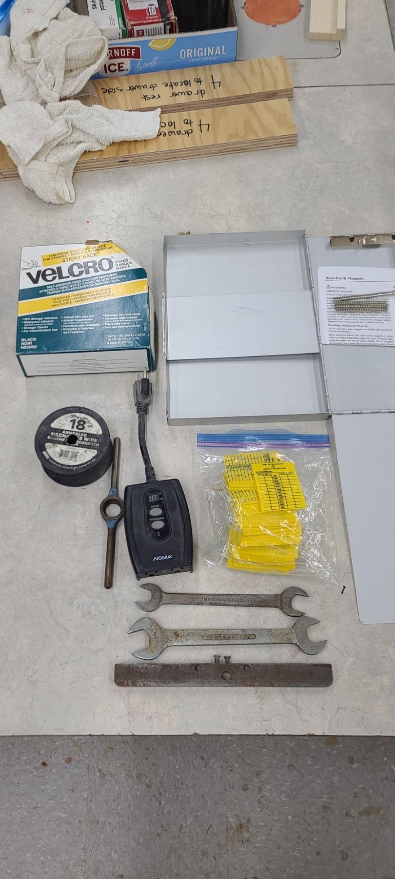 ASSORTED LOT: VELCRO, NOMA TIMER, 18GA MACHINISTS WIRE, FIRE EXTINGUISHER DATA TAGS, WRENCHES ANDCLIPBOARD