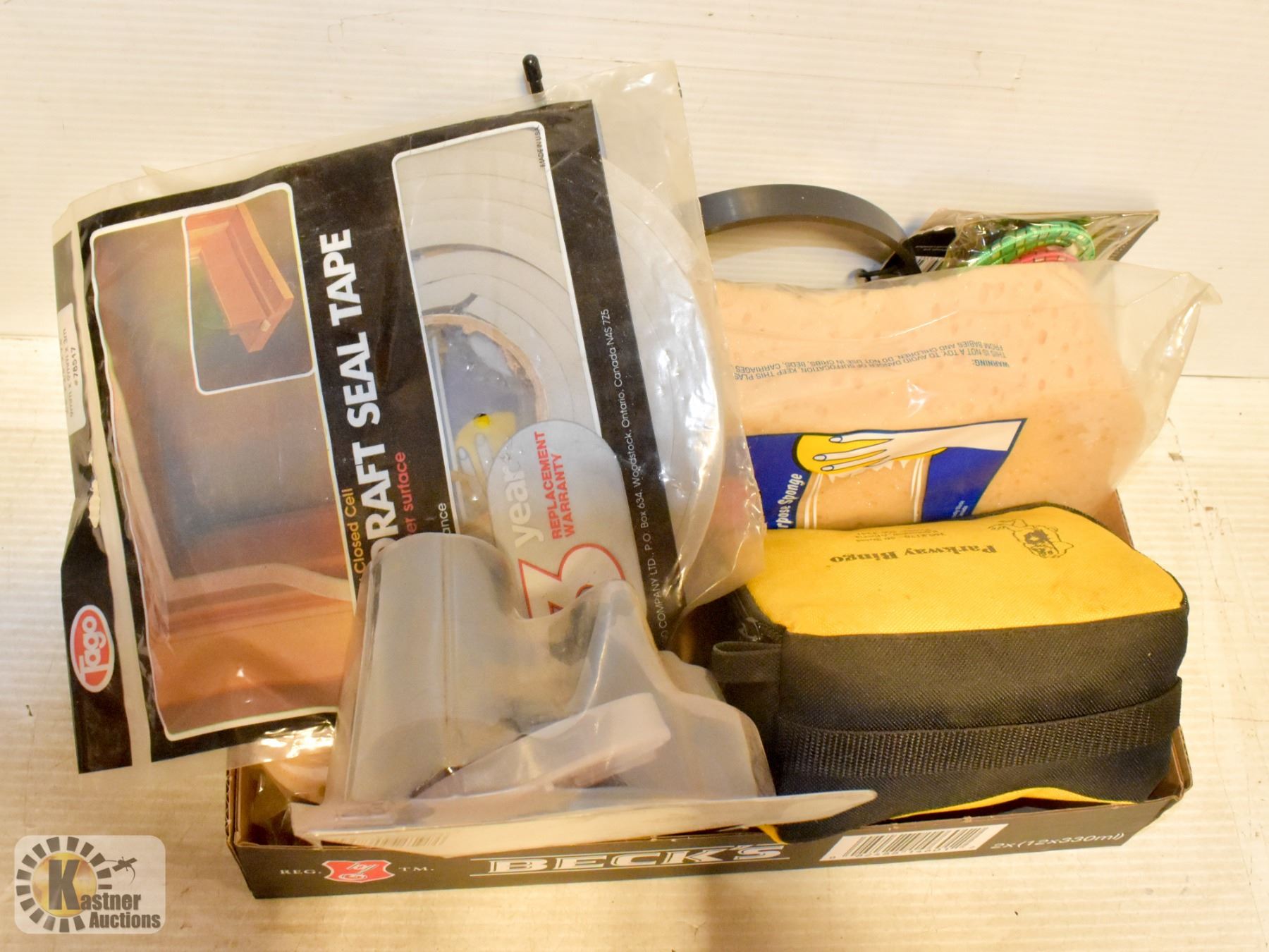 ASSORTED LOT W/ 2 SPONGES, EMERGENCY KIT, DRAFT