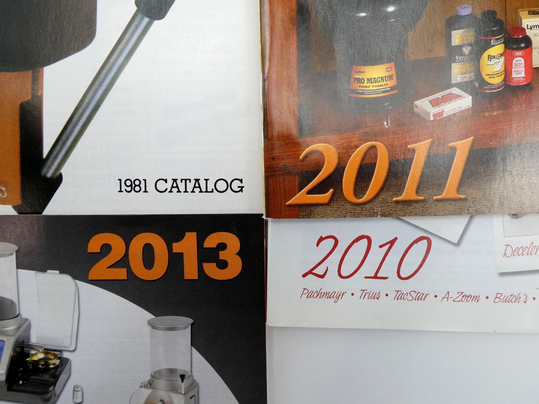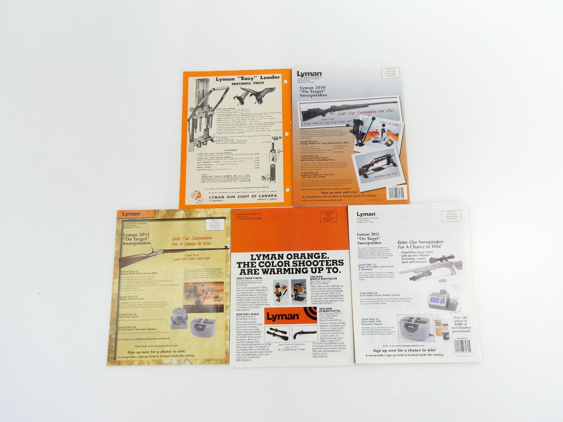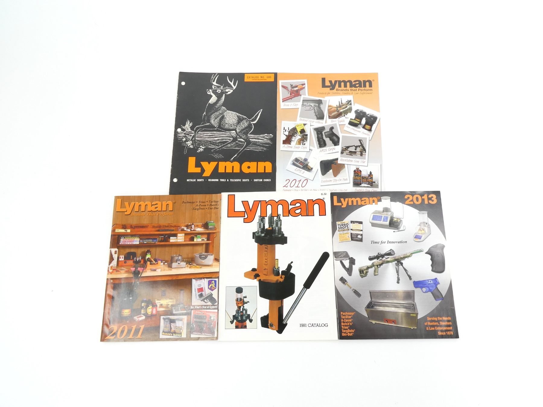 SOFT COVERS, LOT INCLUDES; (1) "LYMAN 2011" CATALOGUE, (1) "LYMAN 2010" CATALOGUE, (1) "LYMAN 1981 CATALOG" CATALOGUE, COPYRIGHT 1981, (1) "LYMAN CATALOG NO. 68C" & (1) "LYMAN 2013, TIME FOR INNOVATION" CATALOGUE. SEE PHOTOS.