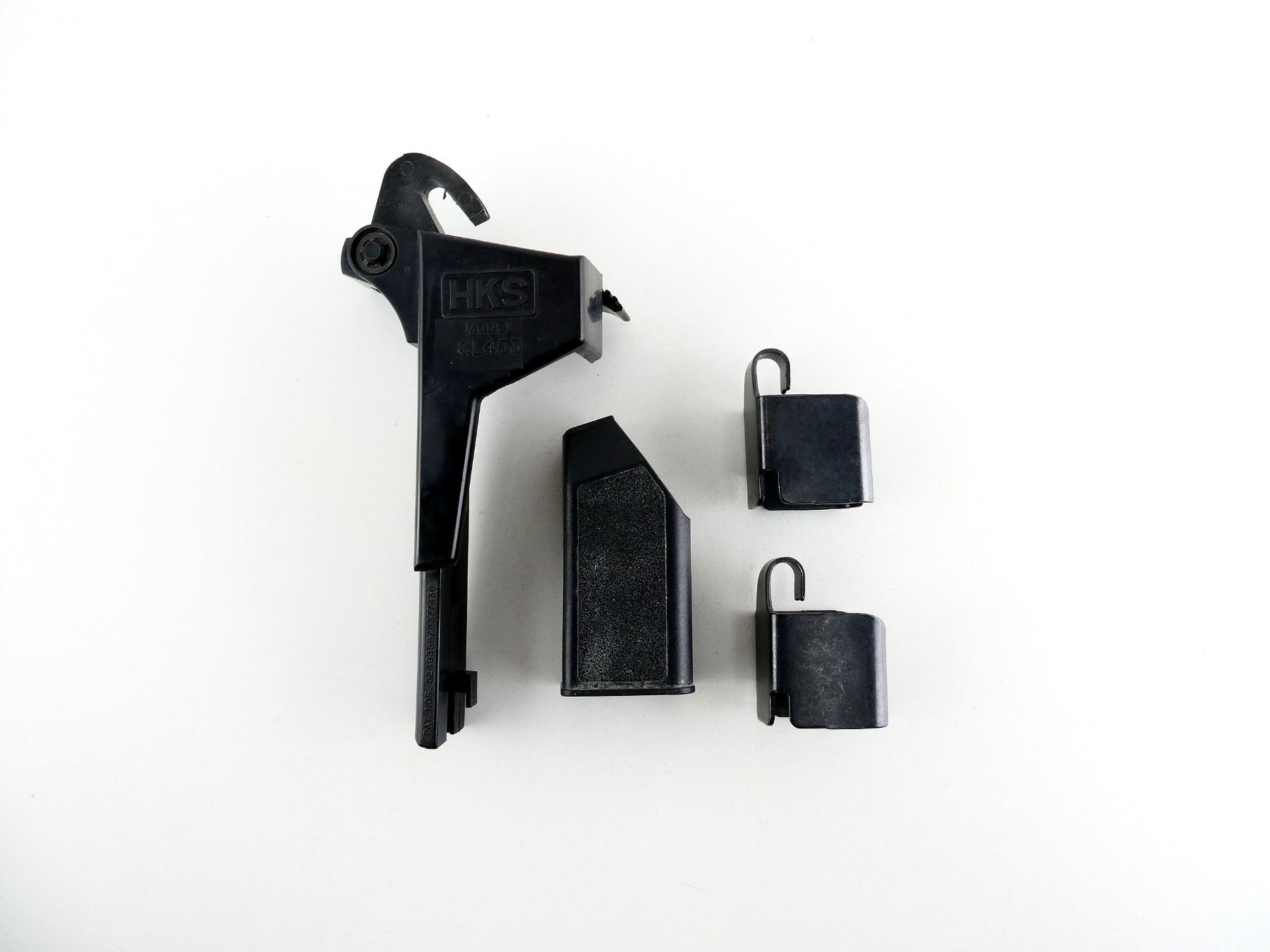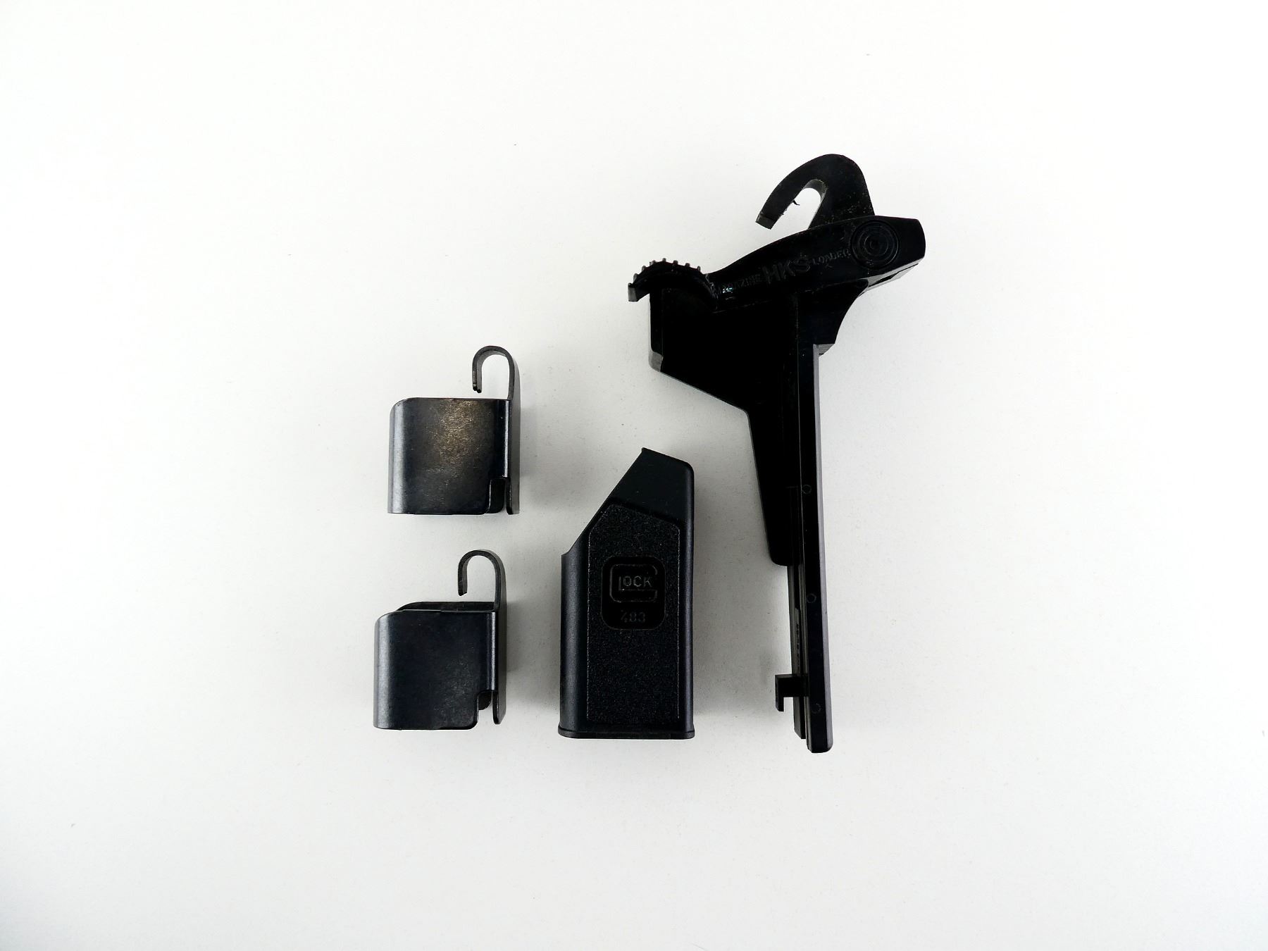 LOT INCLUDES; (2) RUGER MAG LOADERS, POSSIBLY FITS P89 MAGS ?, BLUED STEEL CONSTRUCTION, (1) HKS GL453 9MM MAG LOADER, BLACK POLYMER CONSTRUCTION, (1) GLOCK 483 MAG LOADER, BLACK POLYMER CONSTRUCTION. SEE PHOTOS.
