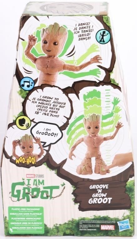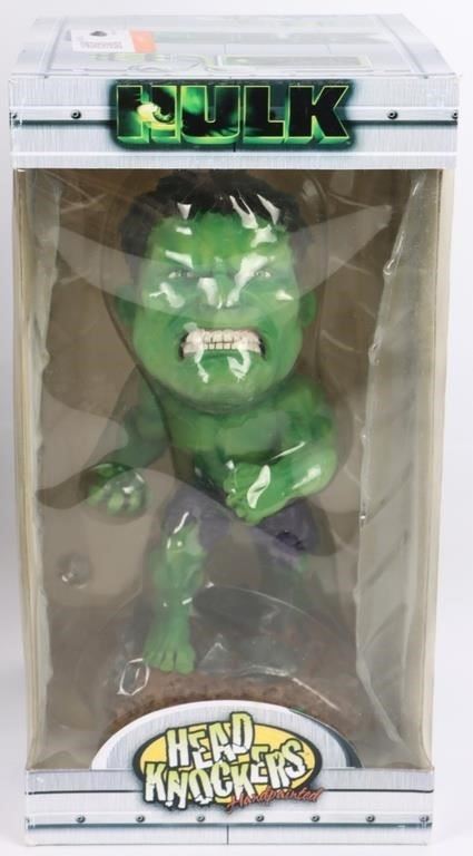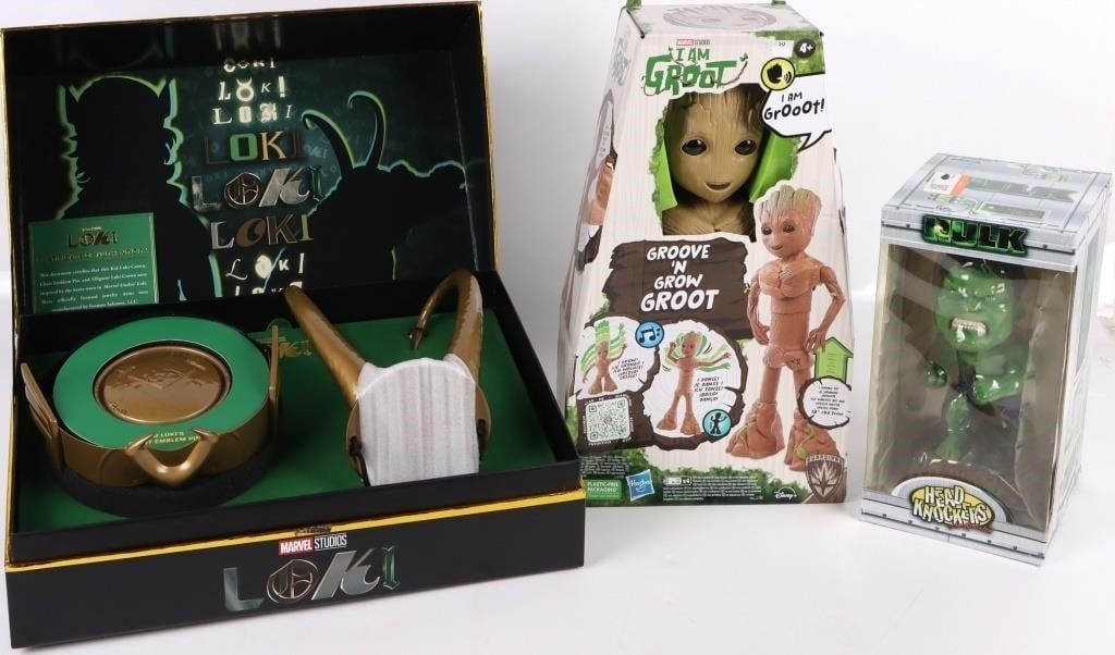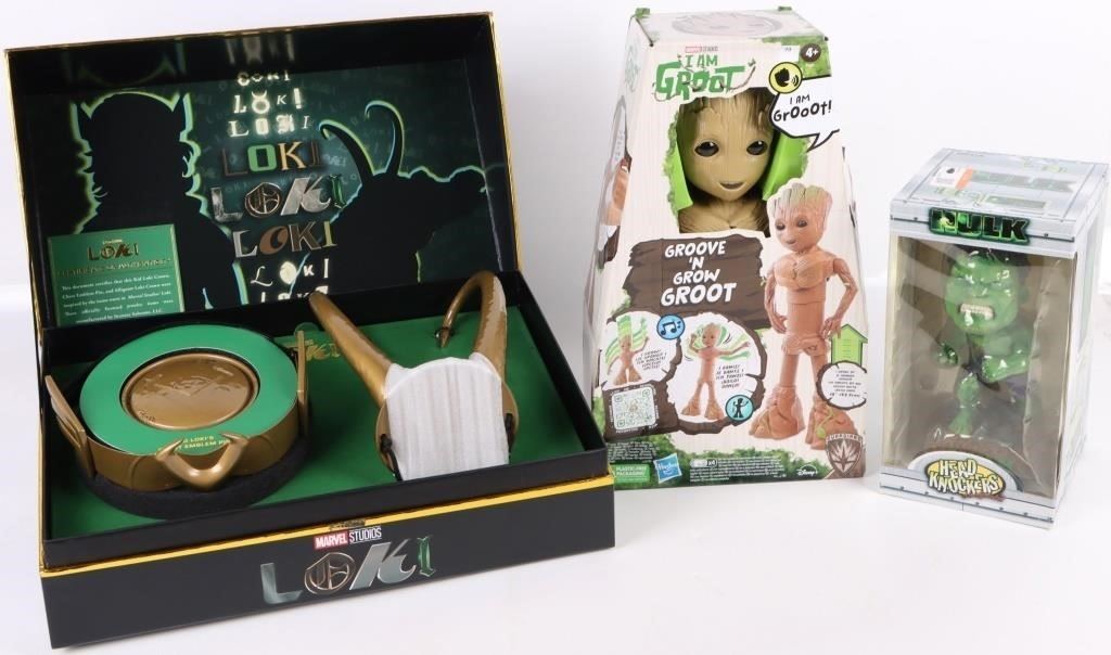 Assorted Marvel collectible toys to include one Incredible Hulk 2003 Head Knockers bobble head, one Groove 'N Grow Groot, and one Loki Alligator kid crown collector game stop box limited edition. Contents unopened from their original boxes.
