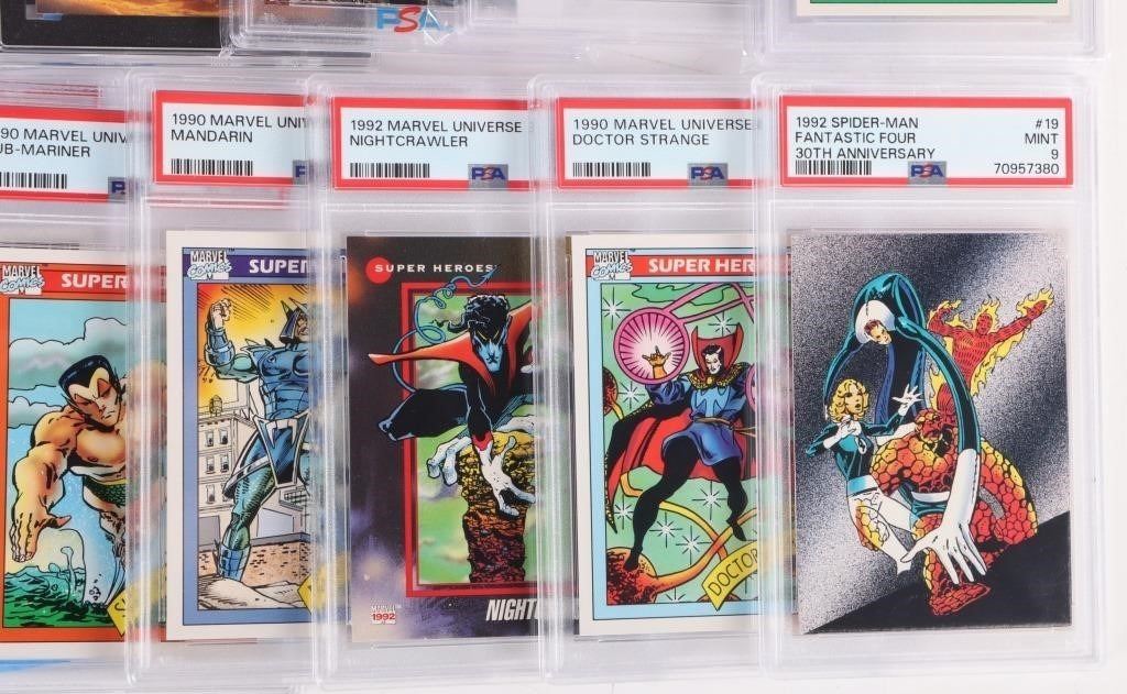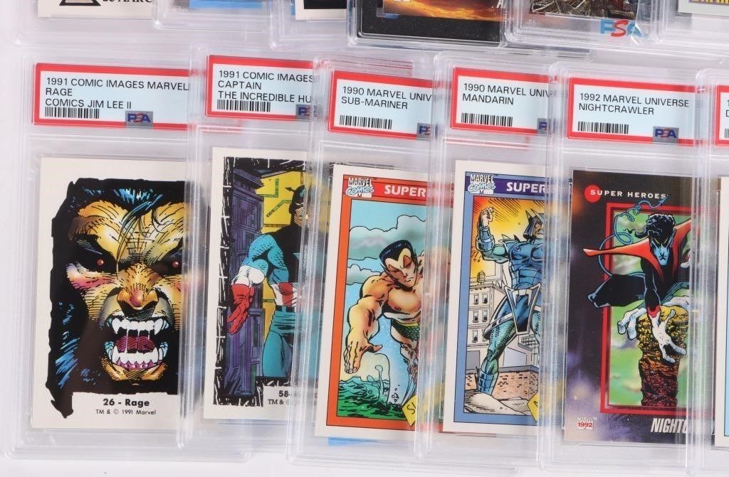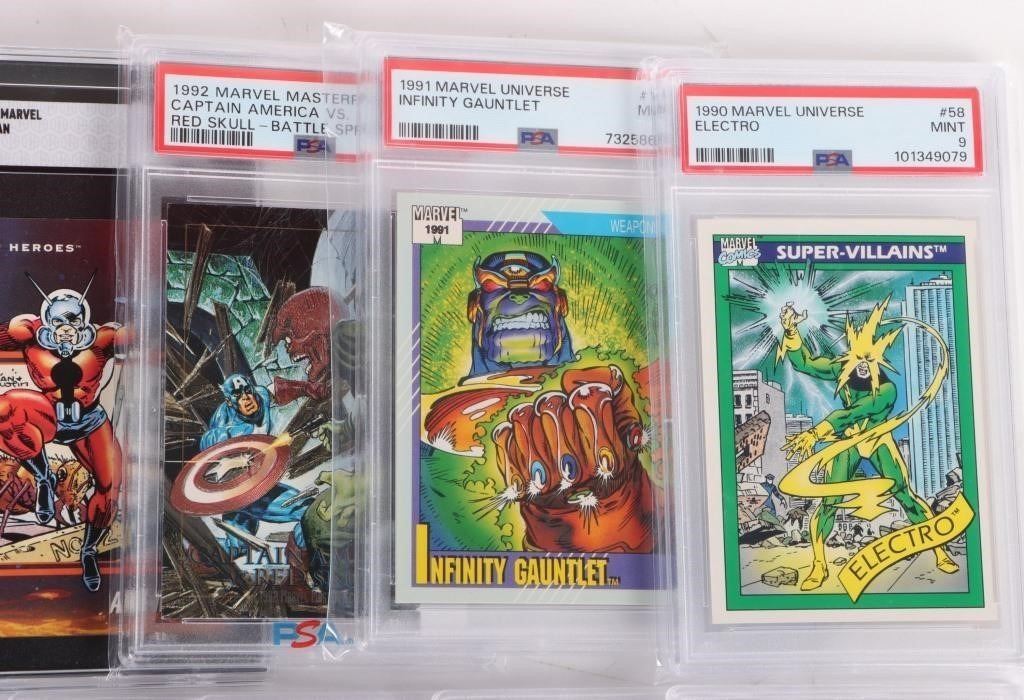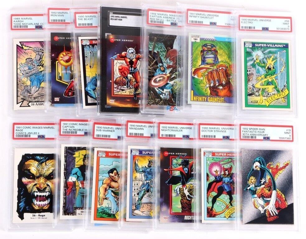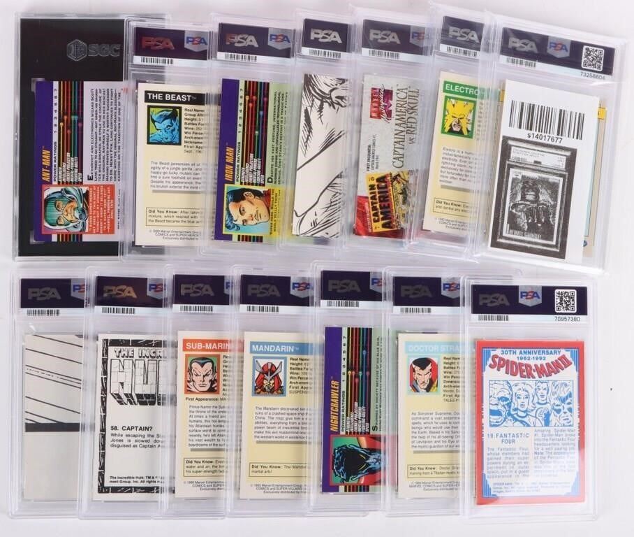 Assorted Marvel comic cards lot of 14 slabbed and graded. PSA grades range from 7.0-9.0. This lot includes cards of Ant-Man, Dr. Strange, Electro, AARGH, The Beast, Spider-Man & Fantastic Four, Iron Man and more.