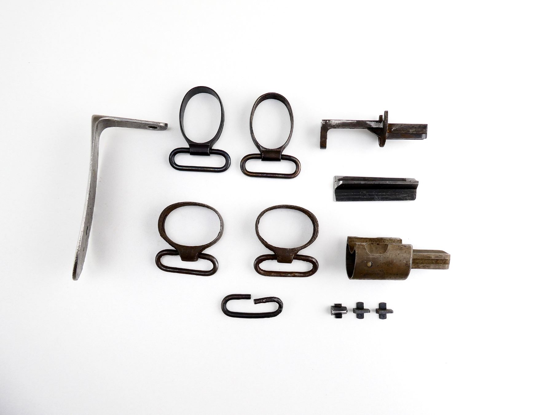 LOT INCLUDES; BUTT PLATE, (4) BARREL BANDS, (2) BAYONET LUGS, (3) FRONT SIGHTS, ETC. MAY REQUIRE FITTING. SEE PHOTOS.
