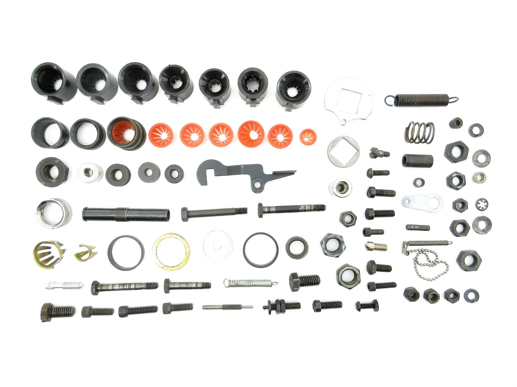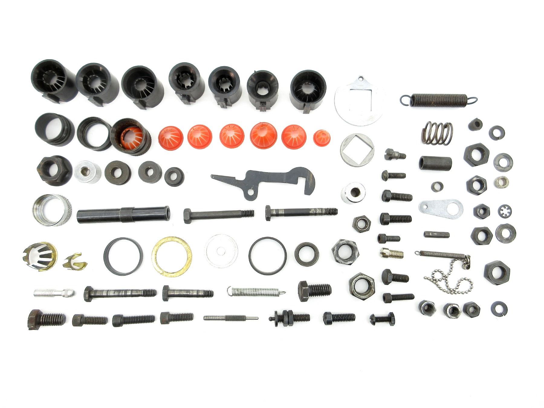 APPROX. (84) PIECES, ASSORTED GAUGES, INCLUDES; VARIOUS SIZED PLASTIC / METAL CRIMPERS, VARIOUS SIZED SCREWS, VARIOUS SIZED WASHERS, VARIOUS SIZED NUTS, VARIOUS SIZED LOCKING RINGS, VARIOUS SPRINGS, VARIOUS BRACKETS, ETC. SEE PHOTOS.
