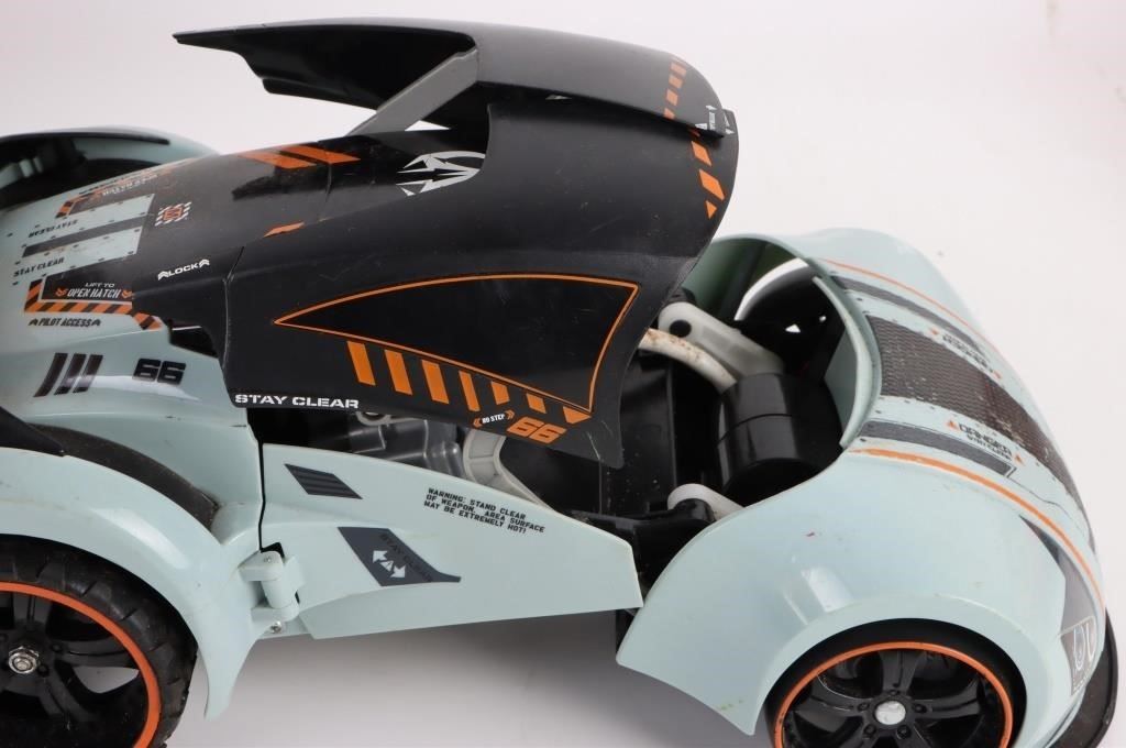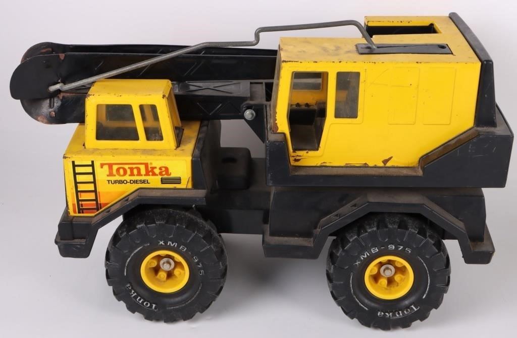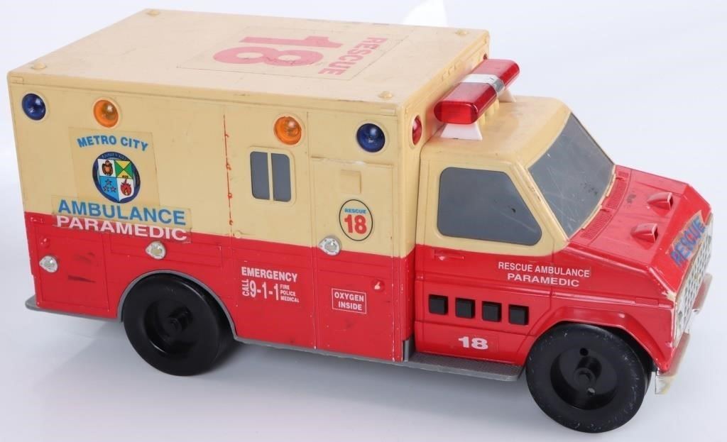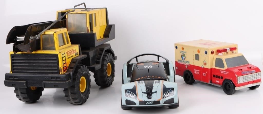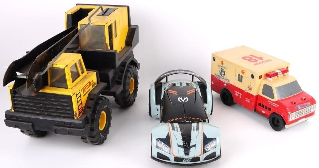 Assorted medium sized toy vehicles to include one VTG Funrise 1992 Ambulance Toy Truck Works, one 2014 R/C Fast Lane Morphing Missile, and one Tonka Mighty Turbo Diesel 1986 "Mighty Crane."