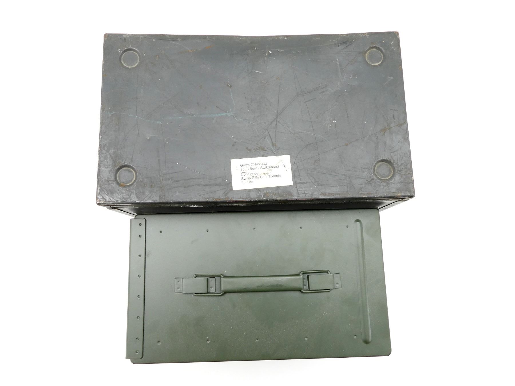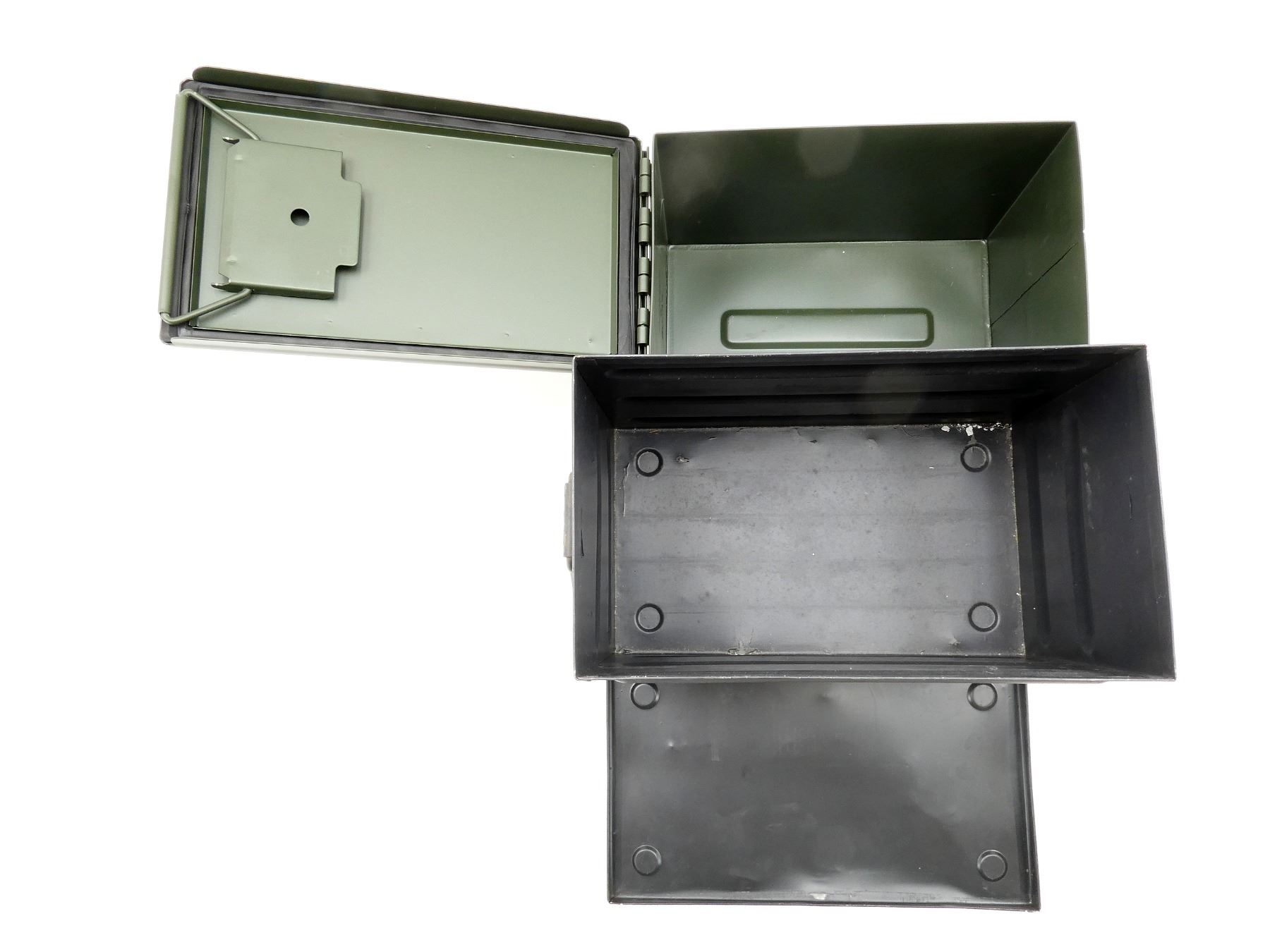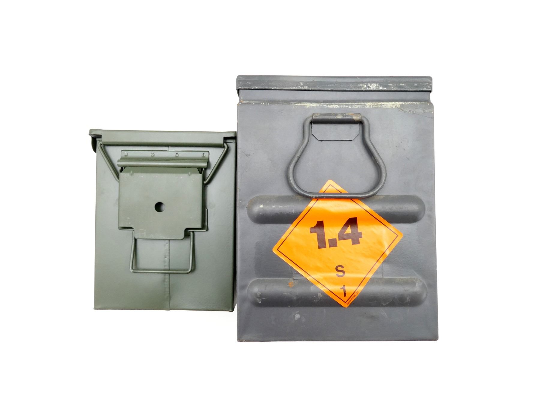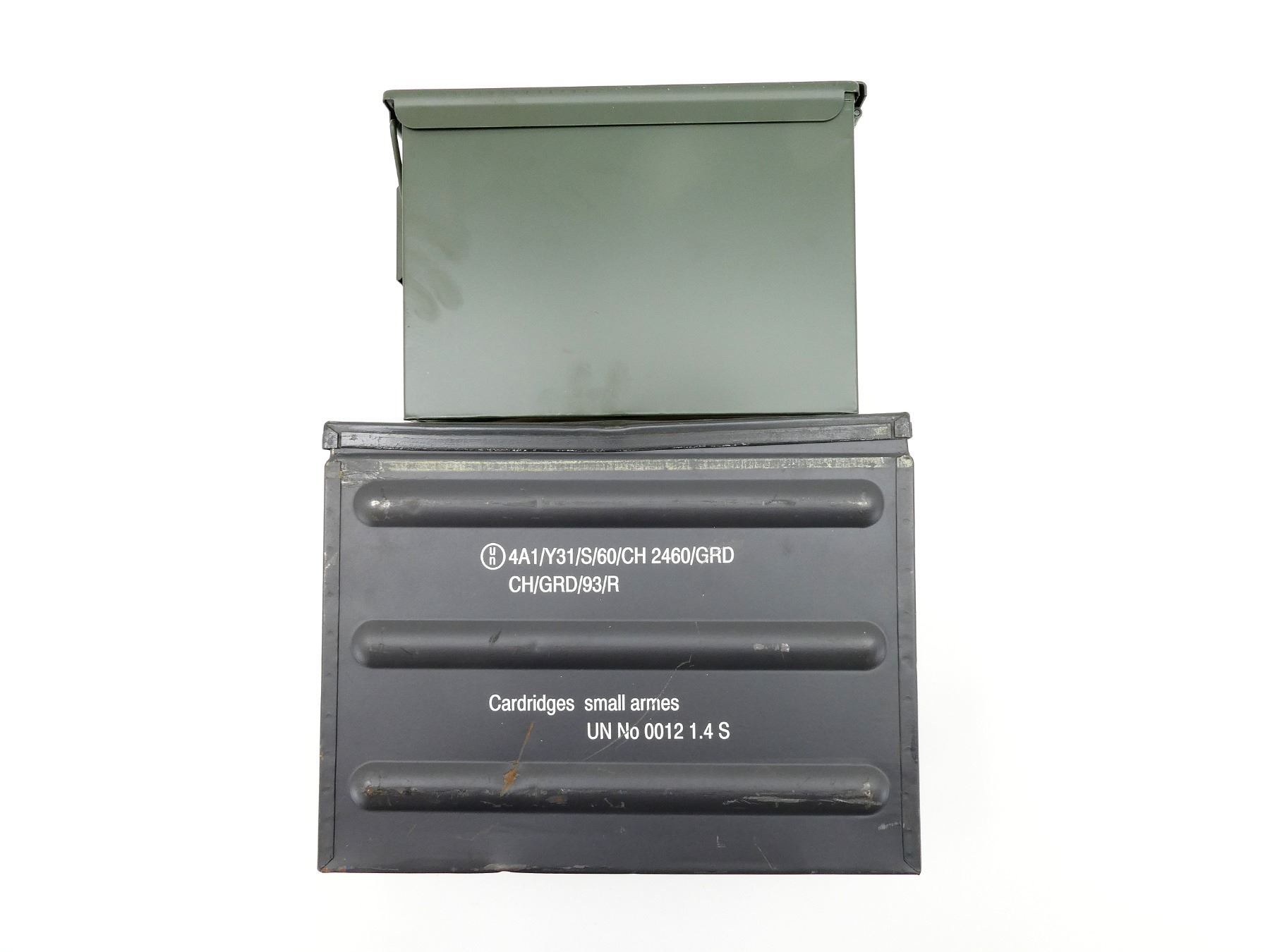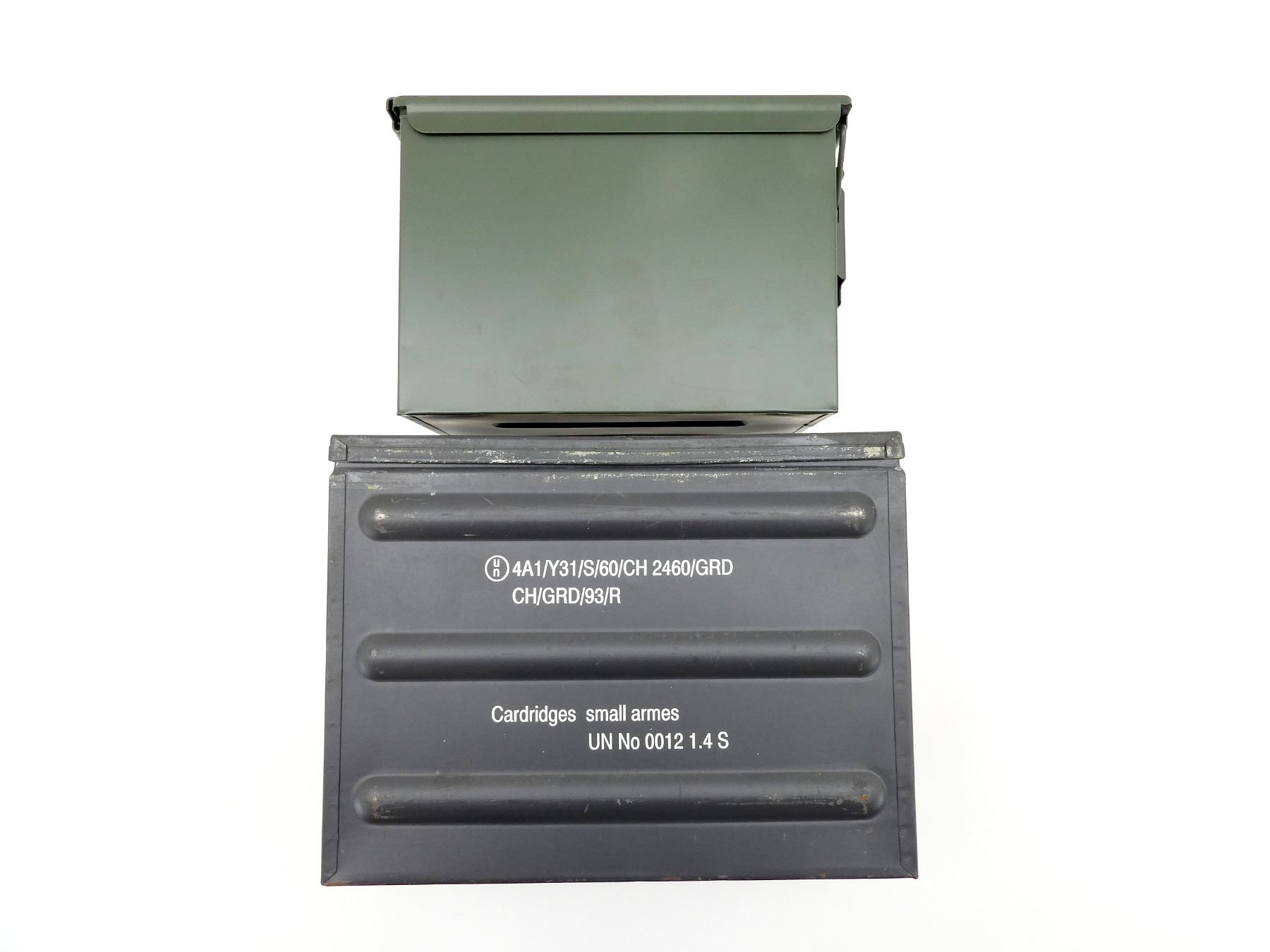 LOT INCLUDES; (1) GREY PAINTED METAL AMMO TIN, VARIOUS MARKINGS, APPROX. 14.5" X 8.5" X 11" & (1) GREEN PAINTED METAL AMMO TIN, VARIOUS MARKINGS & APPROX. 12.75" X 7 3/8" X 8.75". SEE PHOTOS.