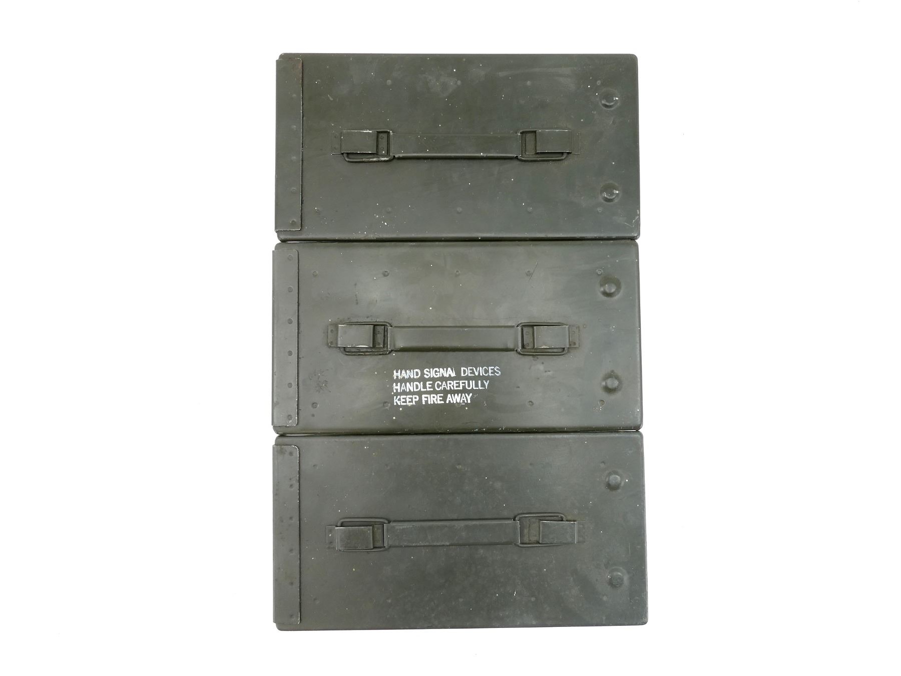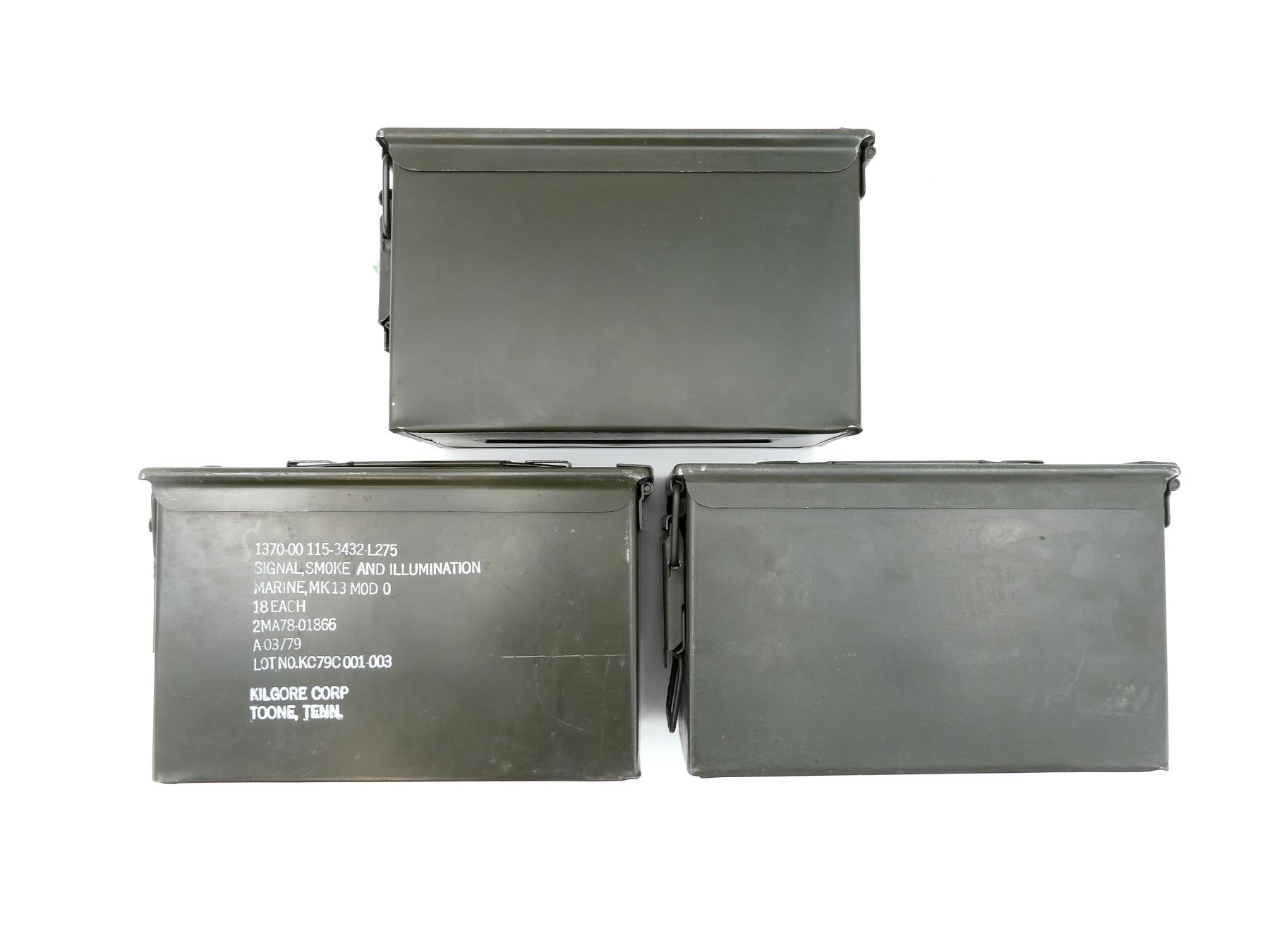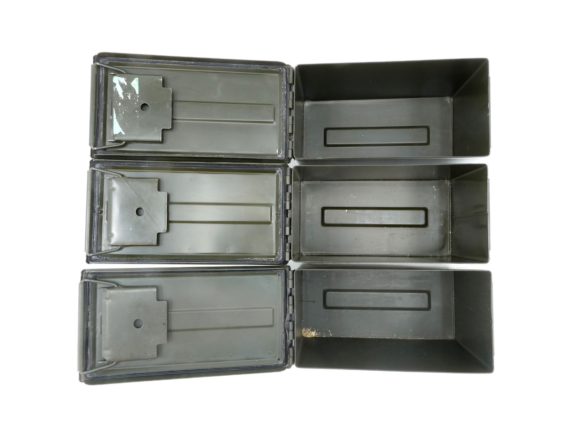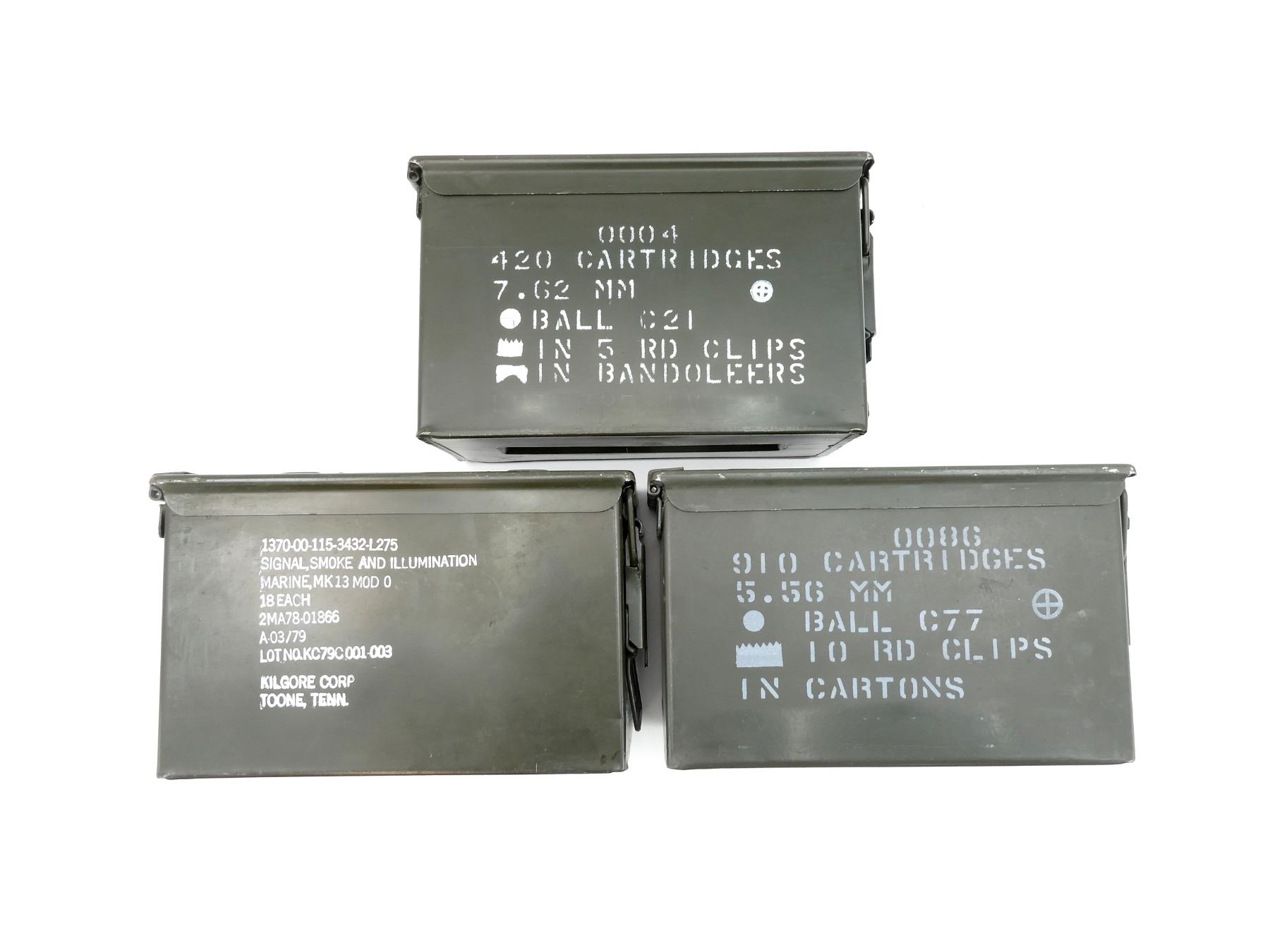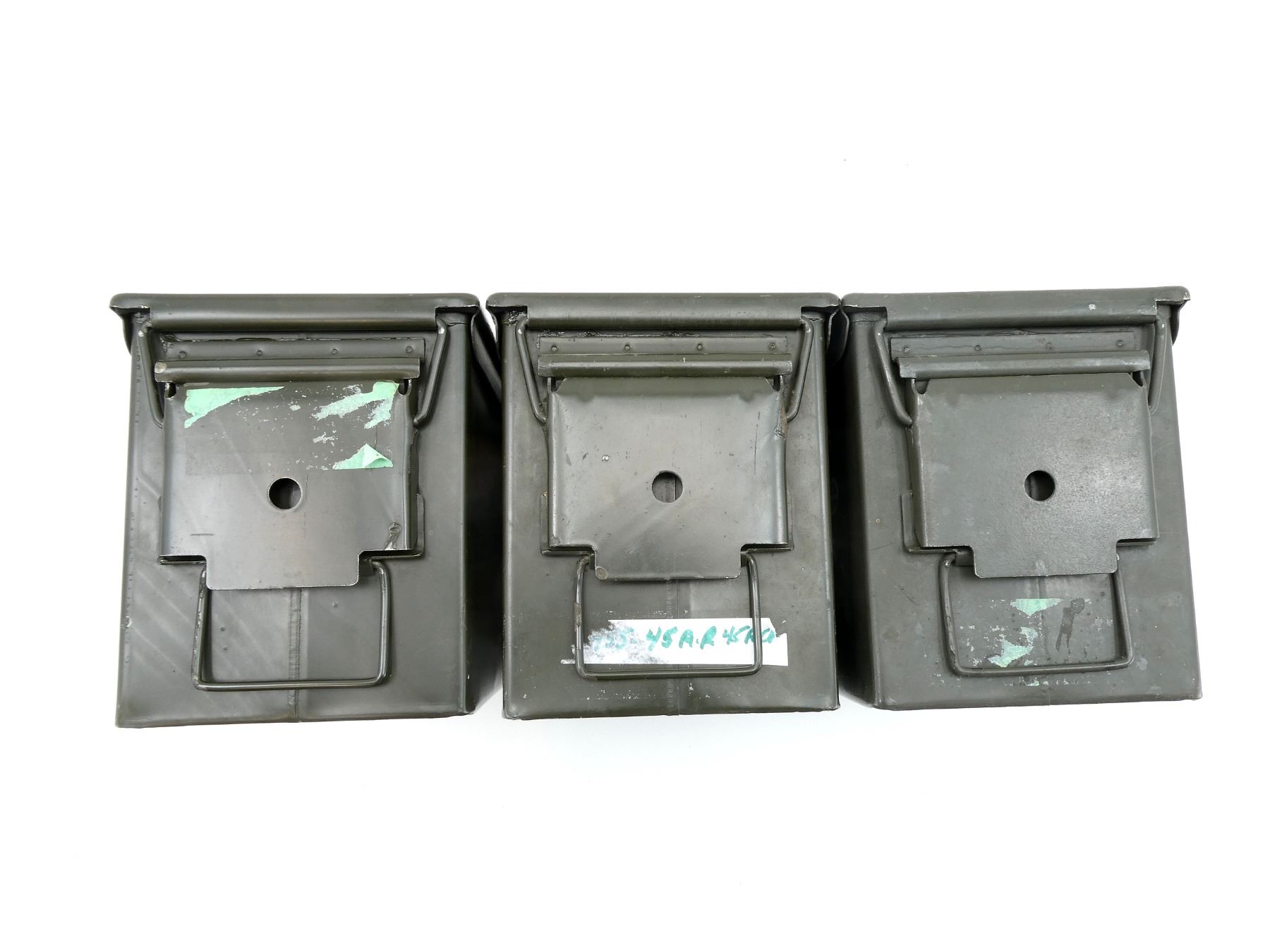 LOT INCLUDES; (3) GREEN PAINTED METAL AMMO TINS, VARIOUS MARKINGS, APPROX.12" X 6.25" X 7.25". SEE PHOTOS.