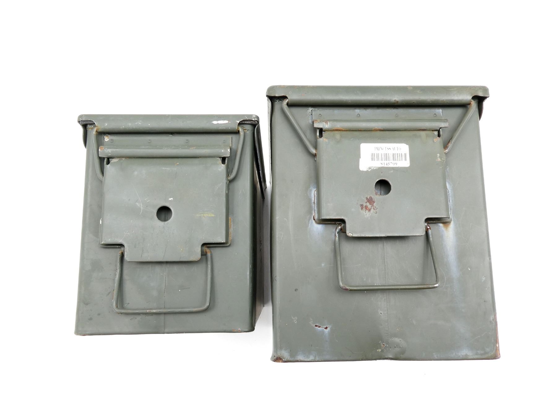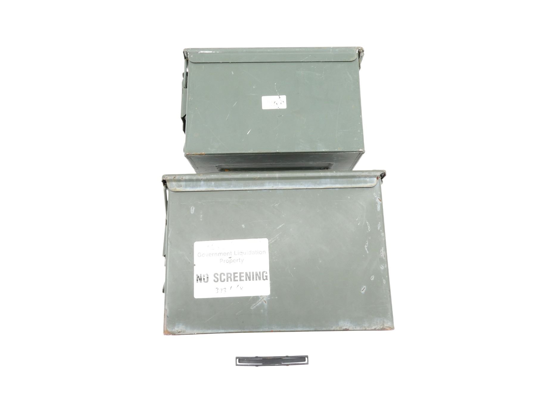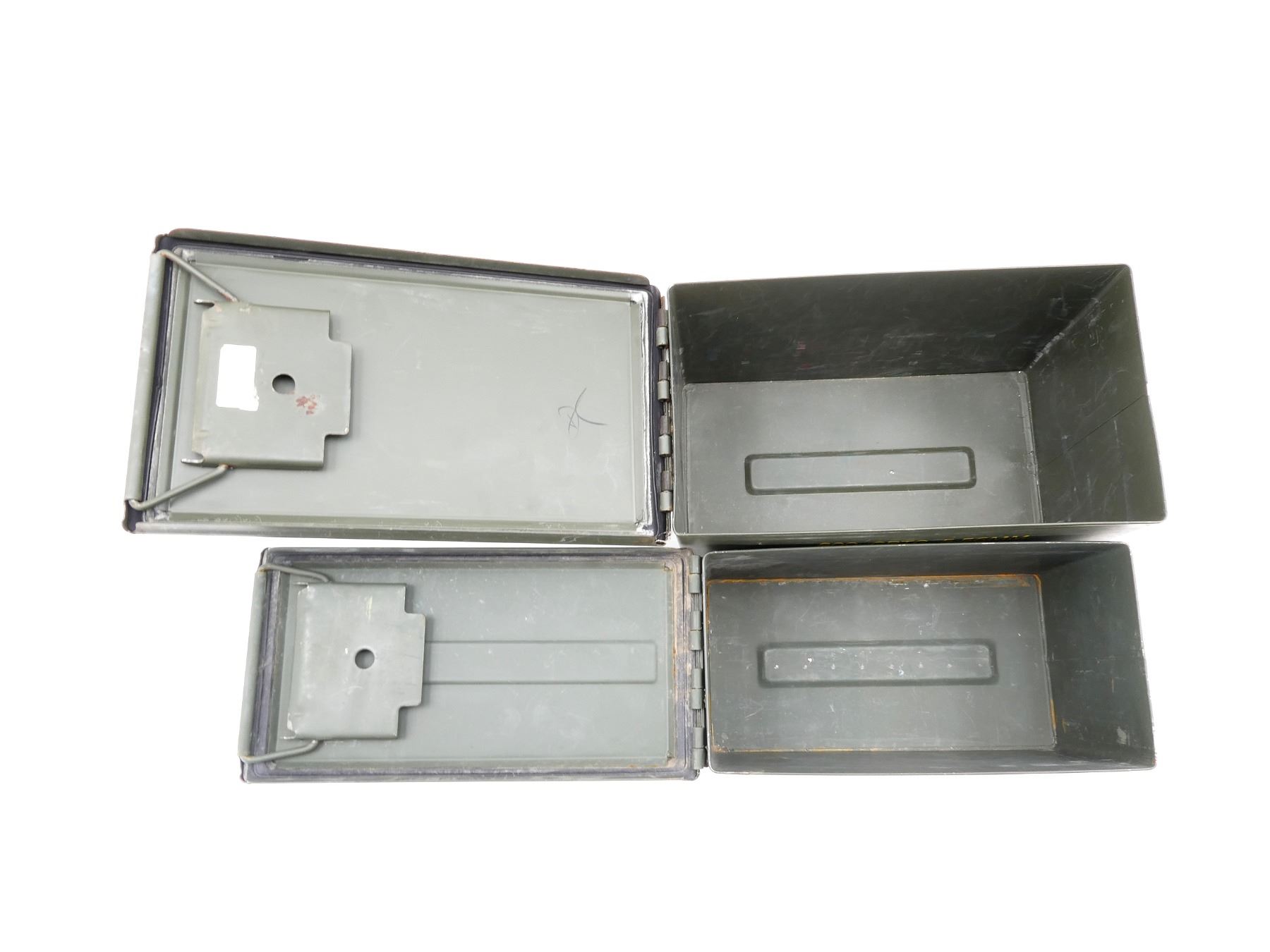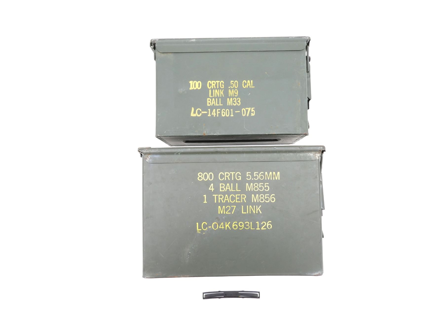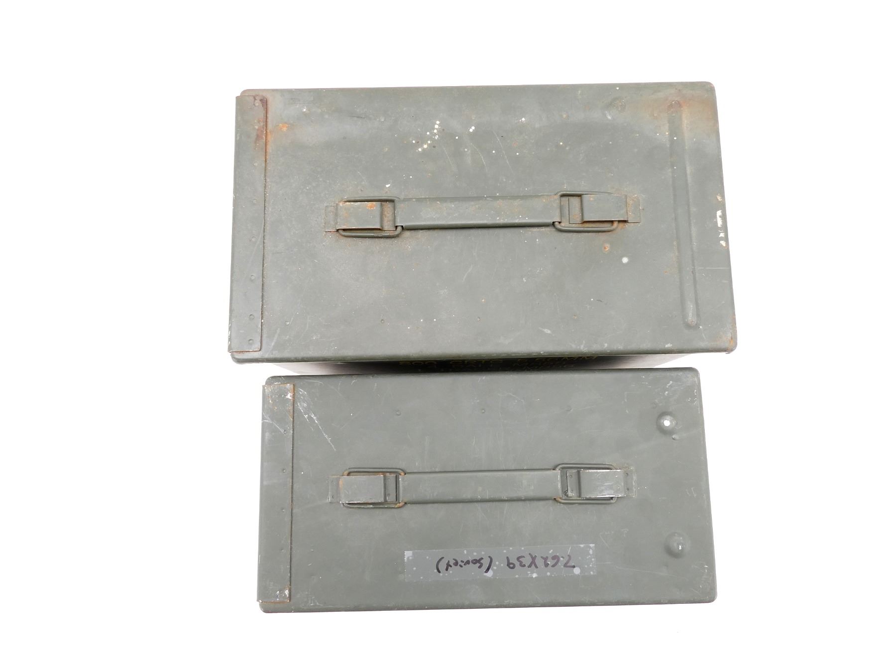 LOT INCLUDES; (2) GREEN PAINTED METAL AMMO TINS, VARIOUS MARKINGS, APPROX. 12.75" X 7.25" X 8.75" & 12" X 6" X 7.25" & (1) CZECH SKS 7.62X39MM, 10-RND STRIPPER CLIP, VARIOUS MARKINGS. SEE PHOTOS.