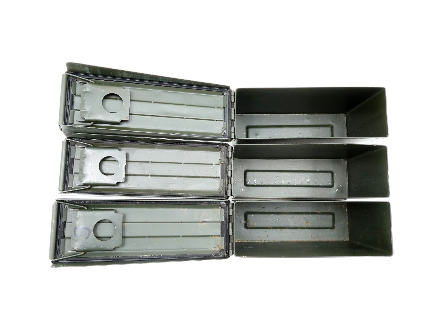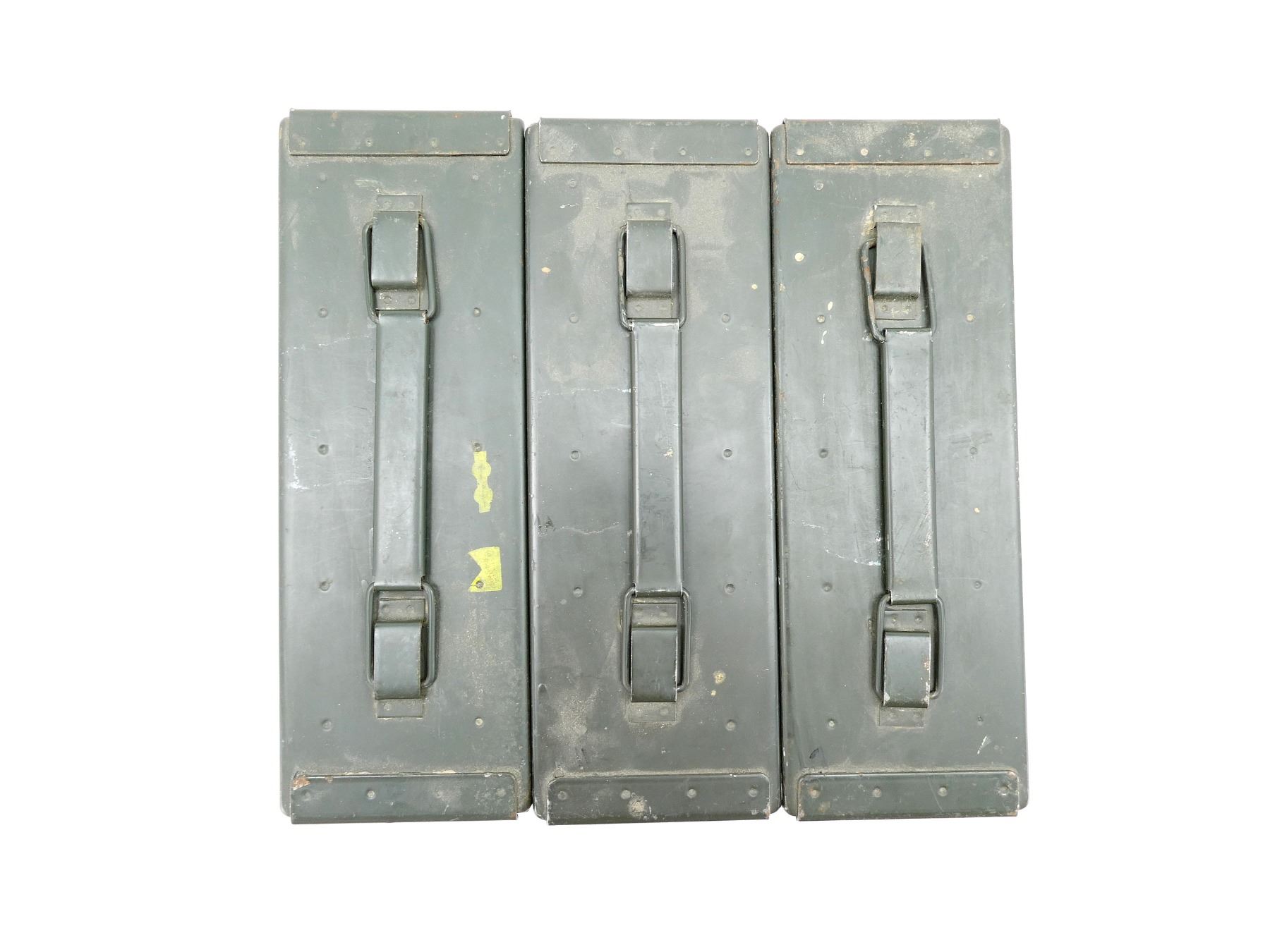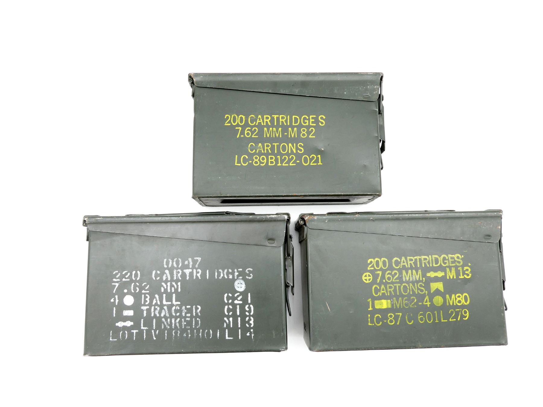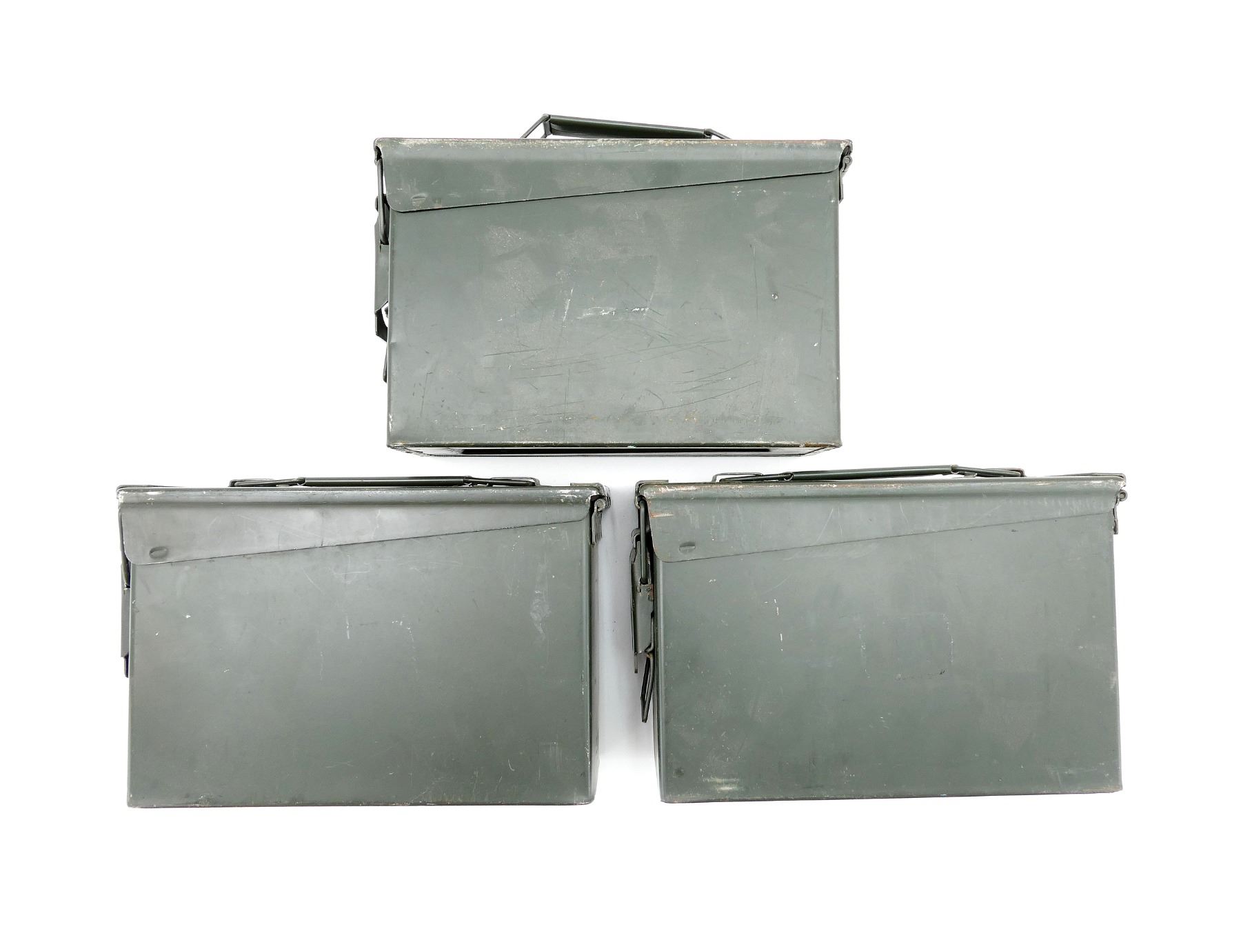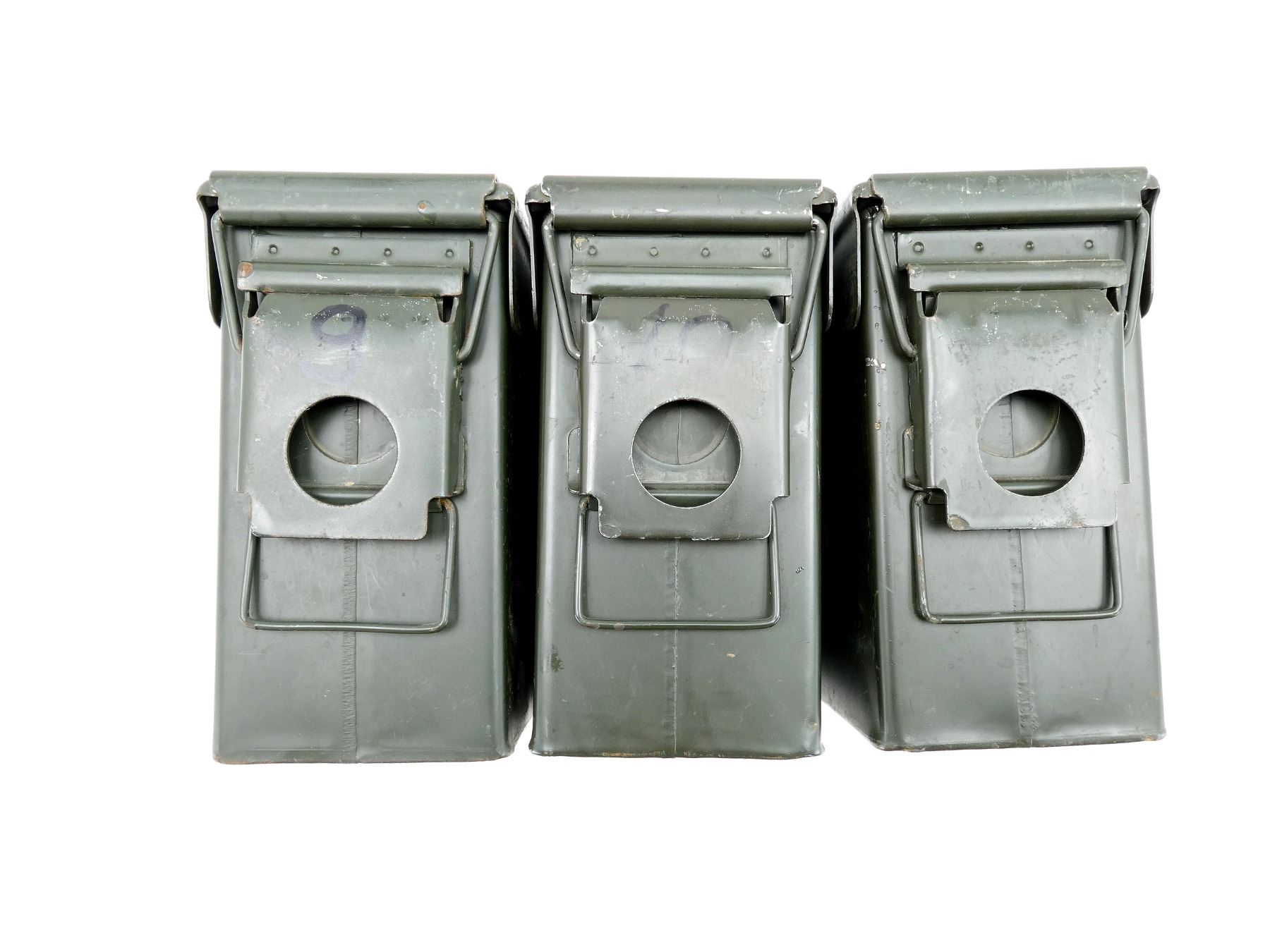 LOT INCLUDES; (3) GREEN PAINTED METAL AMMO TINS, VARIOUS MARKINGS, APPROX. 11" X 4" X 7". SEE PHOTOS.