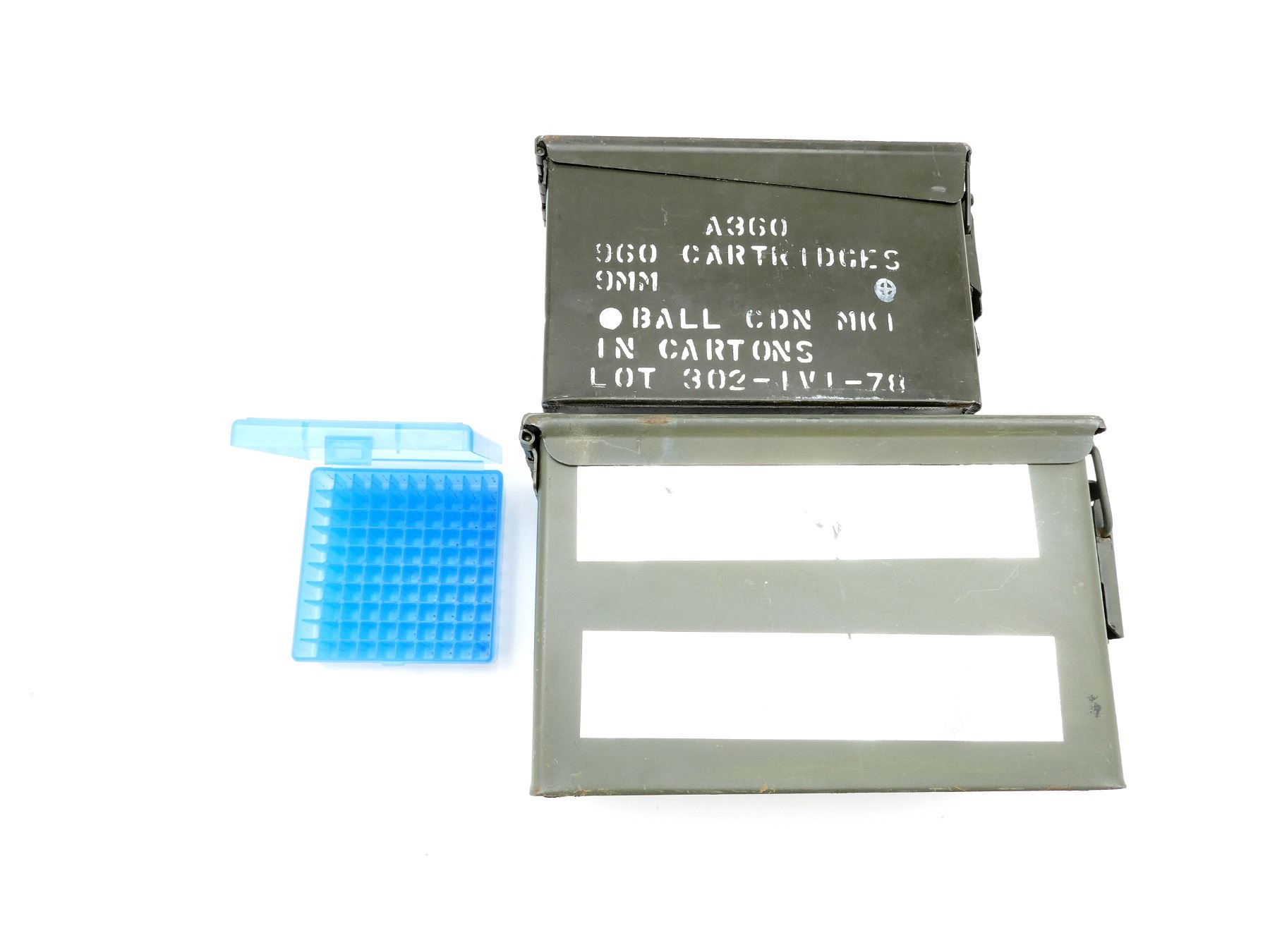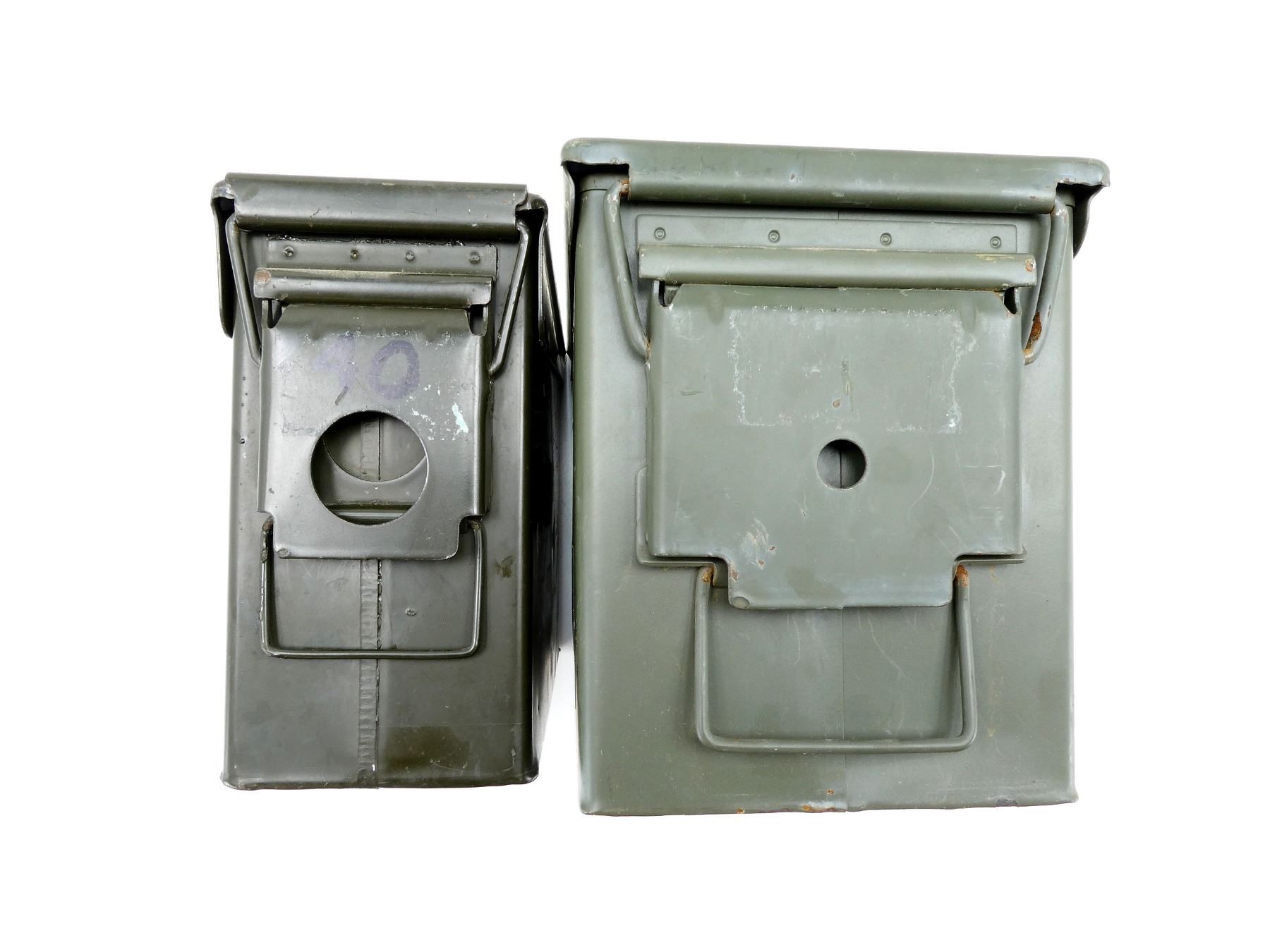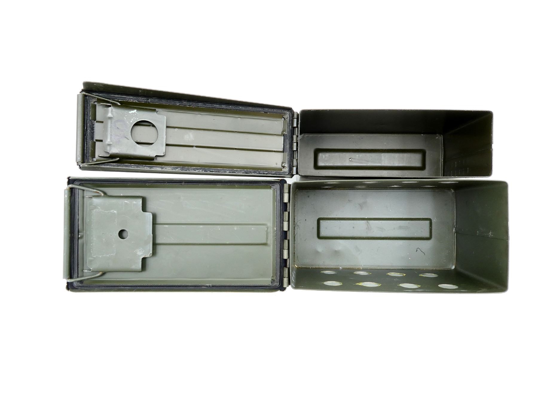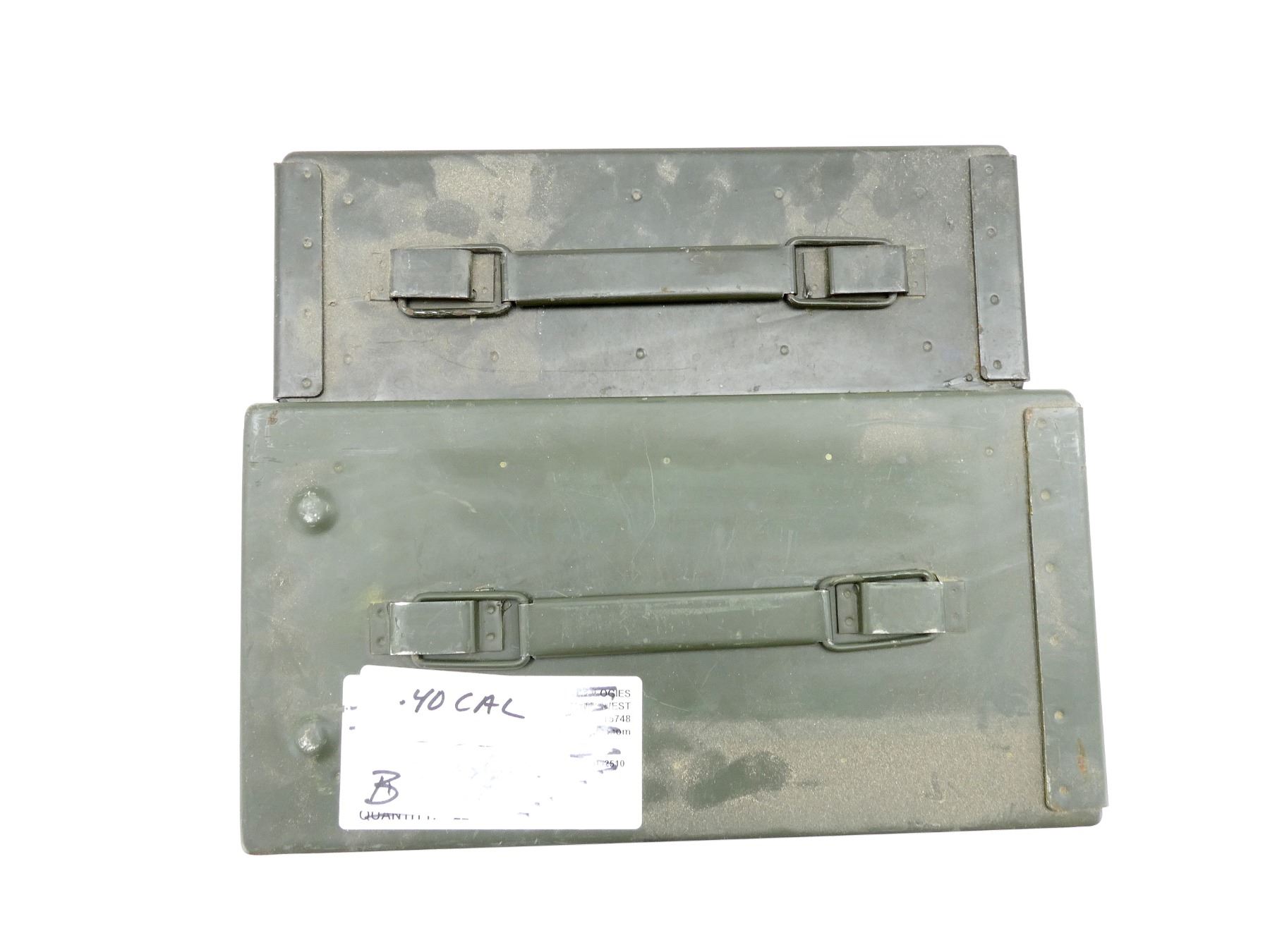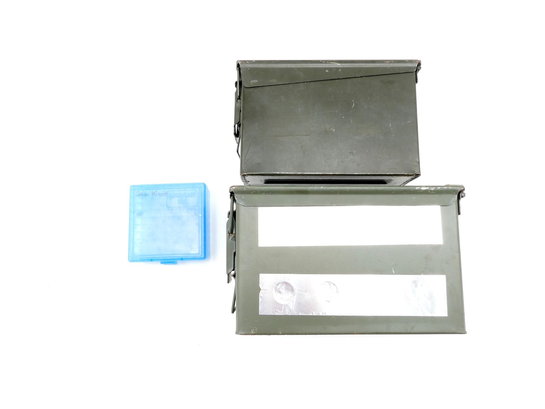 LOT INCLUDES; (1) GREEN PAINTED METAL AMMO TIN, VARIOUS MARKINGS, APPROX. 11" X 4" X 7", (1) GREEN PAINTED METAL AMMO TIN, VARIOUS MARKINGS, APPROX. 12" X 6" X 7.25" & (1) BLUE PLASTIC PISTOL AMMO CONTAINER, FITS .38 / .38 SPCL / 9MM LUGER ETC., HOLDS 100-RNDS, VARIOUS MARKINGS. SEE PHOTOS.