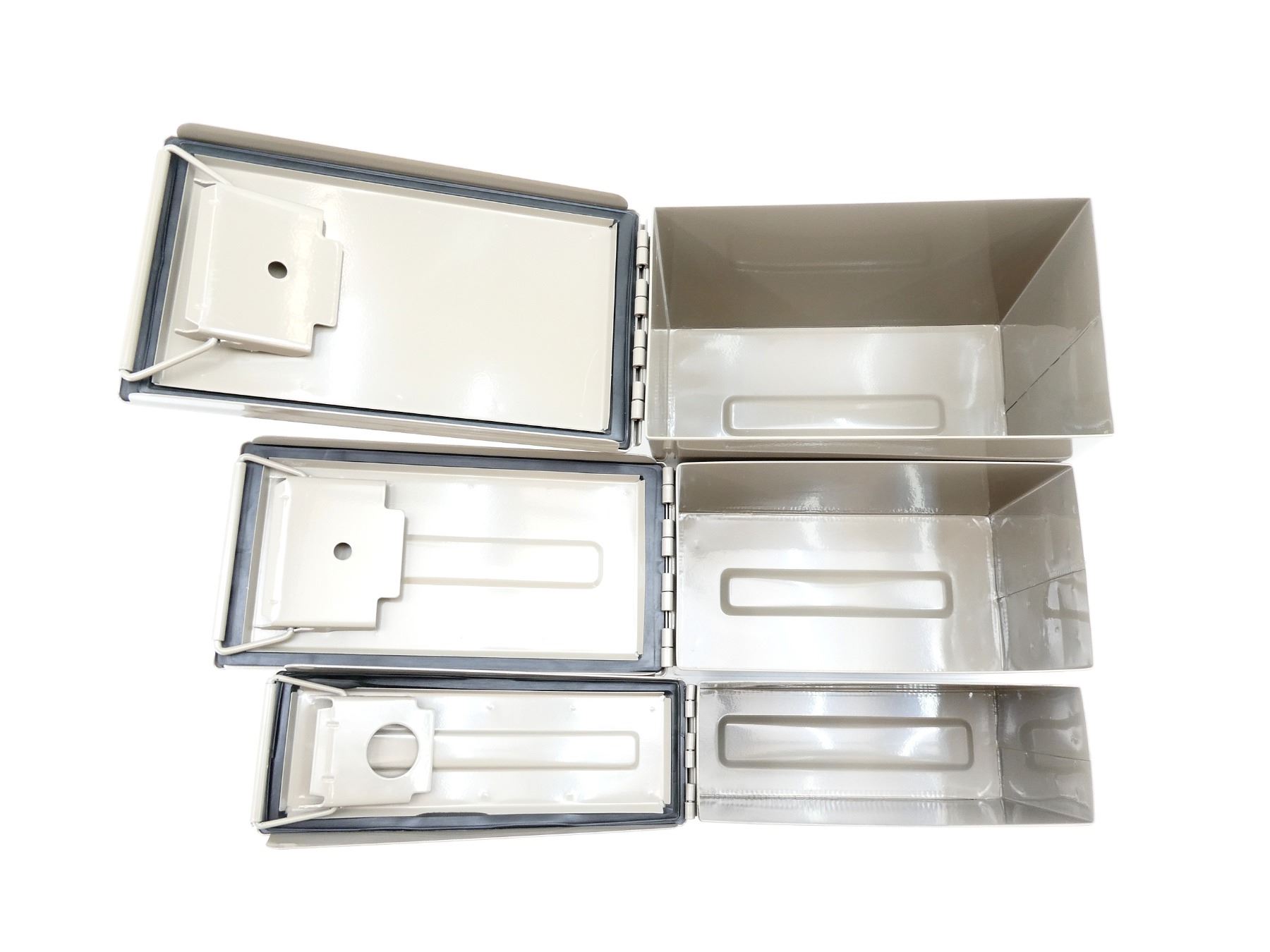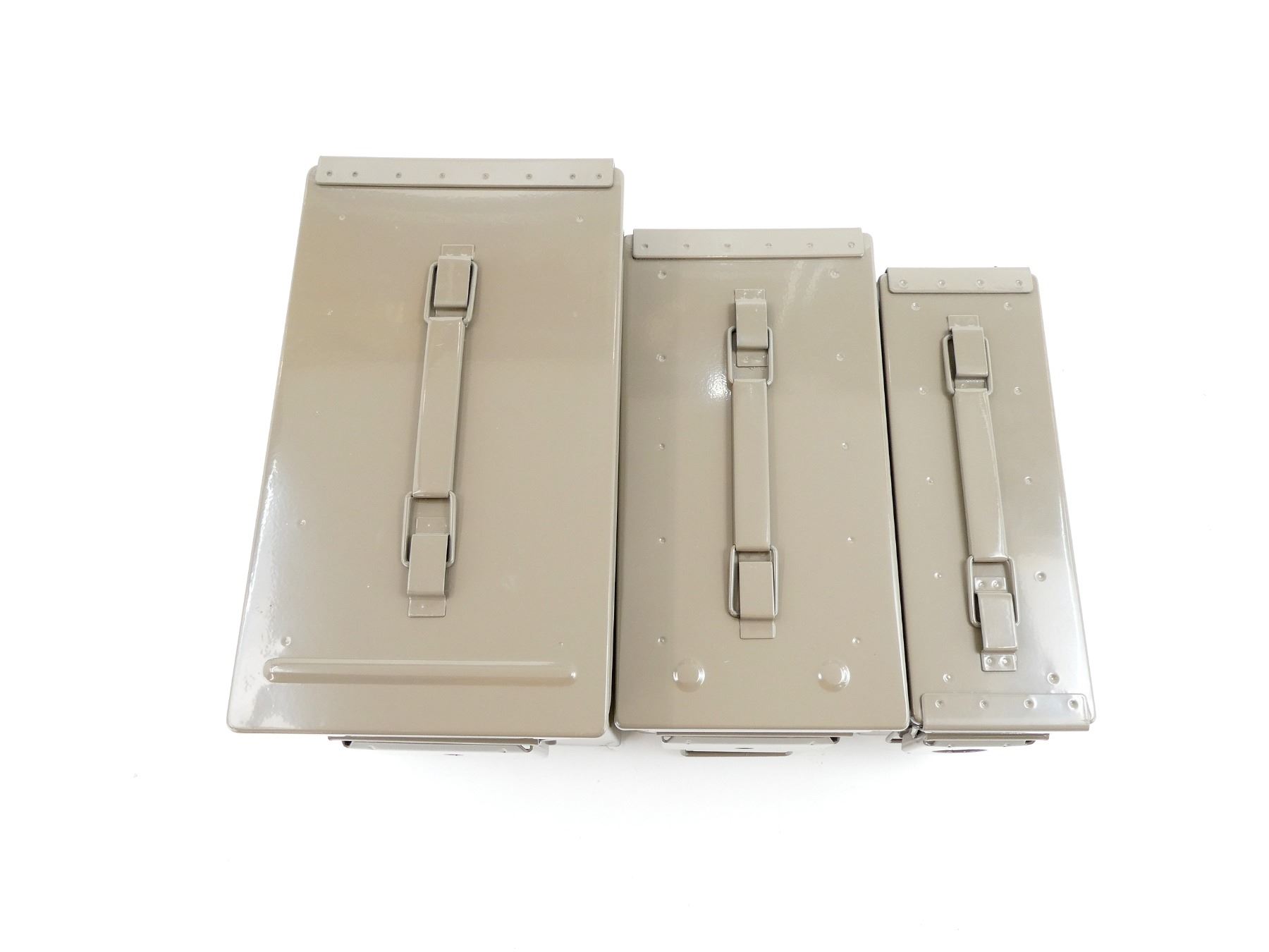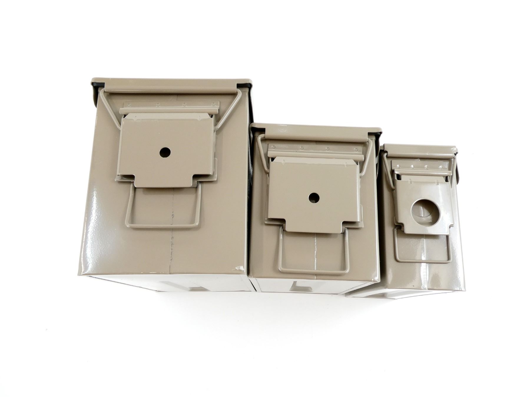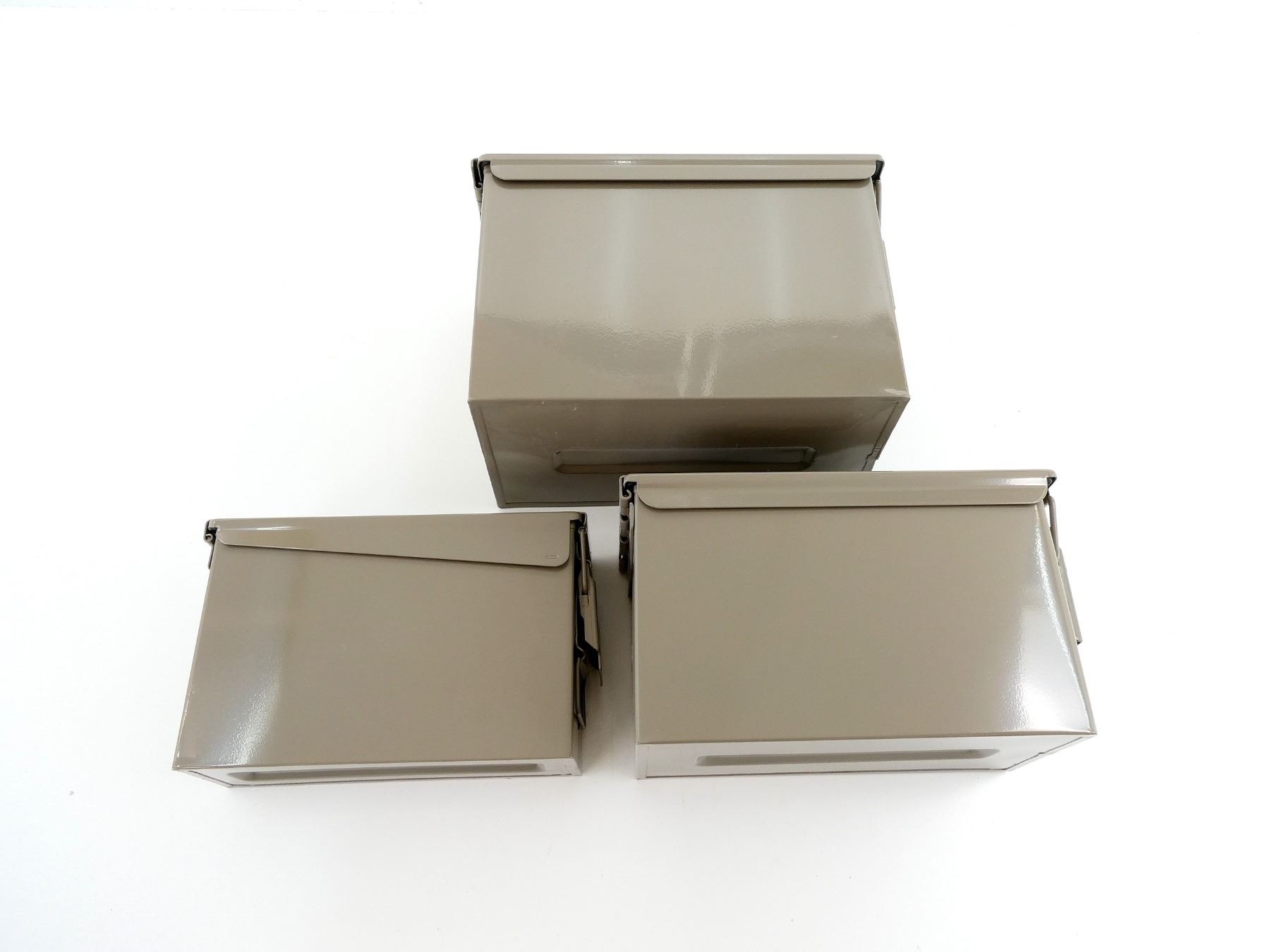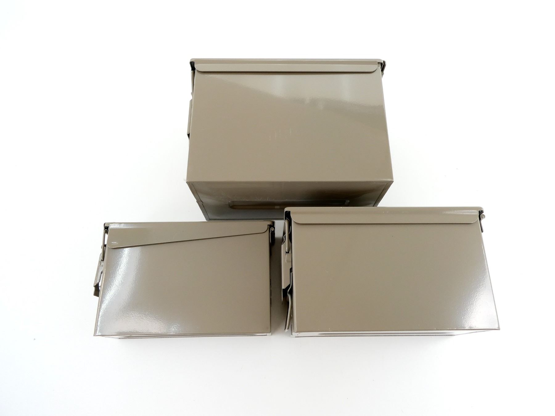 ALL NOS, LOT INCLUDES; (1) GREY PAINTED METAL AMMO TIN, VARIOUS MARKINGS, APPROX. 13" X 7.25" X 8.75", (1) GREY PAINTED METAL AMMO TIN, VARIOUS MARKINGS, APPROX. 11.75" X 6" X 7.5" & (1) GREY PAINTED METAL AMMO TIN, VARIOUS MARKINGS, APPROX. 11" X 3.75" X 6 7/8". SEE PHOTOS.
