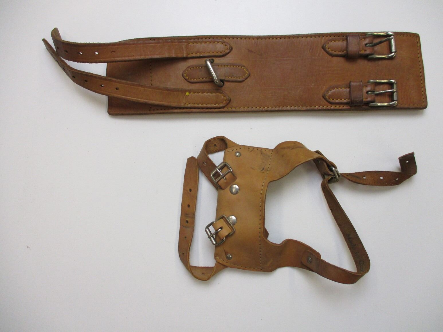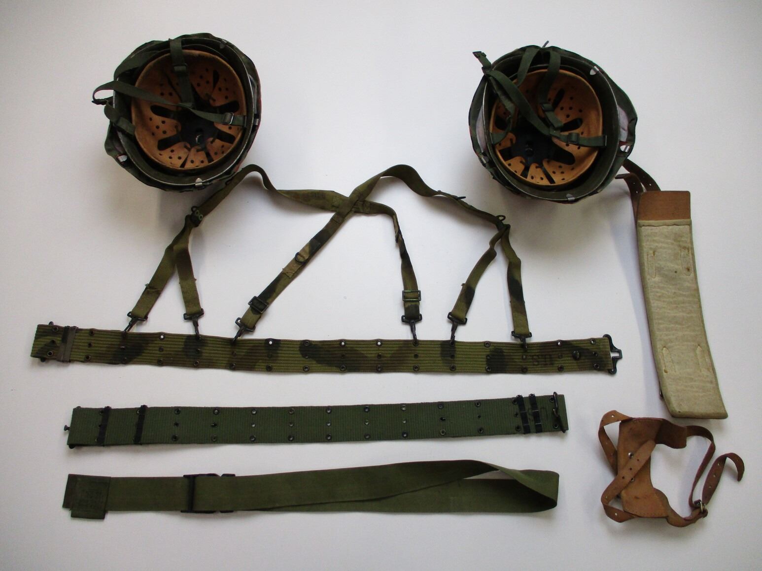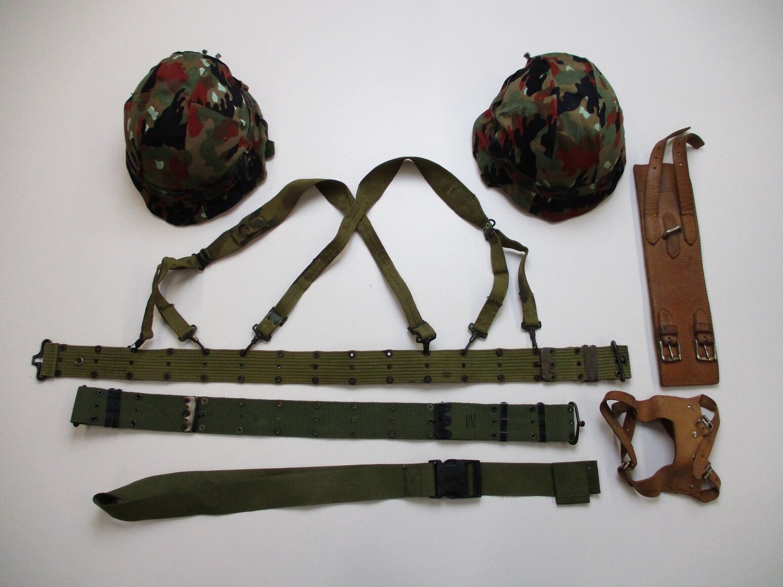 ASSORTED MILITARIA LOT , (2) UNKNOWN EUROPEAN HELMETS, LEATHER LINER, CANVAS CHIN STRAP, MARKED 57-61 ON LINER/HELMET. COMES WITH 2 SWISS MILITARY HELMET COVERS. (5) ASSORTED BELTS/HARNESS' ETC.