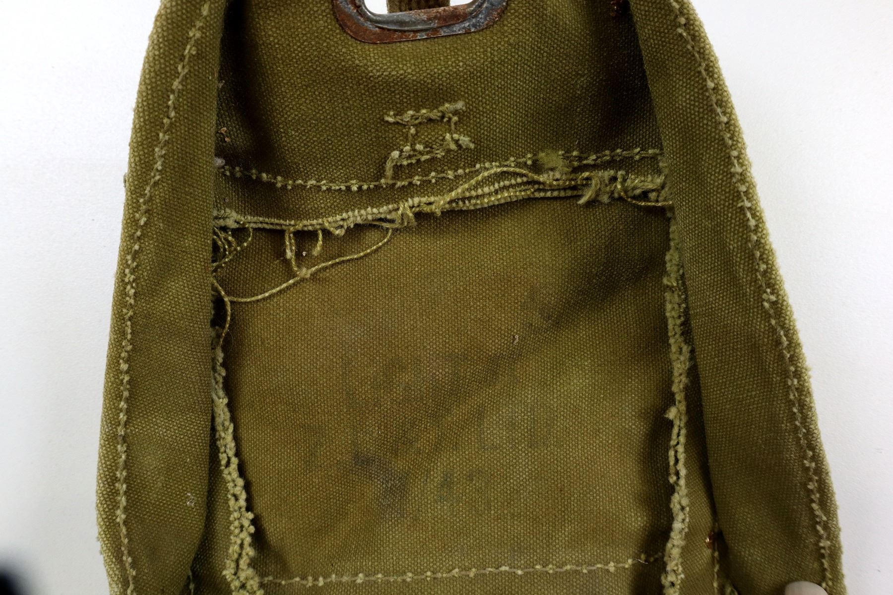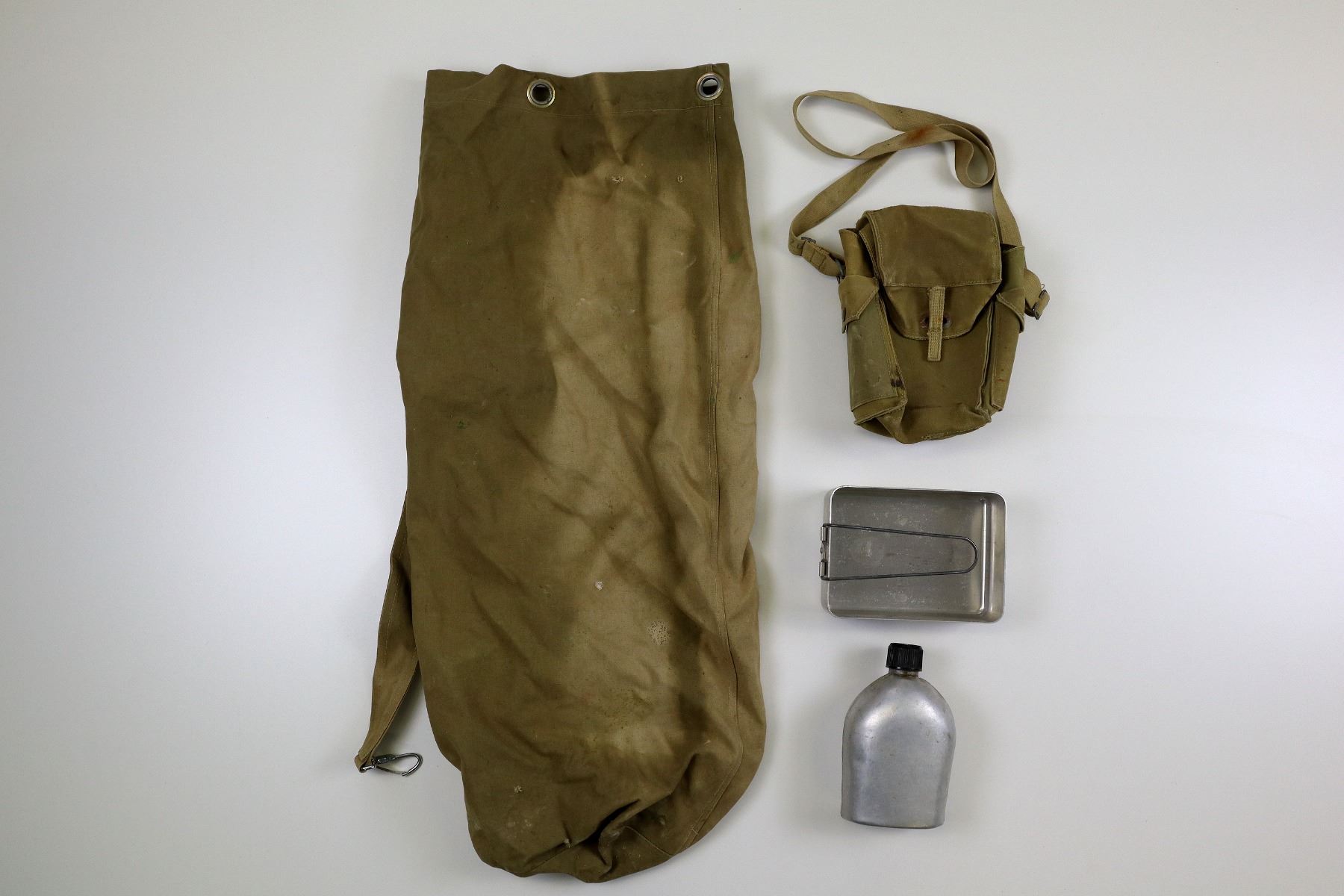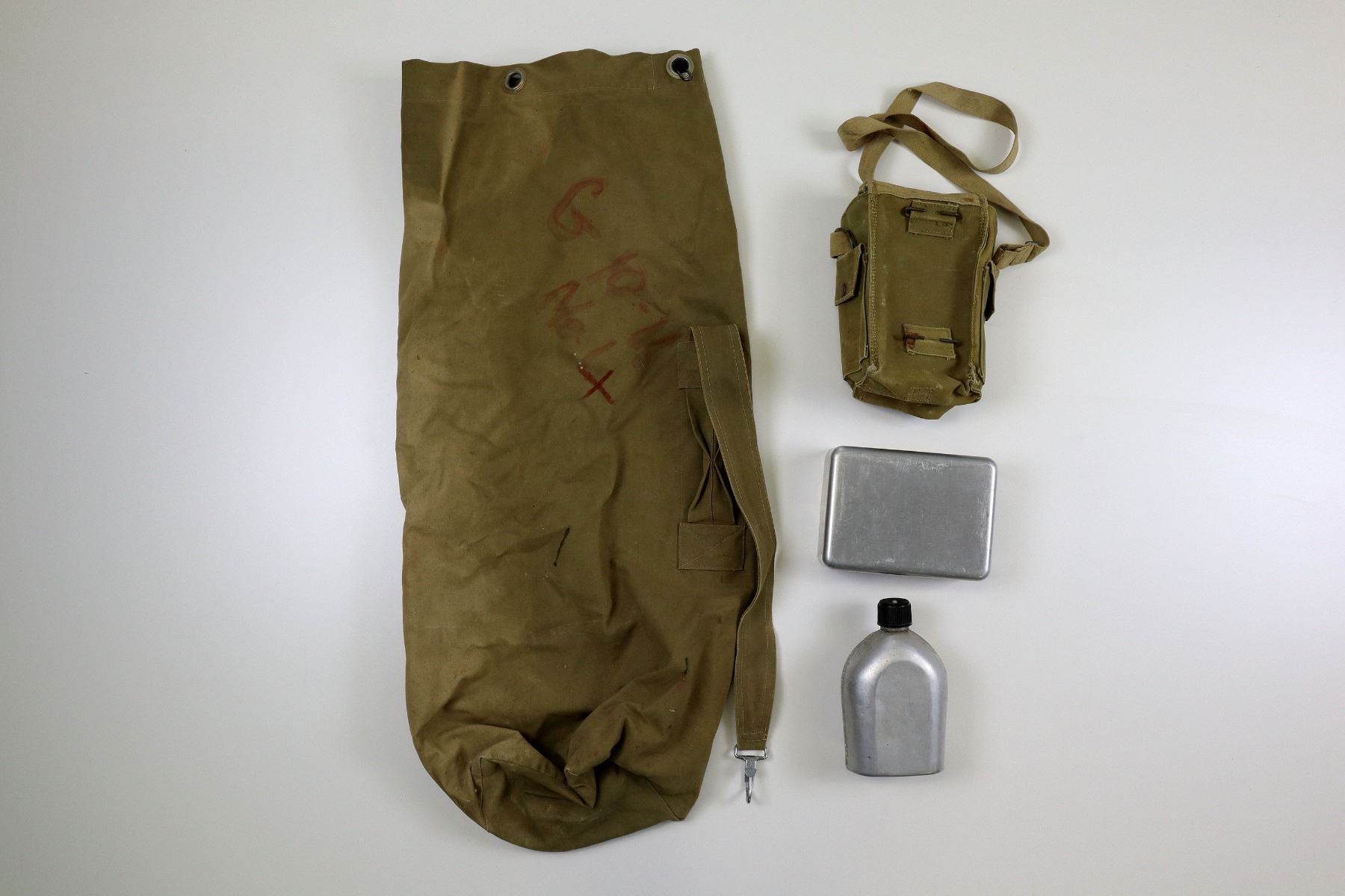 LOT INCLUDES; (1) WWII CANADIAN MILITARY TAN CANVAS POUCH WITH SHOULDER STRAP, FAINTLY MARKED: "LIGHT II, Z.L.&T. LTD., 11/43" WITH C-BROAD ARROW, STRAP MARKED: "LIGHT II Z.L.&T. LTD. 11/43", VARIOUS HAND-WRITTEN MARKINGS, SHOWS AGE / WEAR, (1) UNKNOWN MILITARY TAN CANVAS DUFFLE BAG WITH CARRY HANDLE / STRAP, VARIOUS HAND-WRITTEN MARKINGS, SHOWS AGE / WEAR / TEAR, OAL APPROX. 35", (1) CANADIAN ALUMINUM MESS TIN WITH STEEL FOLDING HANDLE, MARKED: "WEAR-EVER, ALUMINUM, TRADE MARK, MADE IN CANADA", APPROX. 7.25" X 5.25" X 2 3/8" & (1) ALUMINUM CANTEEN WITH SCREW ON CAP MARKED: "TAIWAN". SEE PHOTOS.