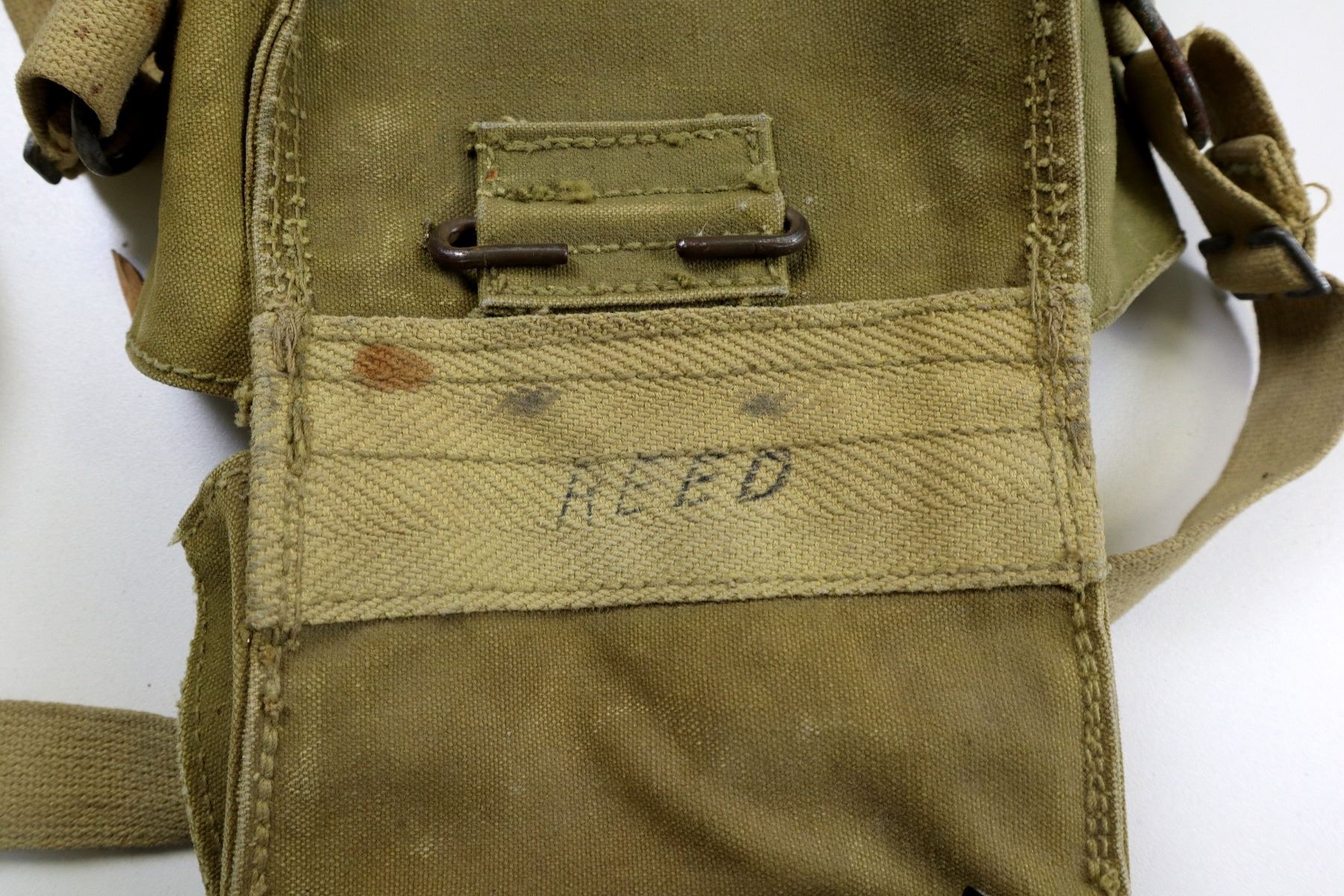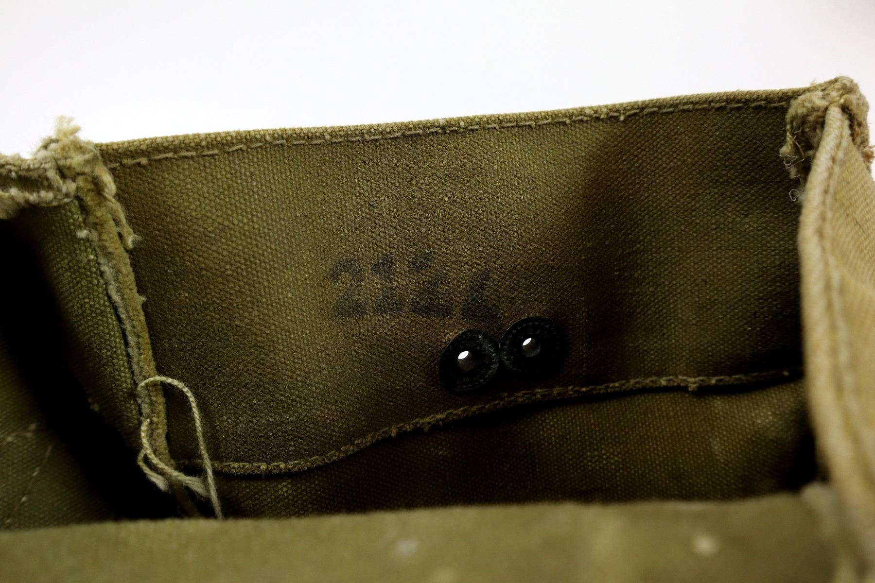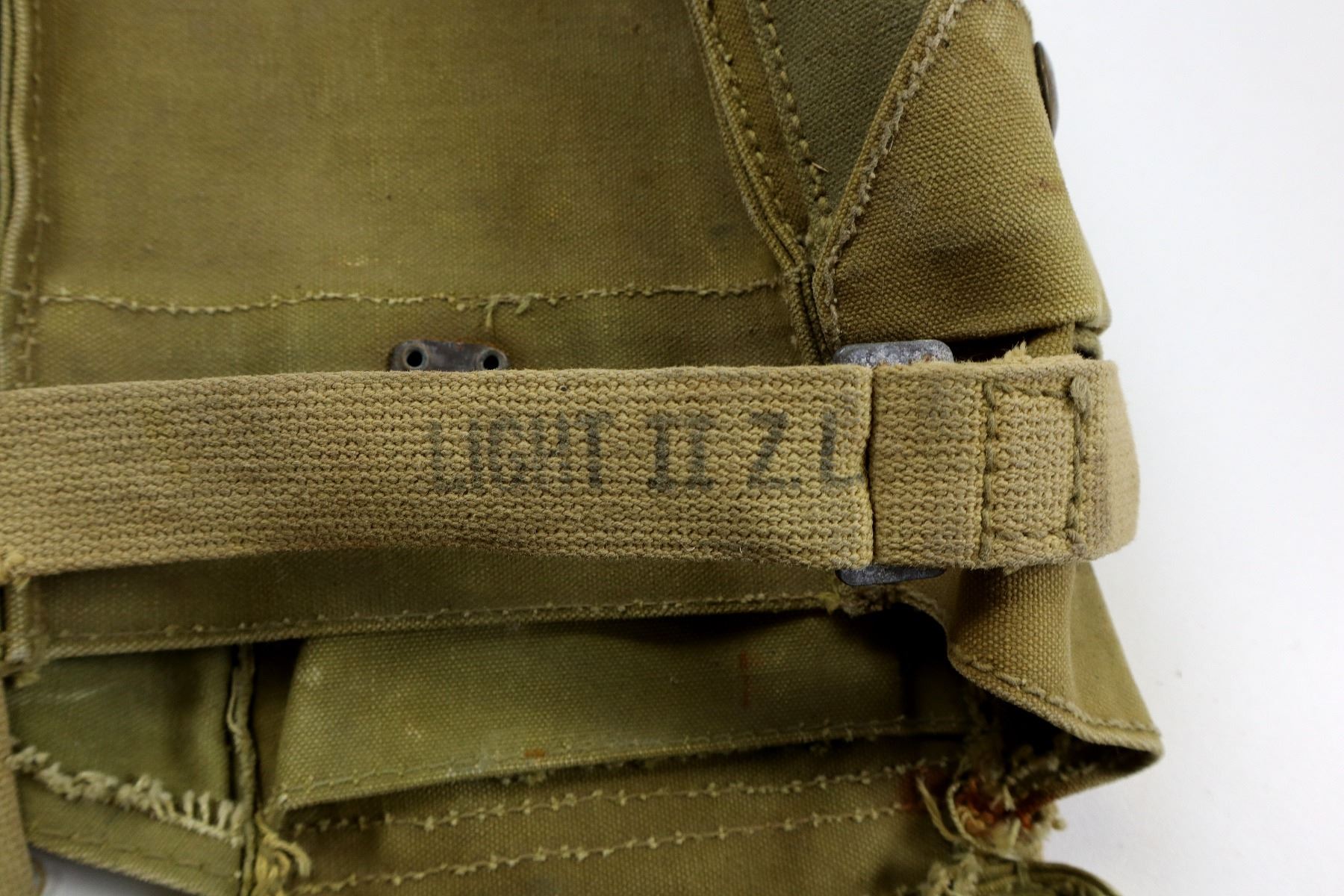LOT INCLUDES; (1) WWII CANADIAN MILITARY TAN CANVAS POUCH WITH SHOULDER STRAP, FAINTLY MARKED: "LIGHT II, Z.L.&T. LTD., 11/43" WITH C-BROAD ARROW, STRAP MARKED: "LIGHT II Z.L.&T. LTD. 11/43", VARIOUS HAND-WRITTEN MARKINGS, SHOWS AGE / WEAR, (1) UNKNOWN MILITARY TAN CANVAS DUFFLE BAG WITH CARRY HANDLE / STRAP, VARIOUS HAND-WRITTEN MARKINGS, SHOWS AGE / WEAR / TEAR, OAL APPROX. 35", (1) CANADIAN ALUMINUM MESS TIN WITH STEEL FOLDING HANDLE, MARKED: "WEAR-EVER, ALUMINUM, TRADE MARK, MADE IN CANADA", APPROX. 7.25" X 5.25" X 2 3/8" & (1) ALUMINUM CANTEEN WITH SCREW ON CAP MARKED: "TAIWAN". SEE PHOTOS.