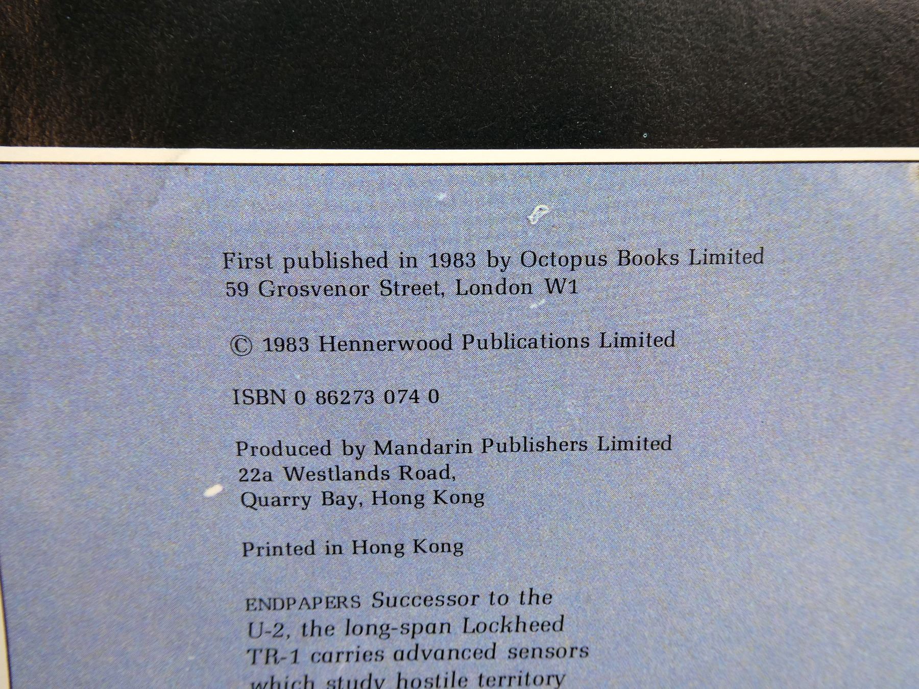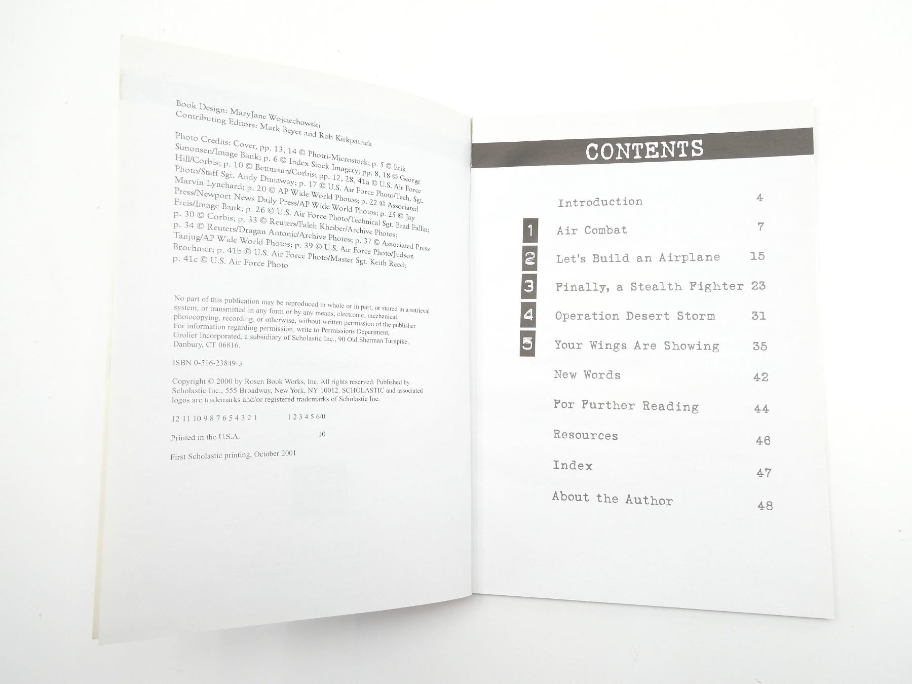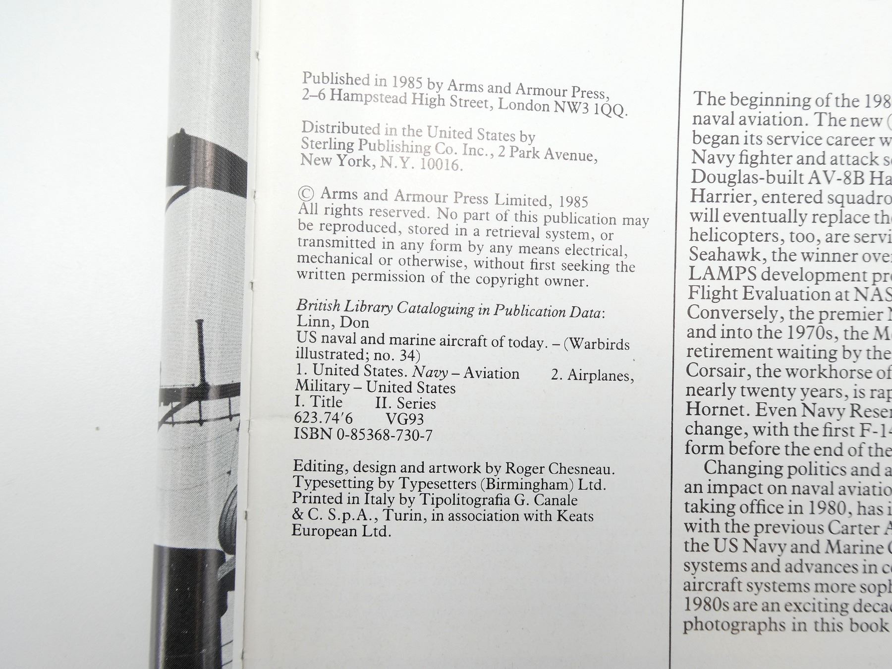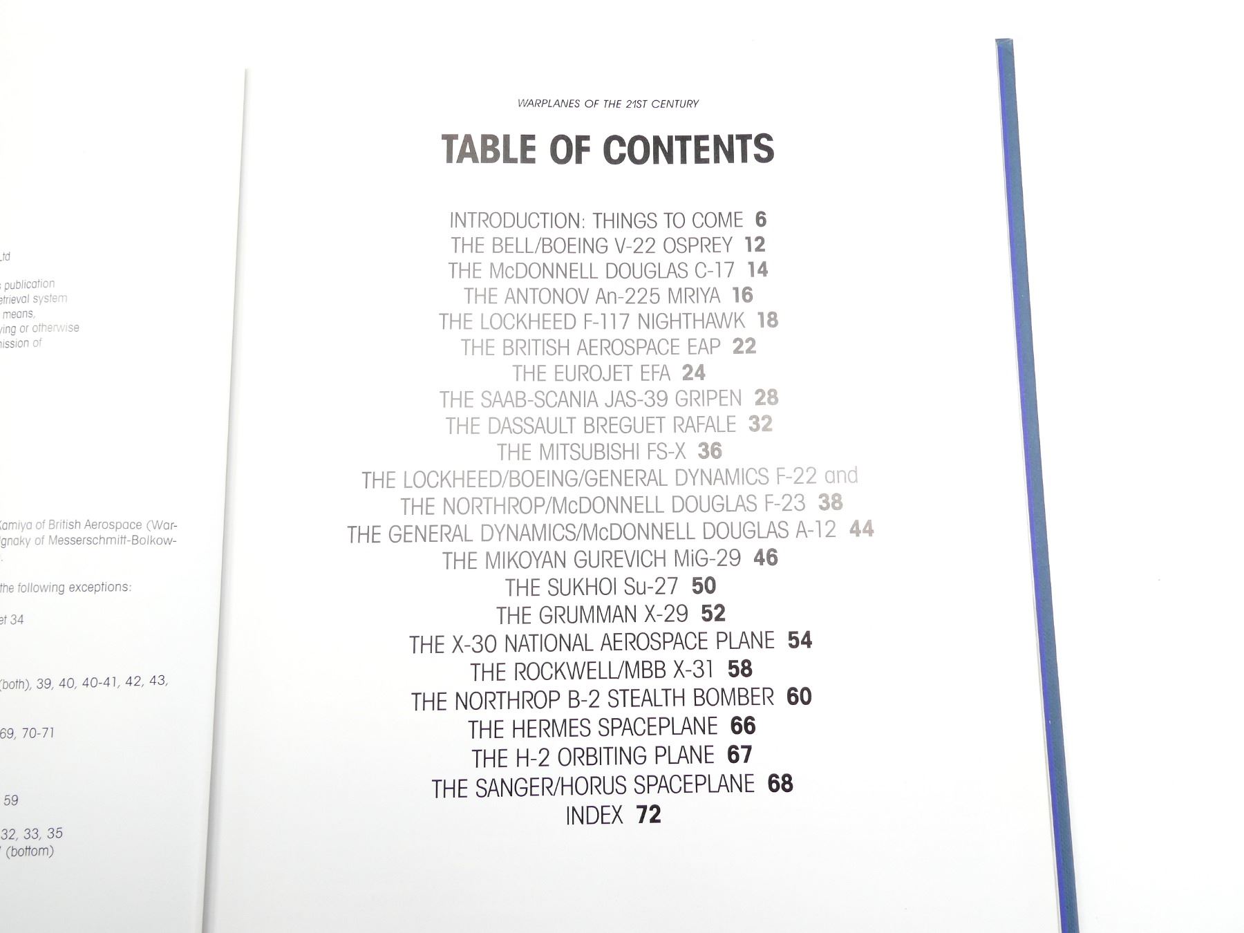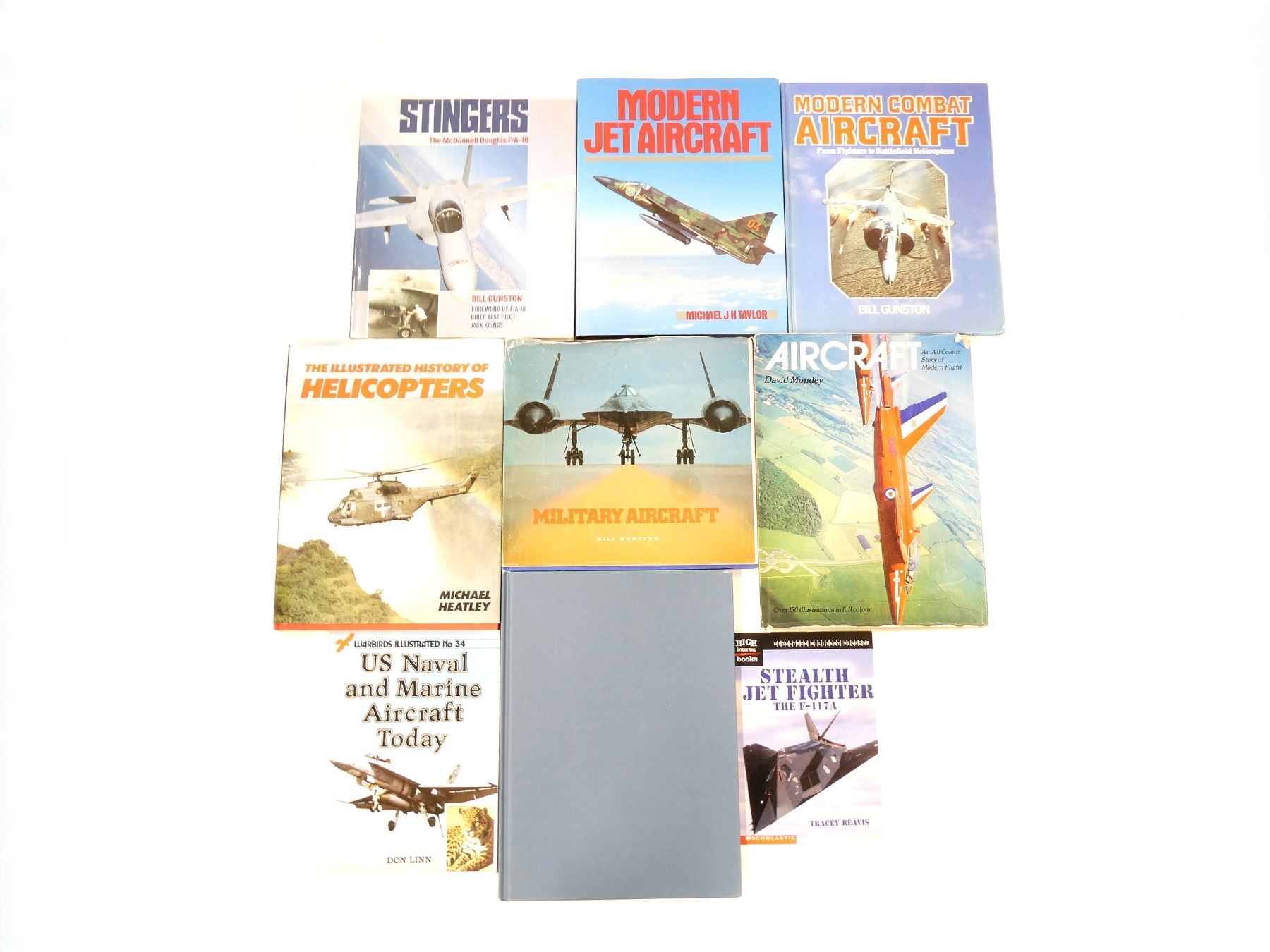 LOT INCLUDES; (1) "WARPLANES OF THE 21ST CENTURY" BOOK BY BILL YENNE, HARD COVER, ISBN: 0-88665-827-6, (1) "STINGERS, THE MCDONNELL DOUGLAS F/A-18" BOOK BY BILL GUNSTON, HARD COVER WITH DUST , ISBN: 0-600-56826-1, (1) "MODERN COMBAT AIRCRAFT, FROM FIGHTERS TO BATTLEFIELD HELICOPTERS" BOOK BY BILL GUNSTON, HARD COVER, ISBN: 0-86273-074-0, (1) "AIRCRAFT, AN ALL COLOUR STORY OF MODERN FLIGHT" BOOK BY DAVID MONDEY, HARD COVER WITH DUST COVER, ISBN: 0-7064-0271-5, (1) "MODERN JET AIRCRAFT" BOOK BY MICHAEL J. H. TAYLOR, HARD COVER WITH DUST COVER, ISBN: 0-86124-170-3, (1) "THE ILLUSTRATED HISTORY OF HELICOPTERS" BOOK BY MICHAEL HEATLEY, HARD COVER WITH DUST COVER, ISBN: 0-86124-232-7, (1) "MILITARY AIRCRAFT" BOOK BY BILL GUNSTON, HARD COVER WITH DUST COVER, ISBN: 0-49-5303-6, (1) "WARBIRDS ILLUSTRATED NO. 34, US NAVAL AND MARINE AIRCRAFT TODAY" BOOK BY DON LINN, SOFT COVER, ISBN: 0-85368-730-7 & (1) "STEALTH JET FIGHTER THE F-117A" BOOK BY TRACEY REAVIS, SOFT COVER, ISBN: 0-516-23849-3. SEE PHOTOS.