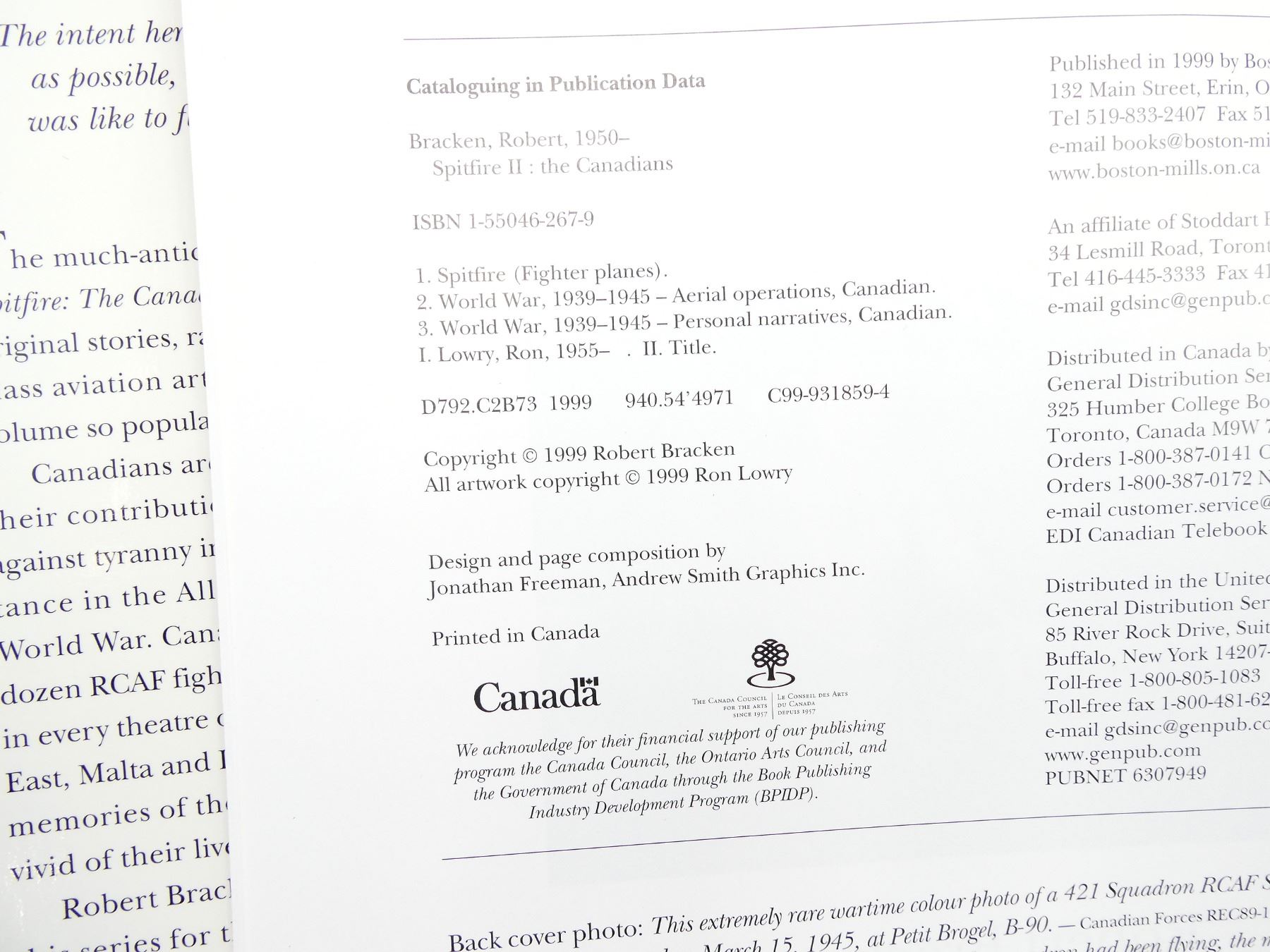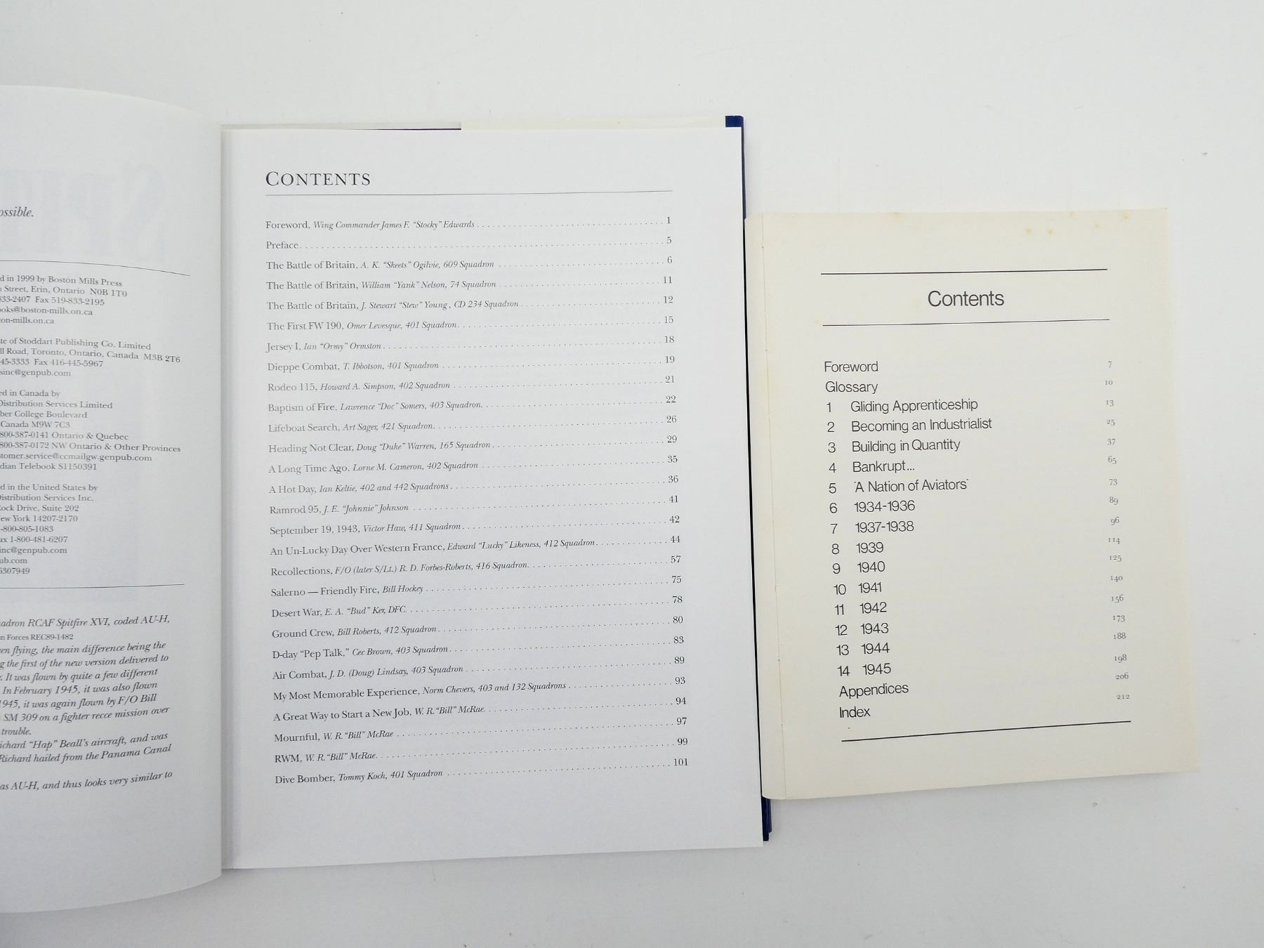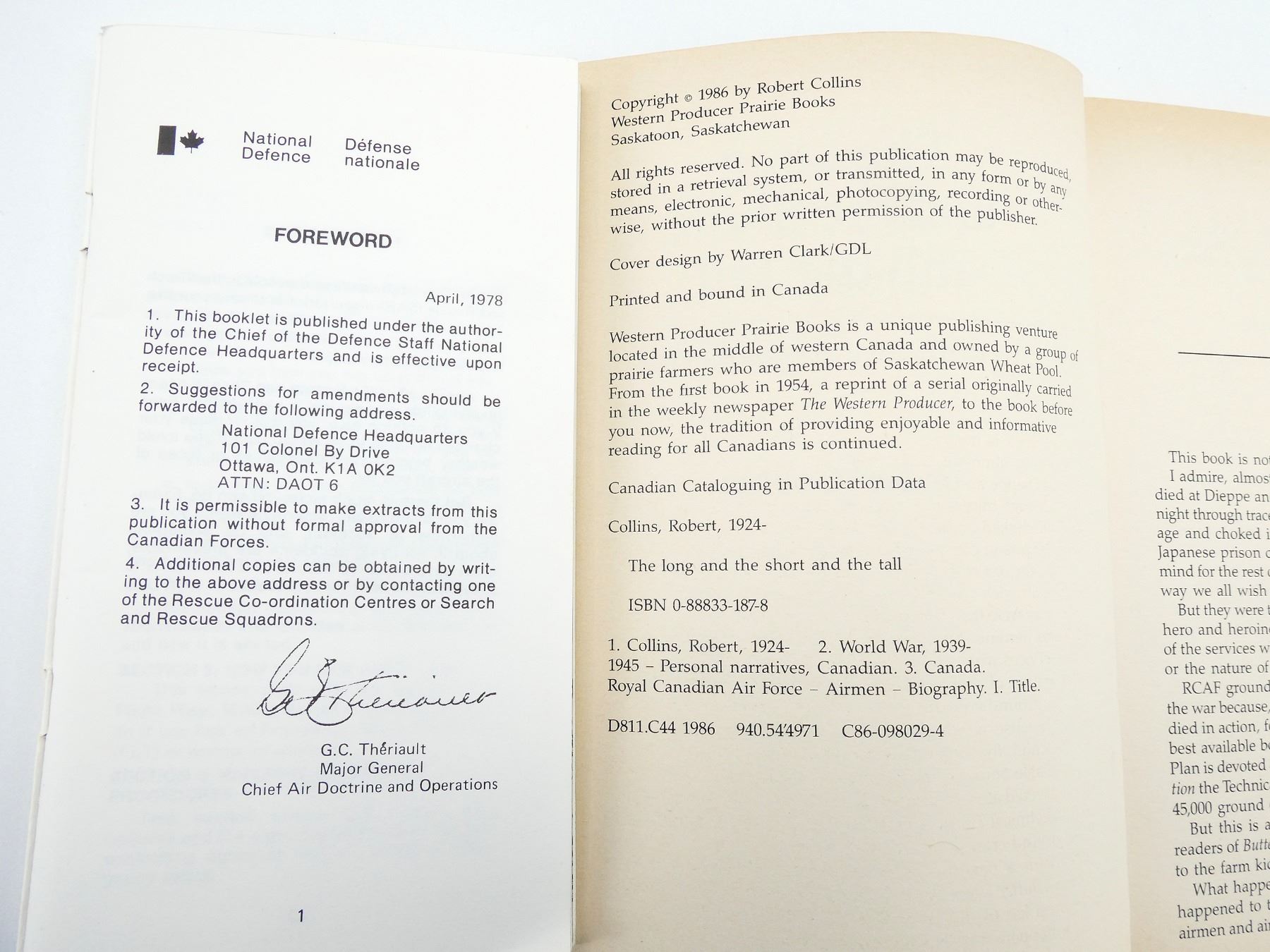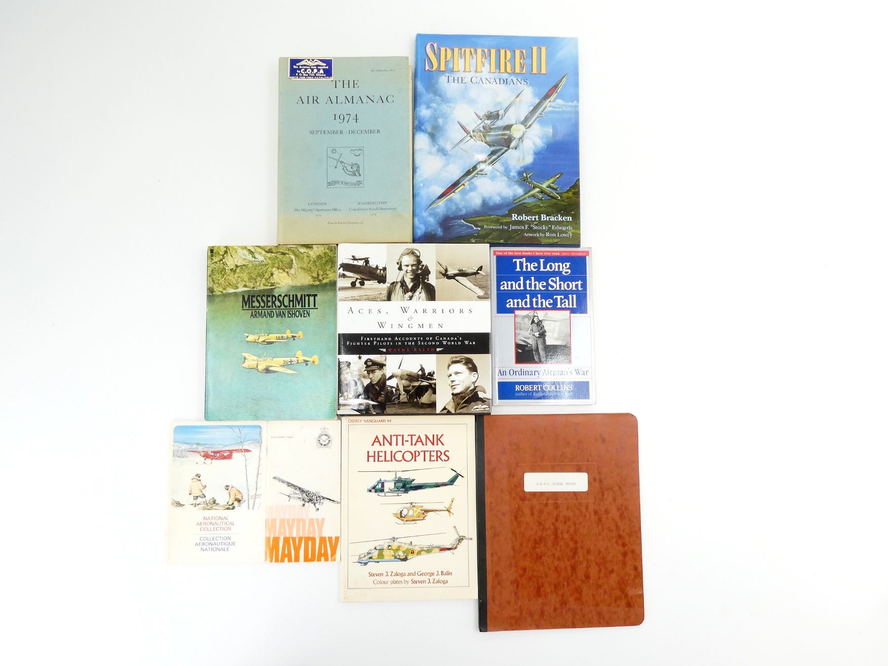 LOT INCLUDES; (1) "ACES, WARRIORS & WINGMEN, FIRSTHAND ACCOUNTS OF CANADA'S FIGHTER PILOTS IN THE SECOND WORLD WAR" BOOK BY WAYNE RALPH, HARD COVER WITH DUST COVER, ISBN: 0-470-83590-7, (1) "ANTI-TANK HELICOPTERS" BOOK BY STEVEN J. ZALOGA & GEORGE J. BALIN, SOFT COVER, ISBN: 0-85045-697-5, (1) "MESSERSCHMITT" BOOK BY ARMAND VAN ISHOVEN, SOFT COVER, ISBN: 0-9044-42047, (1) "THE LONG AND THE SHORT AND THE TALL" BOOK BY ROBERT COLLINS, SOFT COVER, ISBN: 0-88833-291-2, (1) "SPITFIRE II, THE CANADIANS" BOOK BY ROBERT BRACKEN, HARD COVER WITH DUST COVER, ISBN: 1-55046-267-9, (1) "A.N.E.C. MISSEL THRUSH" ARTICLE PUBLISHED 1979, (1) "NATIONAL AERONAUTICAL COLLECTION" BOOK, SOFT COVER, IN ENGLISH/FRENCH, (1) "THE AIR ALMANAC 1974, SEPTEMBER-DECEMBER" BOOK PUBLISHED BY HER MAJESTY'S STATIONERY OFFICE, COPYRIGHT 1974 & (1) "MAYDAY, MAYDAY, MAYDAY" BOOK PUBLISHED BY NATIONAL DEFENCE HEADQUARTERS 1978. SEE PHOTOS.