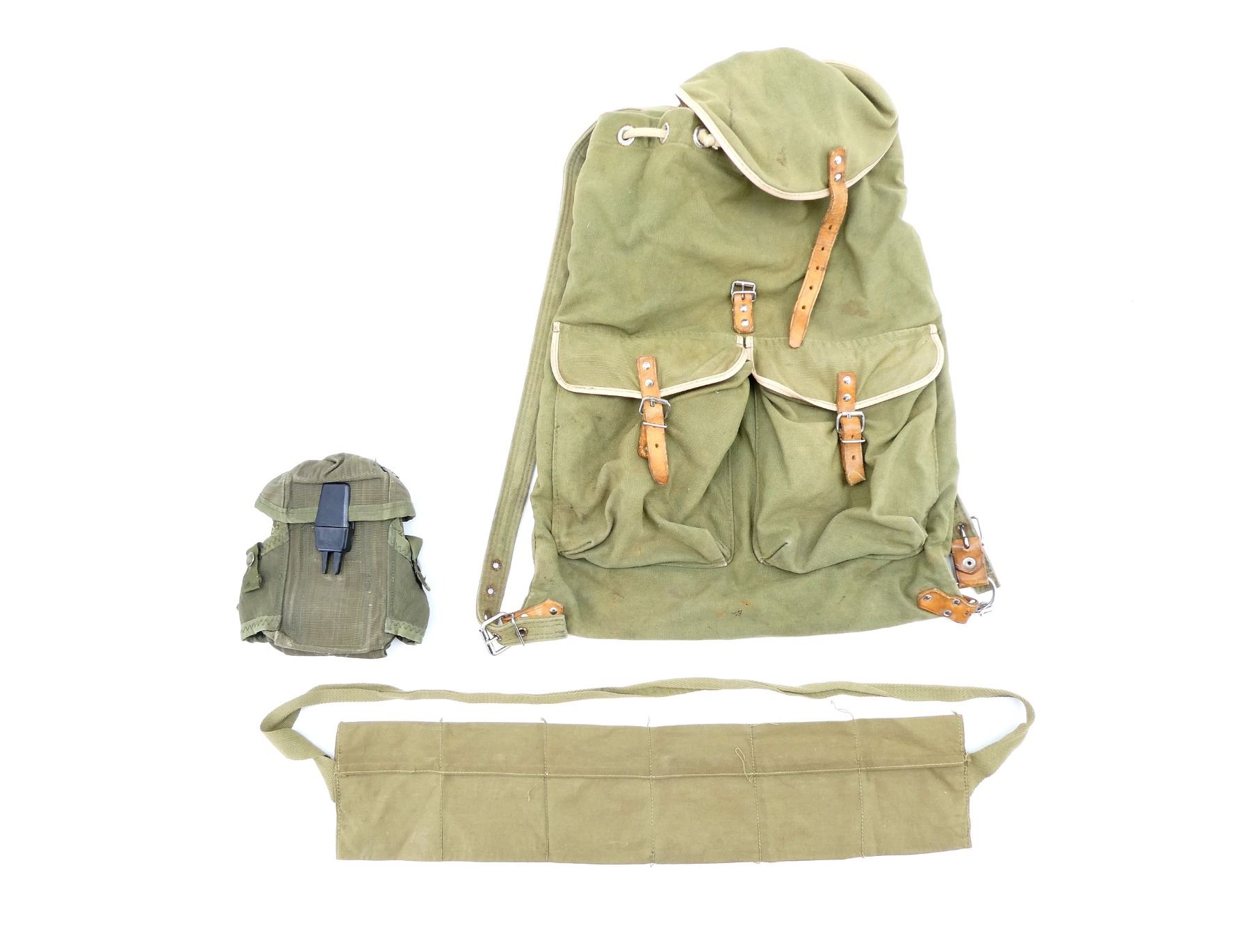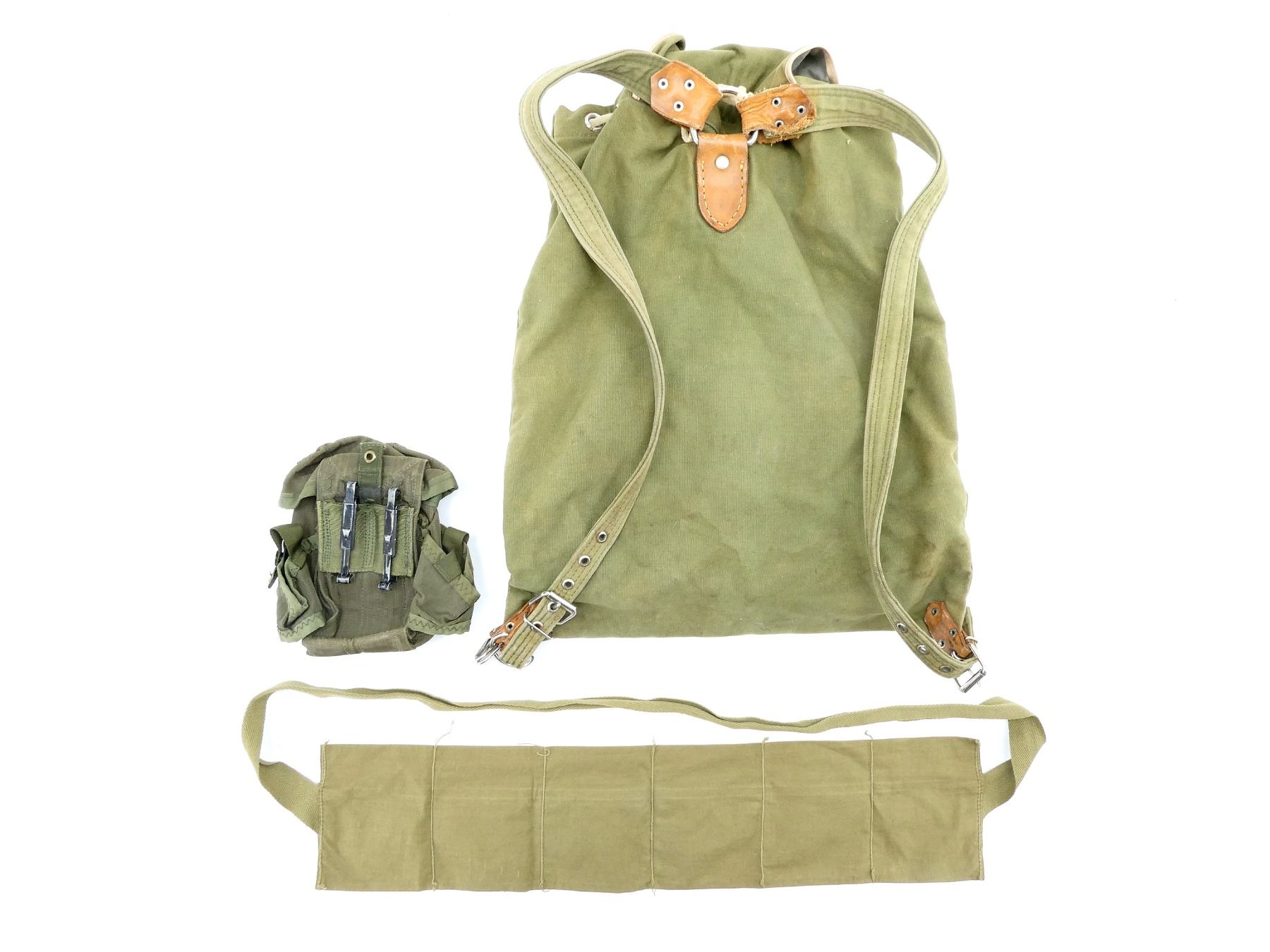 LOT INCLUDES; (1) CZECH MILITARY STYLE BACKPACK, GREEN CANVAS & LEATHER, MARKED: "MADE IN CZECHOSLOVAKIA", 3-POCKETS, VARIOUS METAL FITTINGS, SHOULDER STRAPS, DRAWSTRING CLOSURE, (1) U.S. MILITARY GREEN NYLON AMMO POUCH, FAINTLY MARKED: "US", BELT HOOKS & (1) GREEN CLOTH BANDOLIER, NO VISIBLE MARKINGS, 6-POCKETS WITH STRAP, OAL APPROX. 22". SEE PHOTOS.