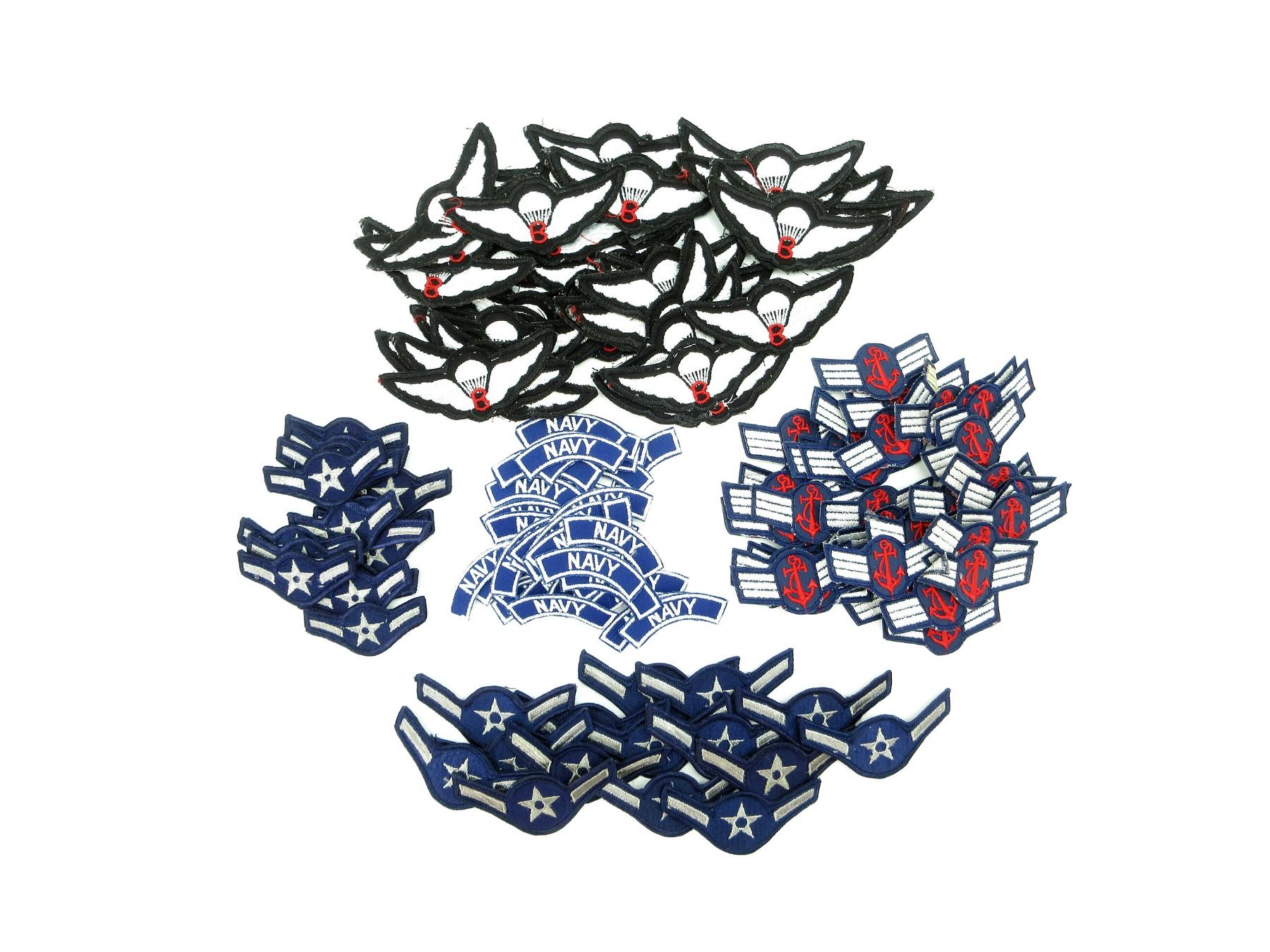APPROX. (160) BADGES, VARIOUS COLOURS, INCLUDING; MILITARY STYLE PARATROOPER EMBROIDERED BADGE, U.S. AIR FORCE RANK BADGES XL SIZE, U.S. AIR FORCE RANK BADGES LARGE SIZE, U.S. NAVY BADGES & MILITARY STYLE NAVY ANCHOR BADGES. SEE PHOTOS.