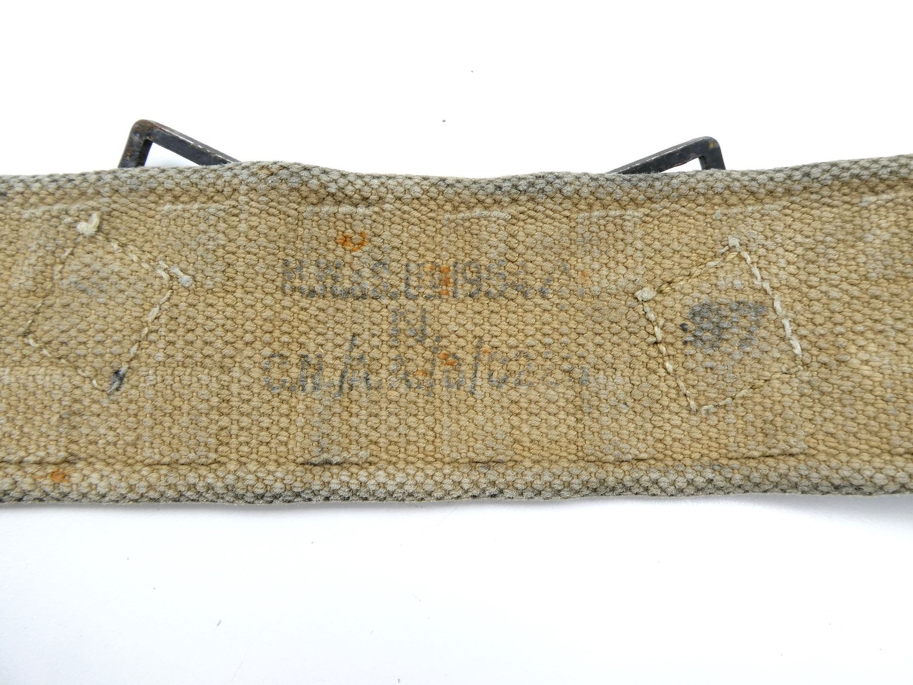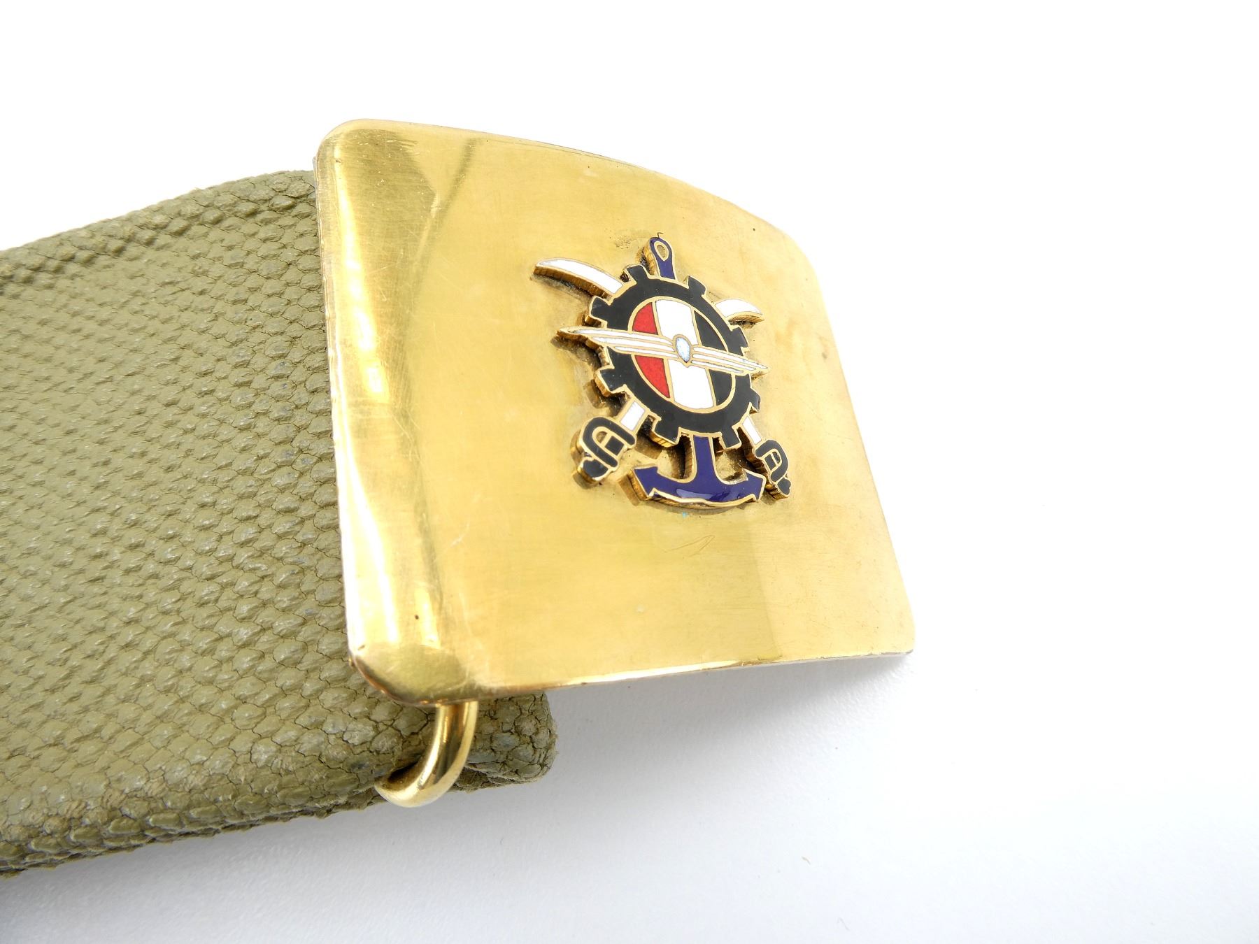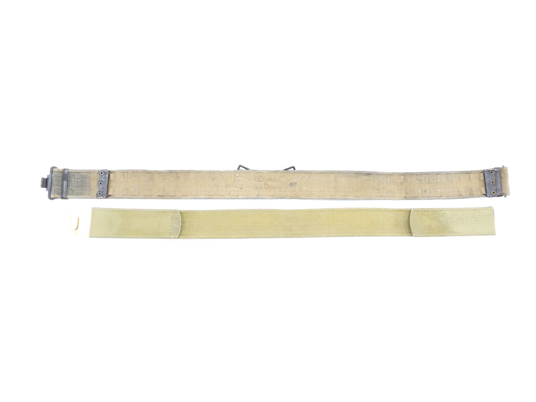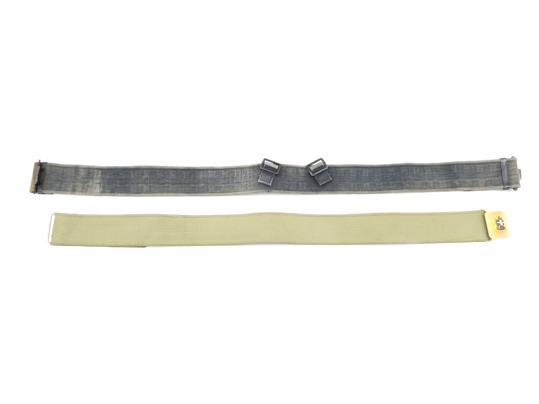 LOT INCLUDES; (1) BRITISH MILITARY BLACKENED TAN P37 WEB BELT, FAINTLY MARKED: "M.W.&S. LTD 1954" WITH BROAD ARROW & VARIOUS OTHER FAINT / UN-CLEAR MARKINGS, STEEL FITTINGS, SHOWS AGE / WEAR, OAL APPROX. 35.5", ADJUSTABLE & (1) EGYPTIAN NAVY WEB BELT WITH NAVAL BELT BUCKLE, GREEN PAINTED BELT, BACK OF BUCKLE HAS EGYPTIAN WRITING, OAL APPROX. 45". SEE PHOTOS.