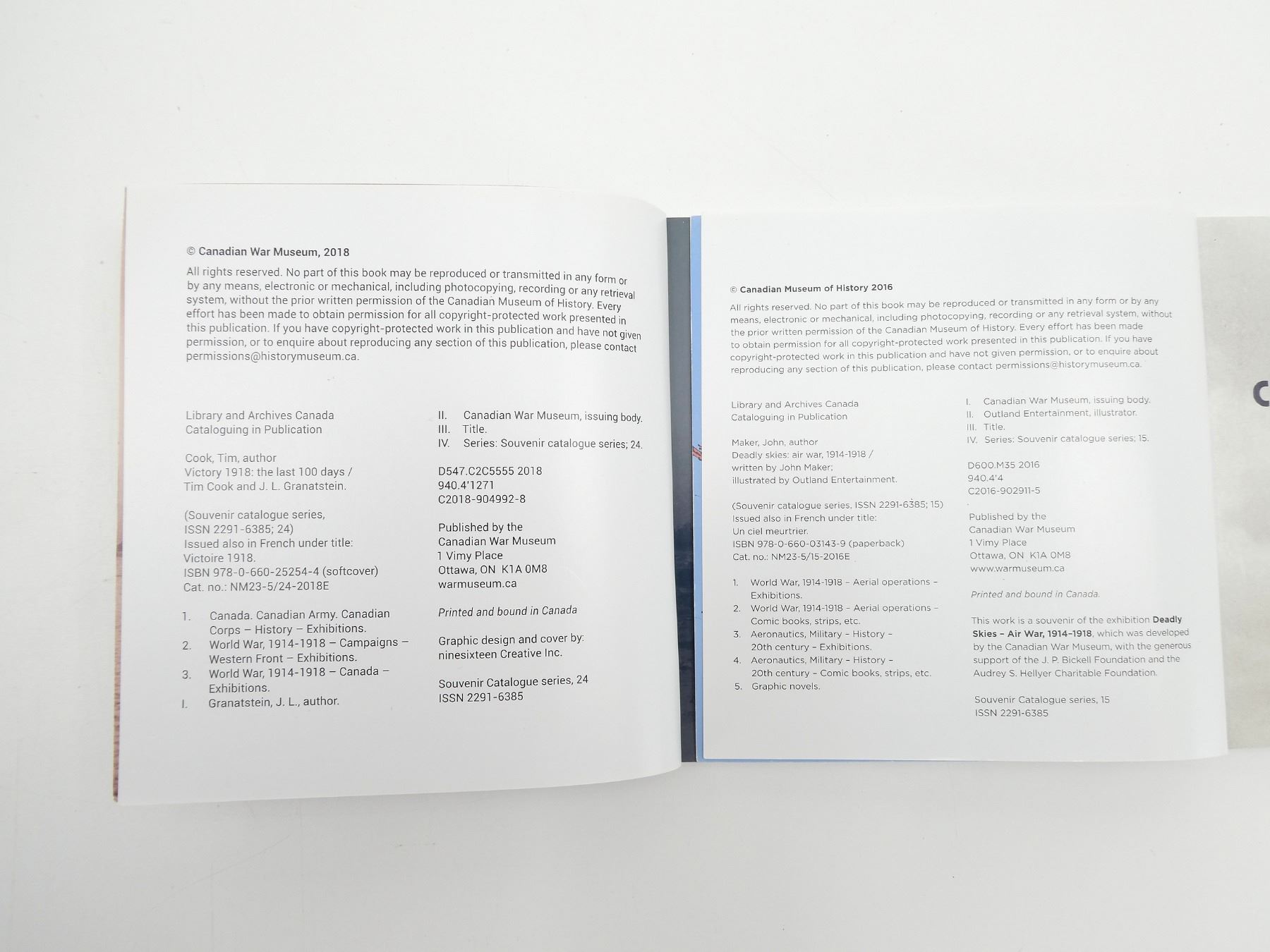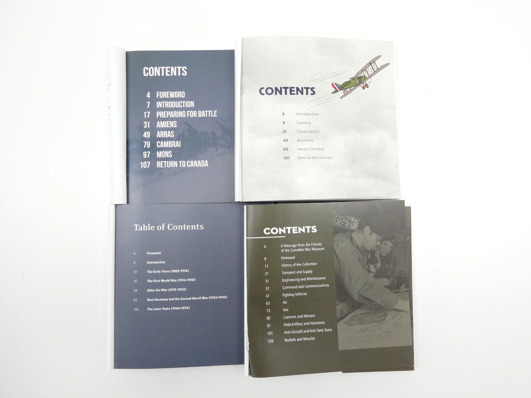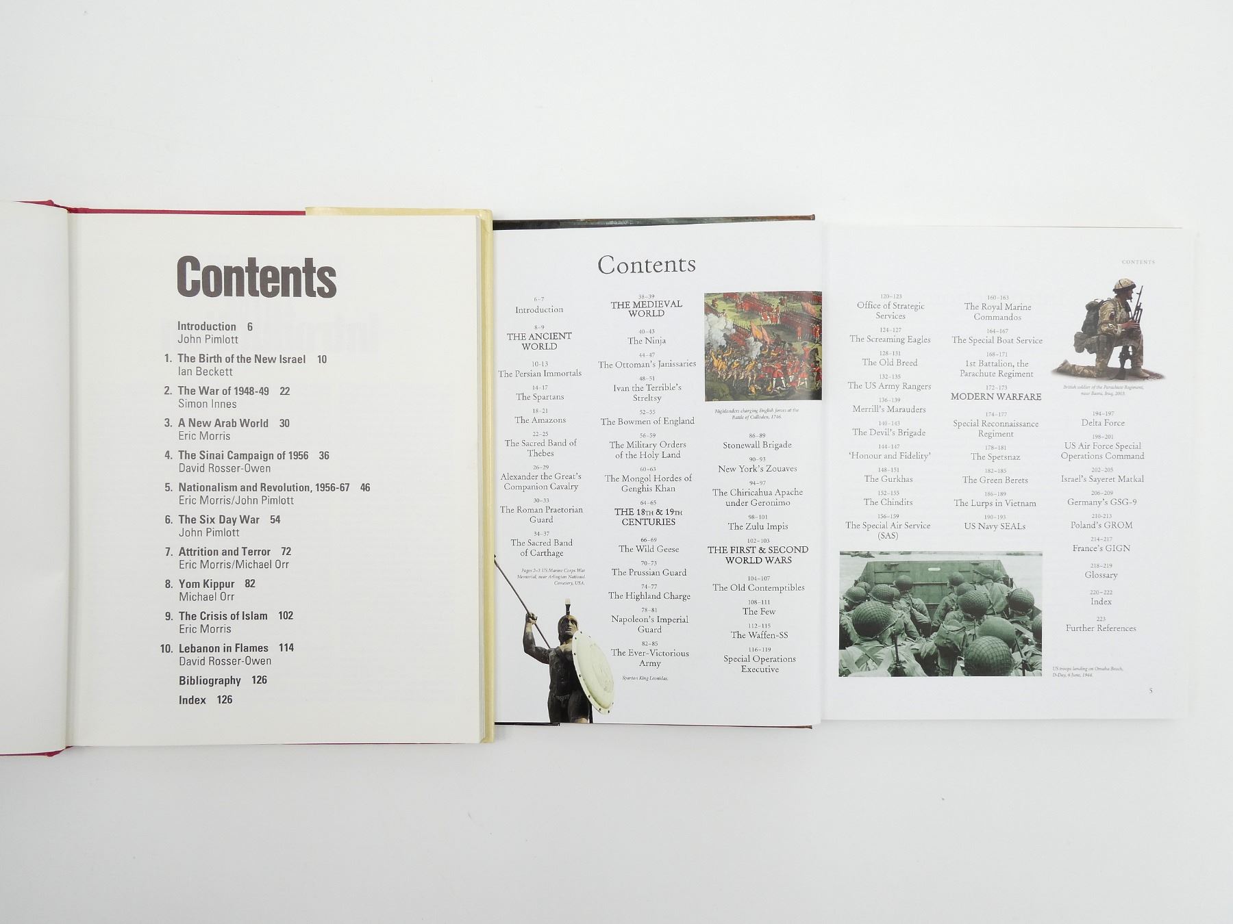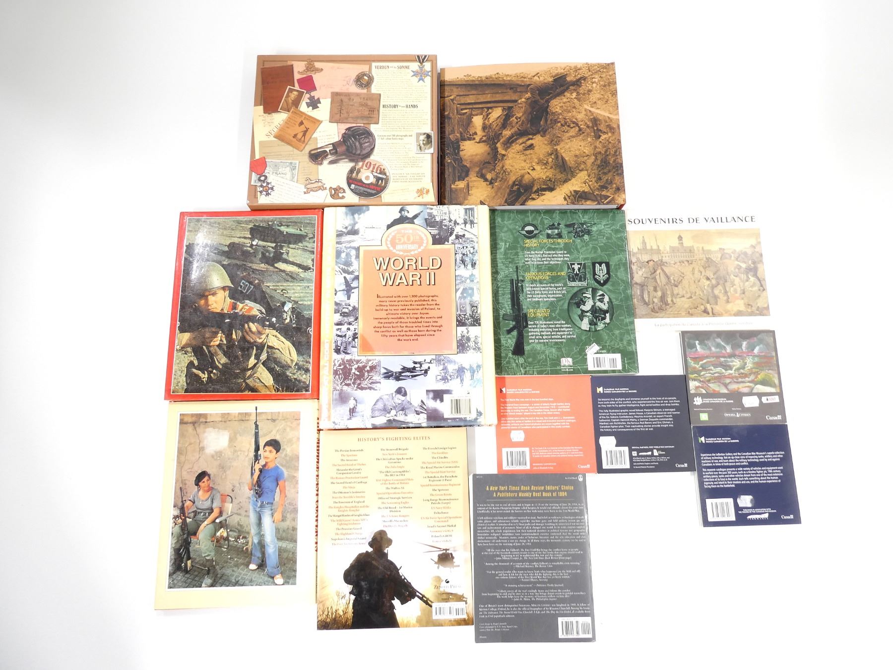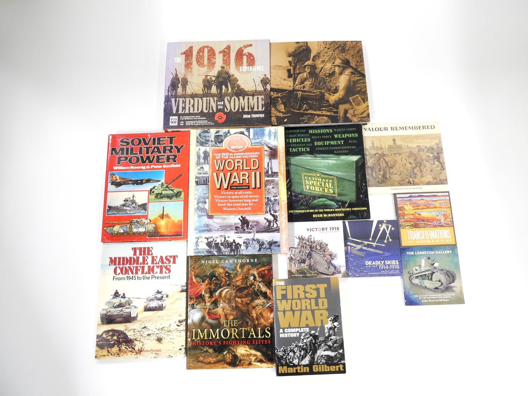LOT INCLUDES; (1) "THE IMMORTALS, HISTORY'S FIGHTING ELITES" BOOK BY NIGEL CAWTHORNE, HARD COVER WITH DUST COVER, ISBN: 978-0-7603-3752-3, (1) "ULTIMATE SPECIAL FORCES, THE INSIDER'S GUIDE TO THE WORLD'S MOST DEADLY COMMANDOS" BOOK BY HUGH MCMANNERS, SOFT COVER, ISBN: 978-0-7566-1898-8, (1) "THE 50TH ANNIVERSARY OF THE ALLIED VICTORY, WORLD WAR II" BOOK BY IVAN MATANLE, HARD COVER WITH DUST COVER, ISBN: 1-85833-333-4, (1) "SOVIET MILITARY POWER" BOOK BY WILLIAM KOENIG & PETER SCOFIELD, HARD COVER WITH DUST COVER, ISBN: 0-86124-127-4, (1) "THE MIDDLE EAST CONFLICTS FROM 1945 TO THE PRESENT" BOOK EDITED BY JOHN PIMLOTT, HARD COVER WITH DUST COVER, COPYRIGHT 1983, (1) "THE FIRST WORLD WAR, A COMPLETE HISTORY" BOOK BY MARTIN GILBERT, SOFT COVER, ISBN: 0-8050-4734-4, (1) "VALOUR REMEMBERED, CANADA AND THE FIRST WORLD WAR" BOOK, SOFT COVER, ISBN: 0-662-50108-X, (1) "DEADLY SKIES AIR WAR, 1914-1918" BOOK BY JOHN MAKER, SOFT COVER, ISBN: 978-0-660-03143-9, (1) "VICTORY 1918, THE LAST 100 DAYS" BOOK BY TIM COOK & J.L GRANATSTEIN, SOFT COVER, ISBN: 978-0-660-25254-4, (1) "THE LEBRETON GALLERY, THE MILITARY TECHNOLOGY COLLECTION OF THE CANADIAN WAR MUSEUM" BOOK BY ANDREW BURTCH, SOFT COVER, ISBN: 978-0-660-20309-6, (1) "TRANSFORMATIONS" BOOK BY A.Y. JACKSON & OTTO DIX, SOFT COVER, ISBN: 978-0-660-20281-5 & (1) "THE 1916 EXPERIENCE, VERDUN AND THE SOMME" BOOK AND AUDIO CD SET BY JULIAN THOMPSON, HARD COVER WITH SLEEVE, ISBN: 1-84442-450-2. SEE PHOTOS.