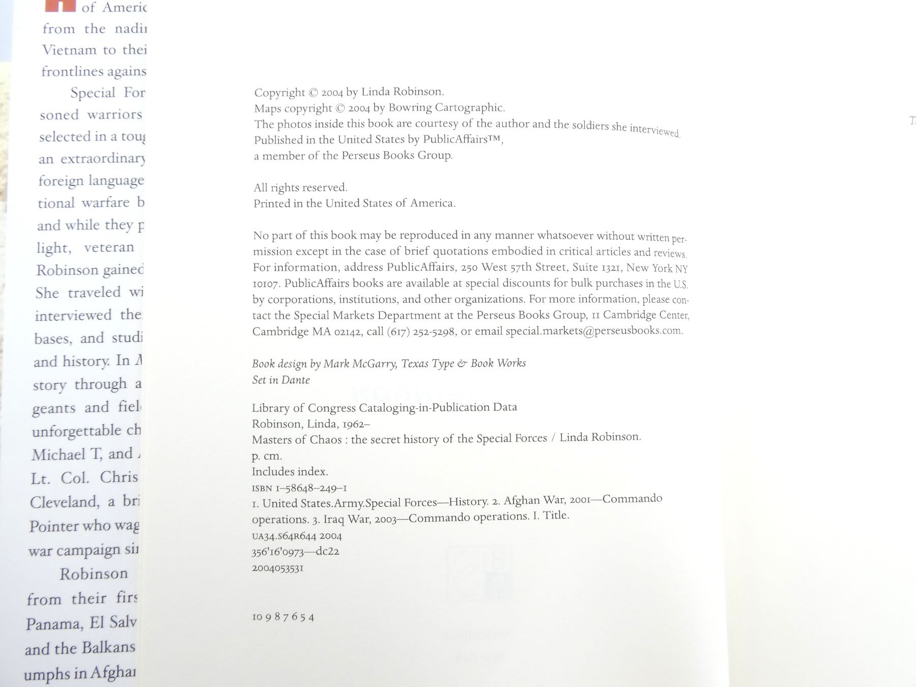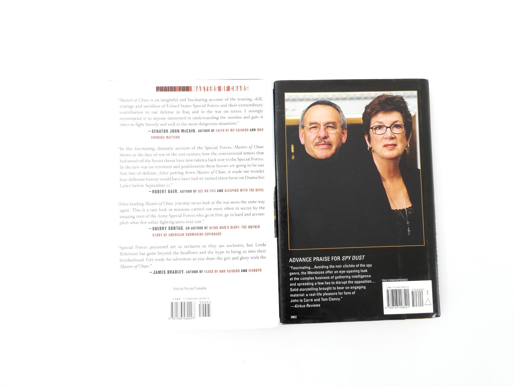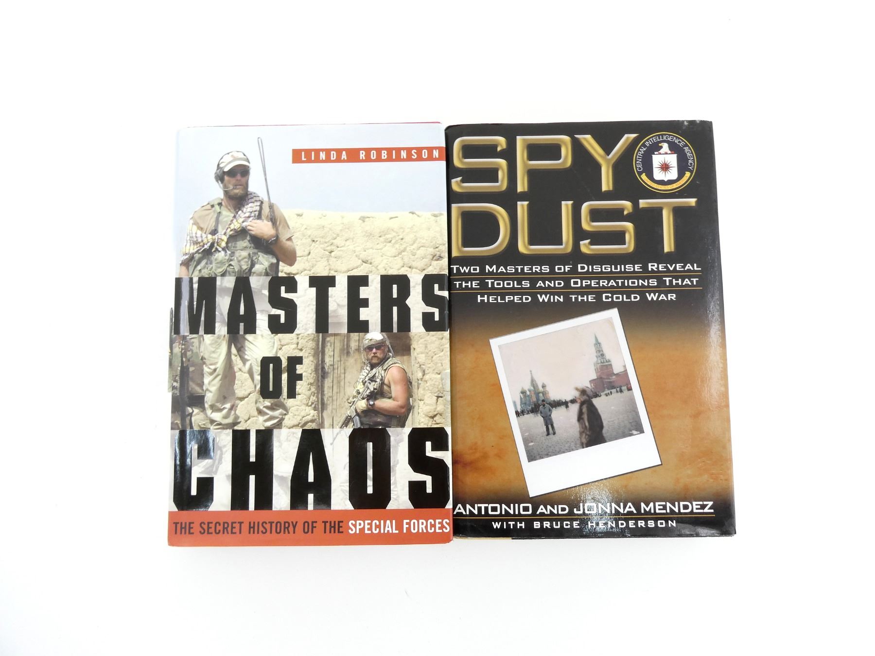 HARD COVERS WITH DUST COVERS, LOT INCLUDES; (1) "SPY DUST" BOOK BY ANTONIO & JONNA MENDEZ WITH BRUCE HENDERSON, ISBN: 0-7434-2852-8 & (1) "MASTERS OF CHAOS" BOOK BY LINDA ROBINSON, ISBN: 1-58648-249-1. SEE PHOTOS.