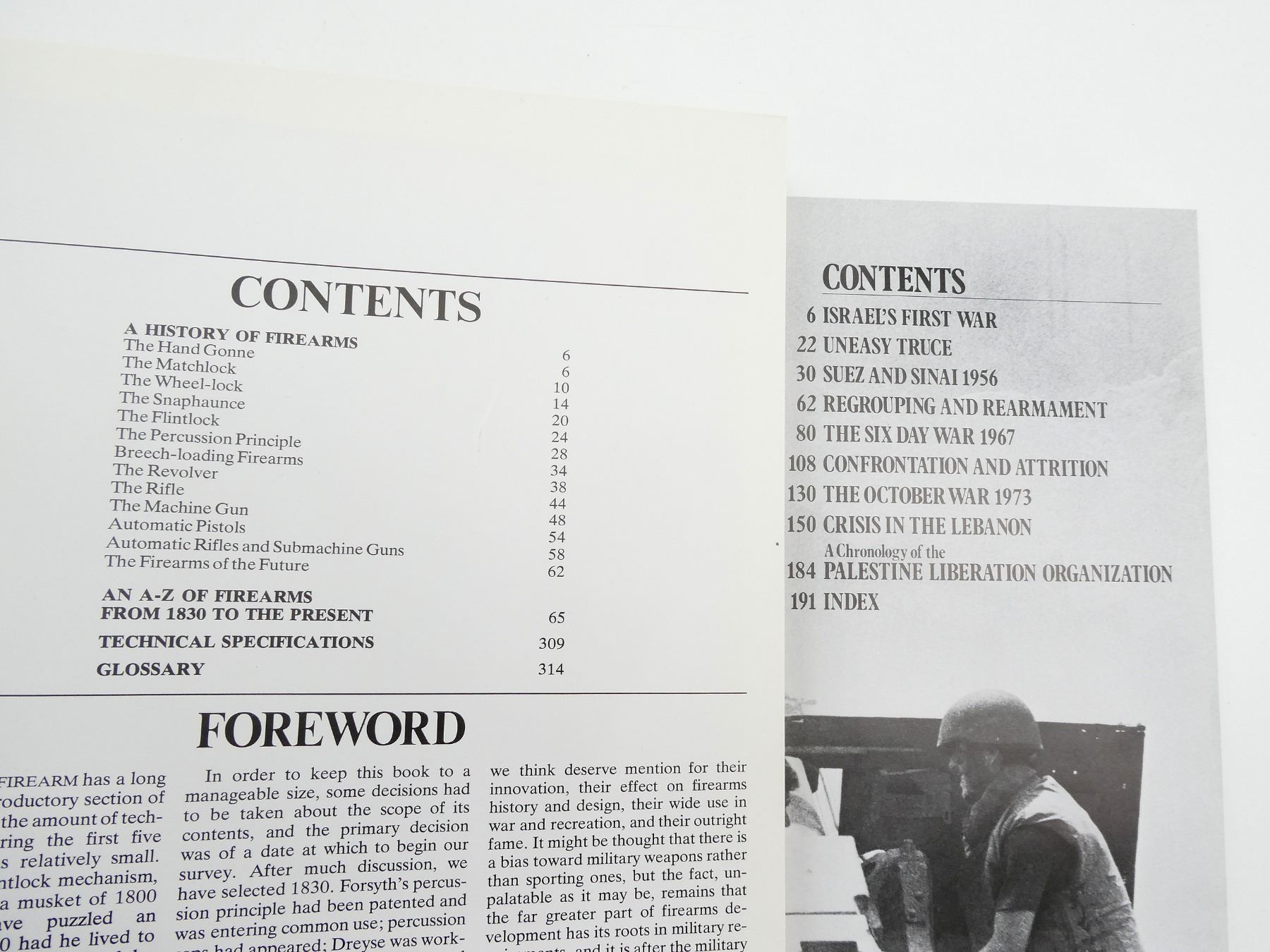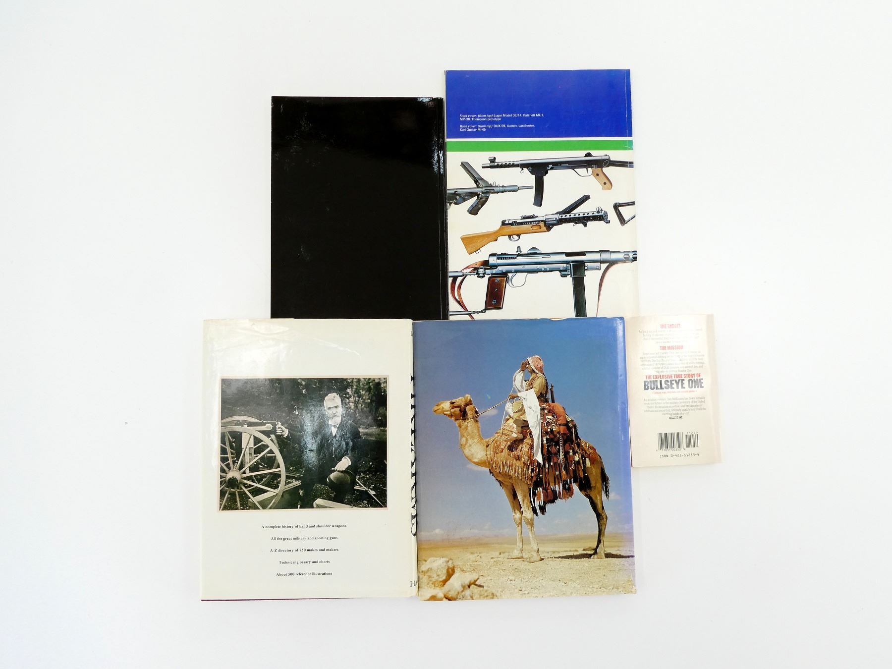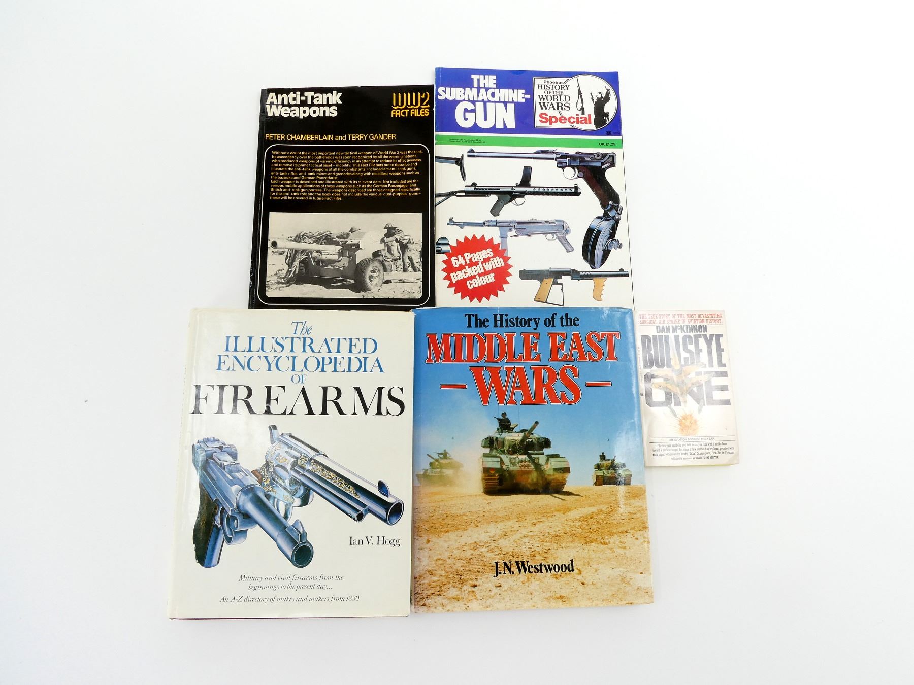 LOT INCLUDES; (1) "BULLSEYE ONE" BOOK BY DAN MCKINNON, SOFT COVER, ISBN: 0-425-11259-4, (1) "ANTI-TANK WEAPONS" BOOK BY PETER CHAMBERLAIN & TERRY GANDER, SOFT COVER, ISBN: 0-668-03607-9, (1) "THE SUBMACHINE-GUN" BOOK BY IAN HOGG & JOHN BATCHELOR, SOFT COVER, COPYRIGHT 1978, (1) "THE ILLUSTRATED ENCYCLOPEDIA OF FIREARMS" BOOK BY IAN V. HOGG, HARD COVER WITH DUST COVER, ISBN: 0-600-33670-0 & (1) "THE HISTORY OF MIDDLE EAST WARS" BOOK BY J.N. WESTWOOD, HARD COVER WITH DUST COVER, ISBN: 0-86124-166-5. SEE PHOTOS.