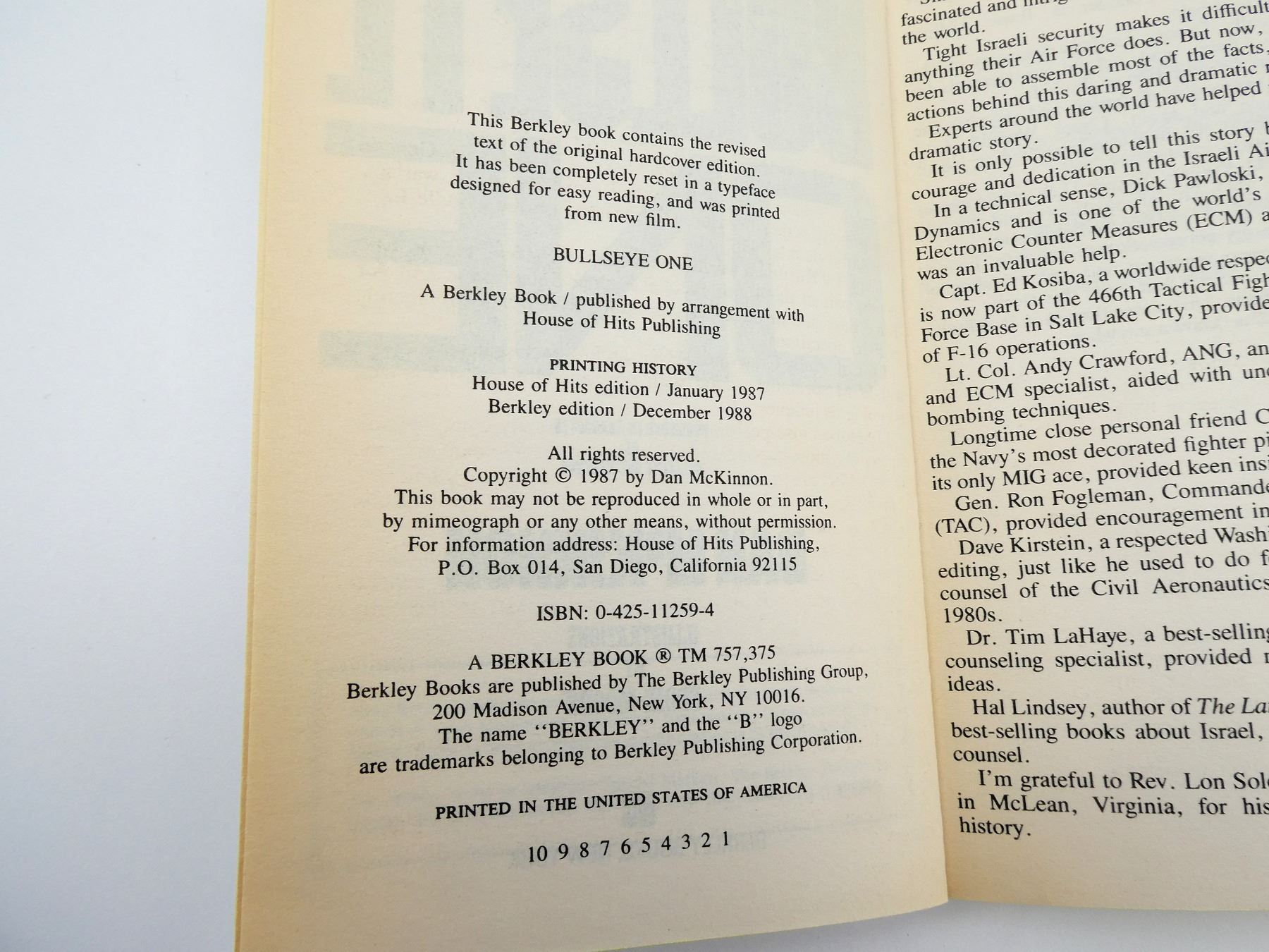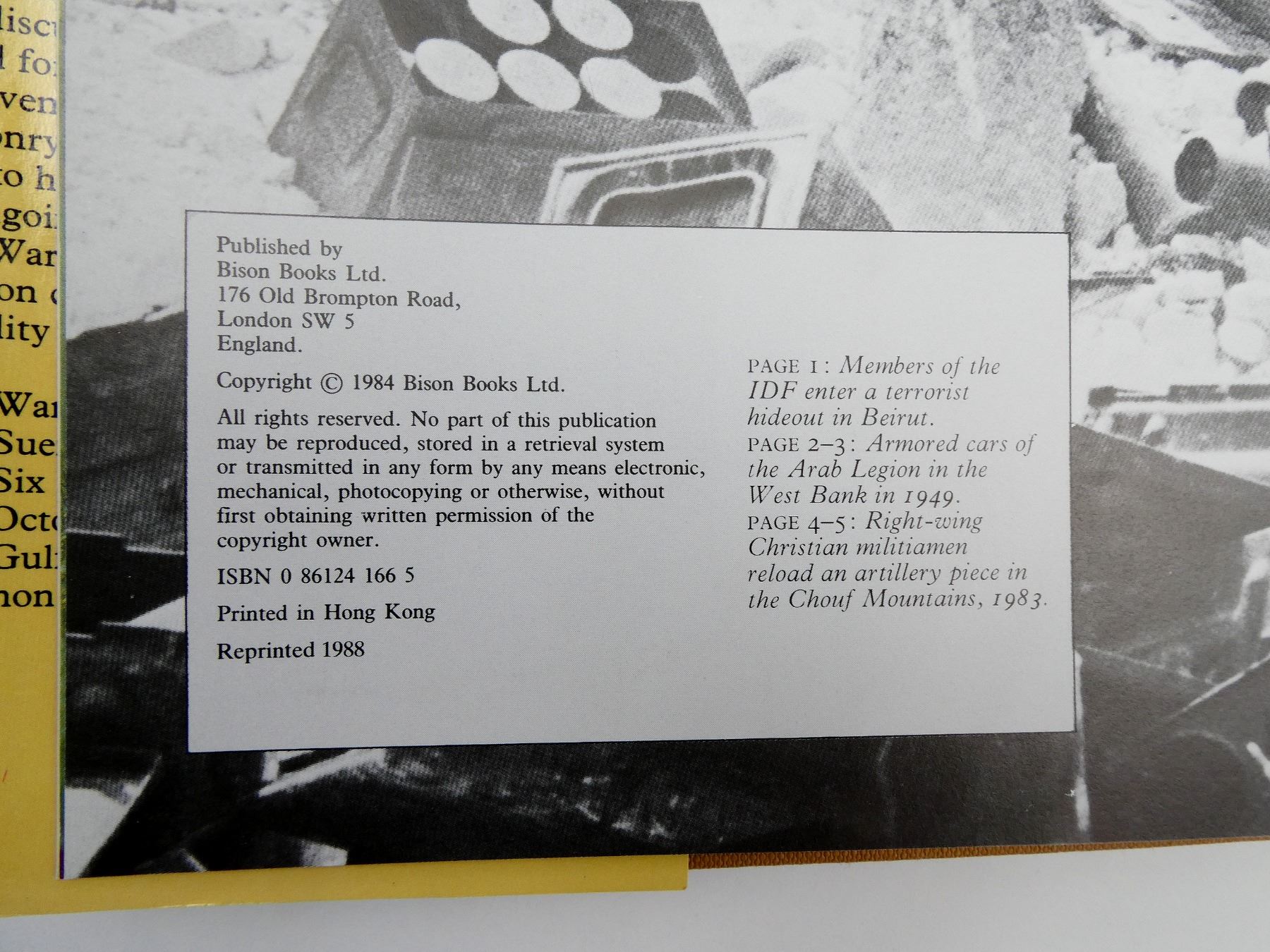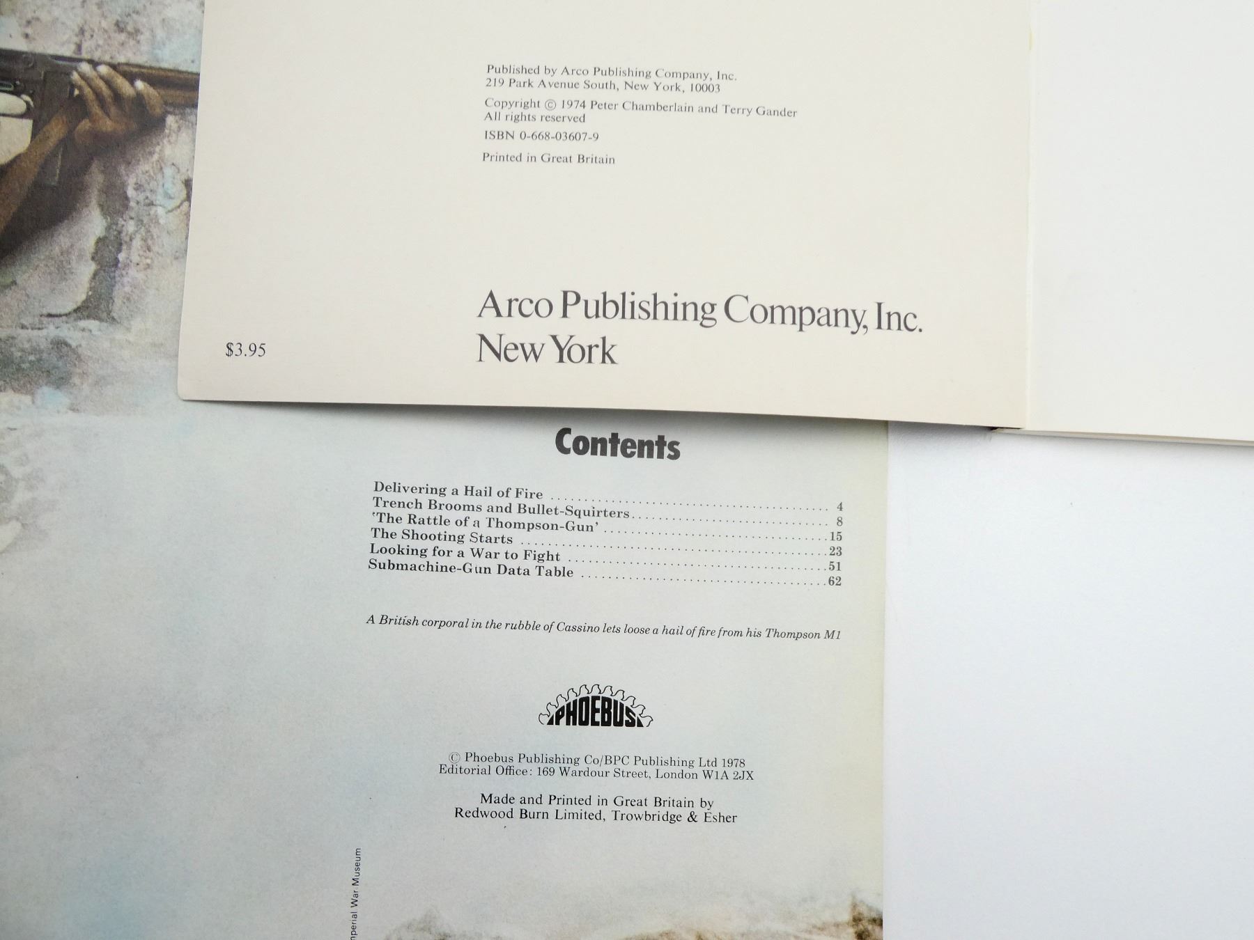LOT INCLUDES; (1) "BULLSEYE ONE" BOOK BY DAN MCKINNON, SOFT COVER, ISBN: 0-425-11259-4, (1) "ANTI-TANK WEAPONS" BOOK BY PETER CHAMBERLAIN & TERRY GANDER, SOFT COVER, ISBN: 0-668-03607-9, (1) "THE SUBMACHINE-GUN" BOOK BY IAN HOGG & JOHN BATCHELOR, SOFT COVER, COPYRIGHT 1978, (1) "THE ILLUSTRATED ENCYCLOPEDIA OF FIREARMS" BOOK BY IAN V. HOGG, HARD COVER WITH DUST COVER, ISBN: 0-600-33670-0 & (1) "THE HISTORY OF MIDDLE EAST WARS" BOOK BY J.N. WESTWOOD, HARD COVER WITH DUST COVER, ISBN: 0-86124-166-5. SEE PHOTOS.