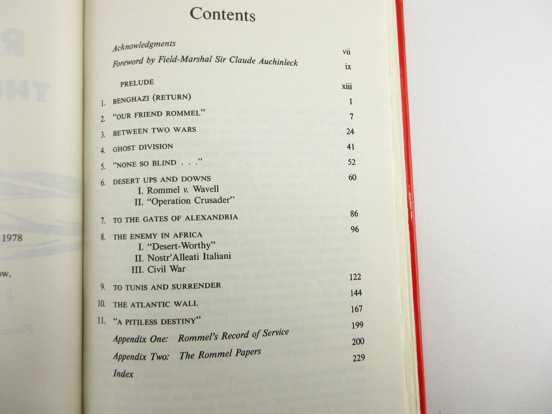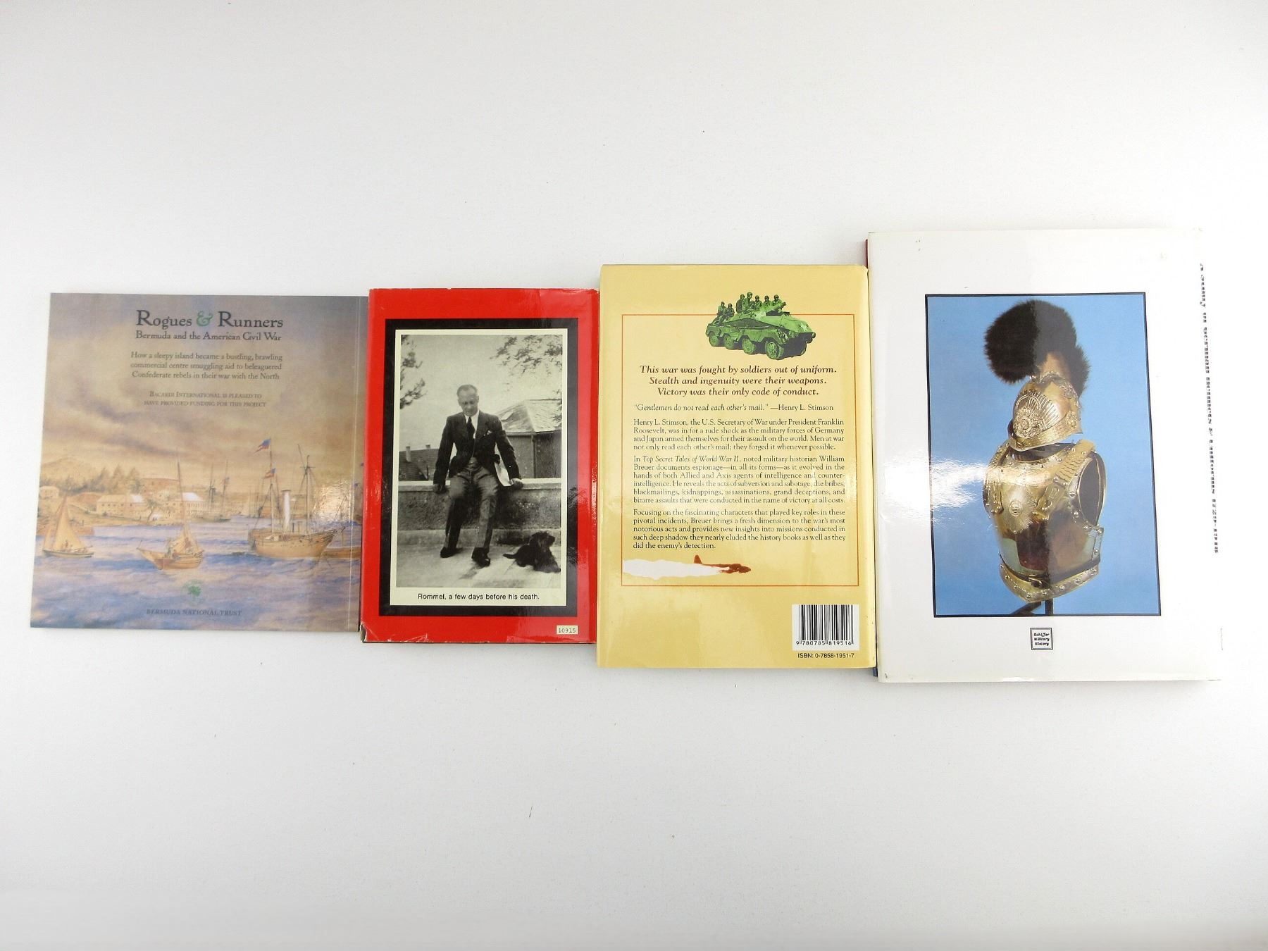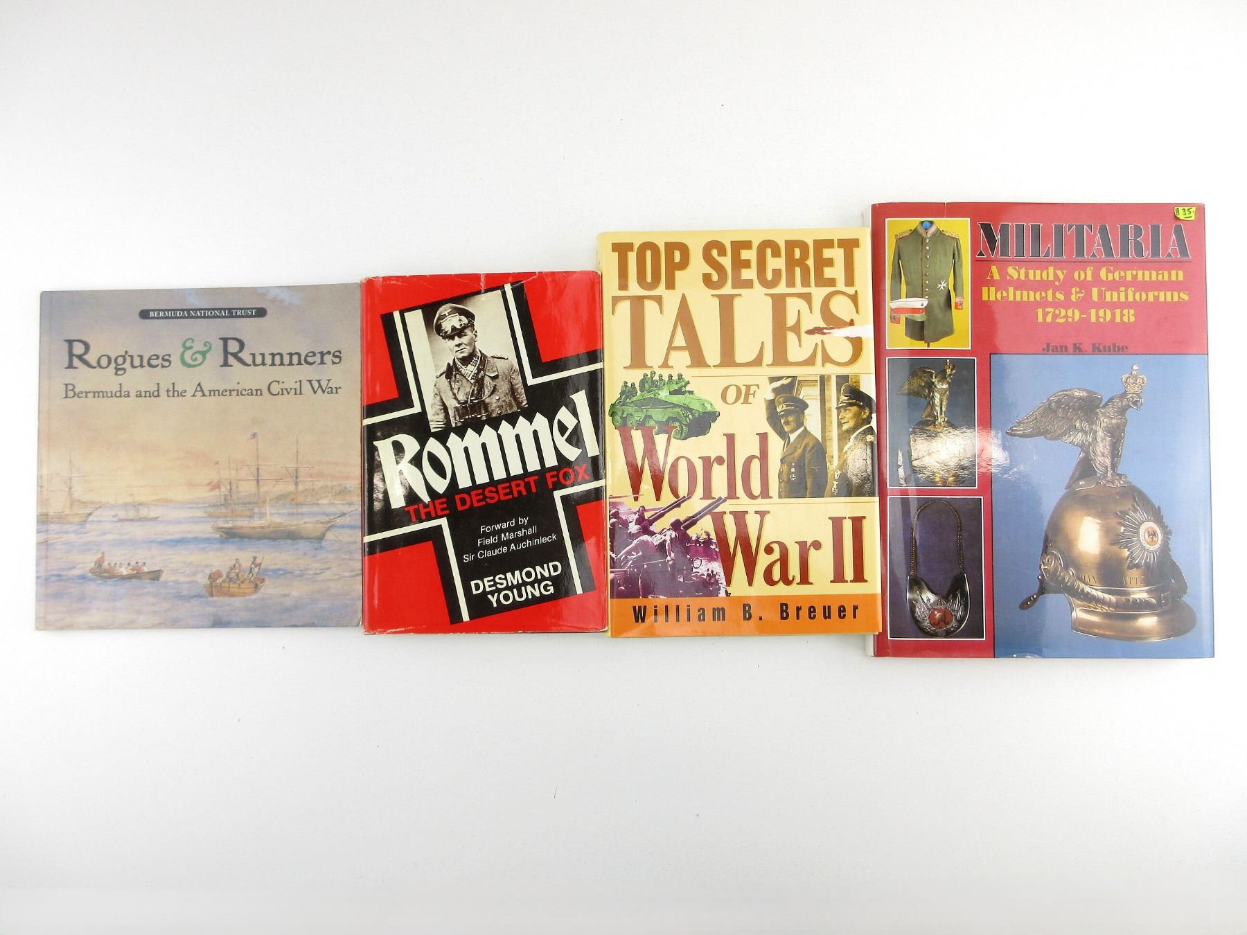 LOT INCLUDES; (1) "ROMMEL, THE DESERT FOX" BOOK BY DESMOND YOUNG, HARD COVER WITH DUST COVER, COPYRIGHT 1978, (1) "ROGUES & RUNNERS, BERMUDA AND THE AMERICAN CIVIL WAR" BOOK BY CATHERINE LYNCH DEICHMANN, SOFT COVER, ISBN: 0-9693939-9-7, (1) "MILITARIA, A STUDY OF GERMAN HELMETS & UNIFORMS 1729-1918" BOOK BY JAN K. KUBE, HARD COVER WITH DUST COVER, ISBN: 0-88740-243-7 & (1) "TOP SECRET TALES OF WORLD WAR II" BOOK BY WILLIAM B. BREUER, HARD COVER WITH DUST COVER, ISBN: 0-7858-1951-7. SEE PHOTOS.