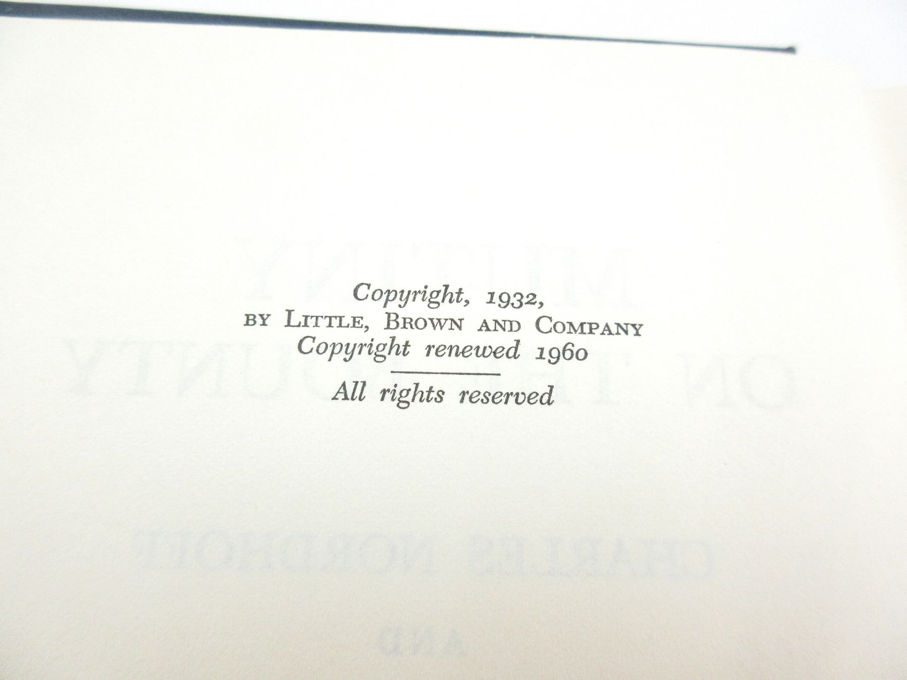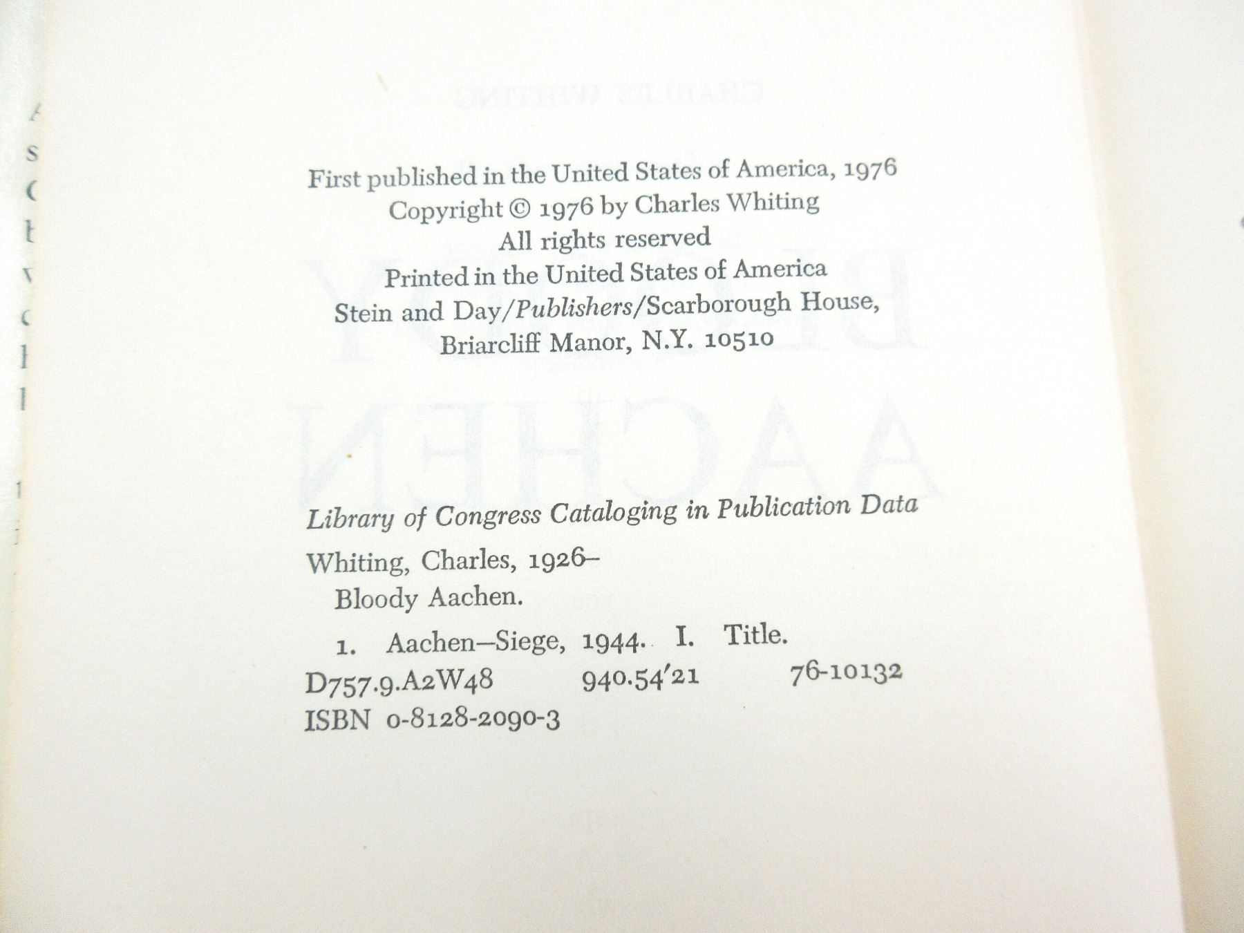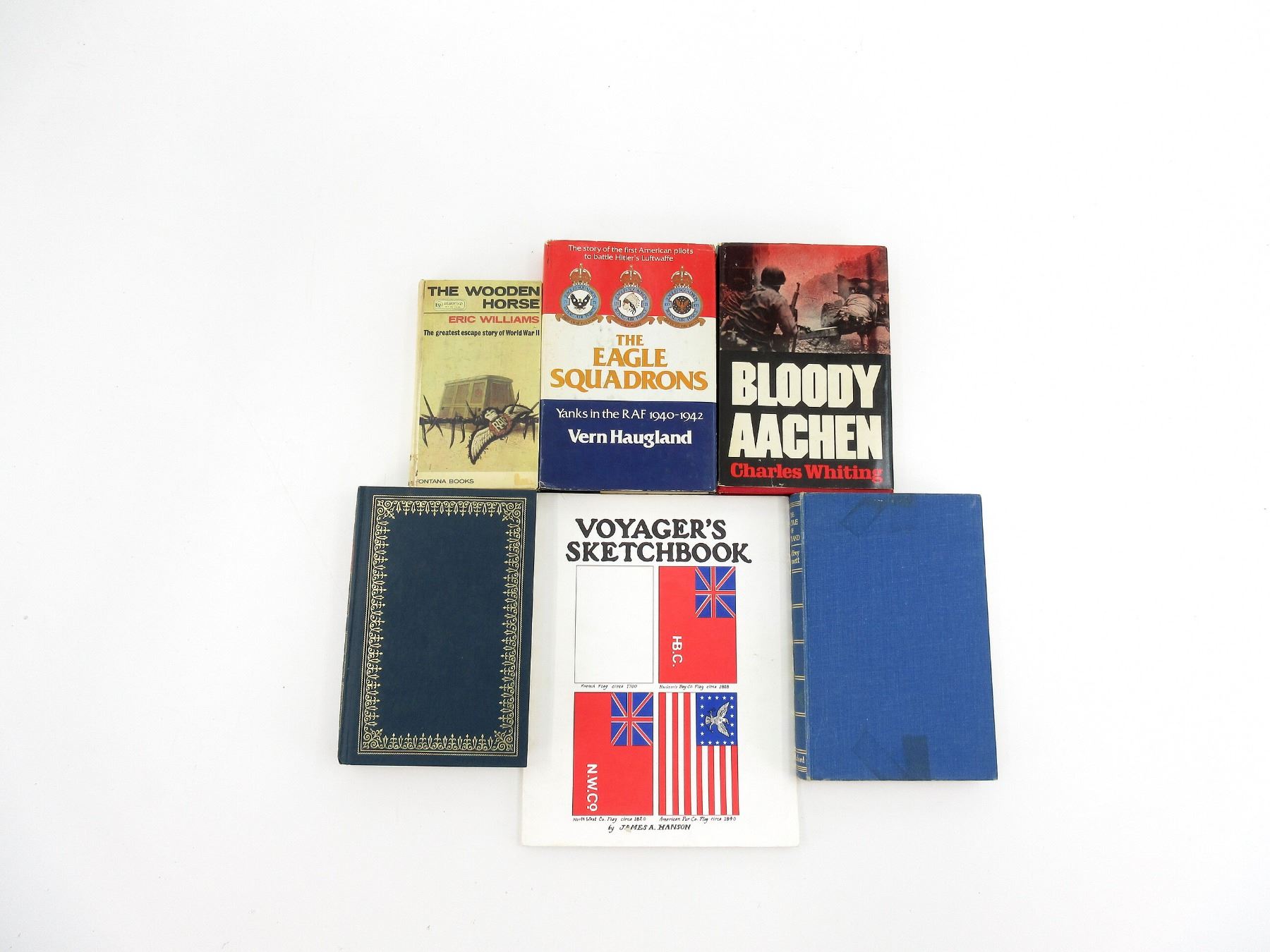 LOT INCLUDES; (1) "THE EAGLE SQUADRONS, YANKS IN THE RAF 1940-1942" BOOK BY VERN HAUGHLAN, HARD COVER WITH DUST COVER, COPYRIGHT 1979, (1) "THE WOODEN HORSE, THE GREATEST ESCAPE STORY OF WORLD WAR II" BOOK BY ERIC WILLIAMS, HARD COVER, COPYRIGHT 1965, (1) "BLOODY AACHEN" BOOK BY CHARLES WHITING, HARD COVER WITH DUST COVER, ISBN: 0-8128-2090-3, (1) "VOYAGER'S SKETCHBOOK" BOOK BY JAMES A. HANSON, SOFT COVER, COPYRIGHT 1981, (1) "THE BATTLE OF JUTLAND" BOOK BY GEOFFREY BENNETT, HARD COVER, COPYRIGHT 1964 & (1) "MUTINY ON THE BOUNTY" BOOK BY CHARLES NORDHOFF AND JAMES NORMAN HALL, HARD COVER, COPYRIGHT 1960. SEE PHOTOS.