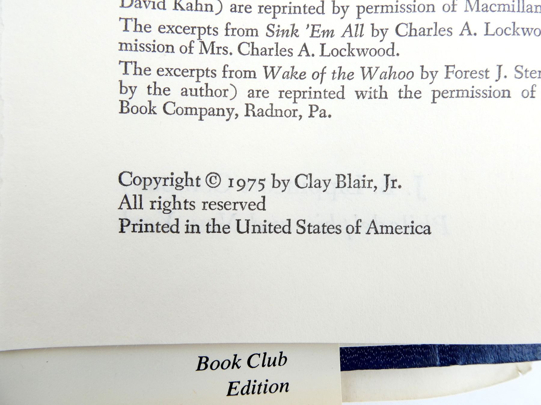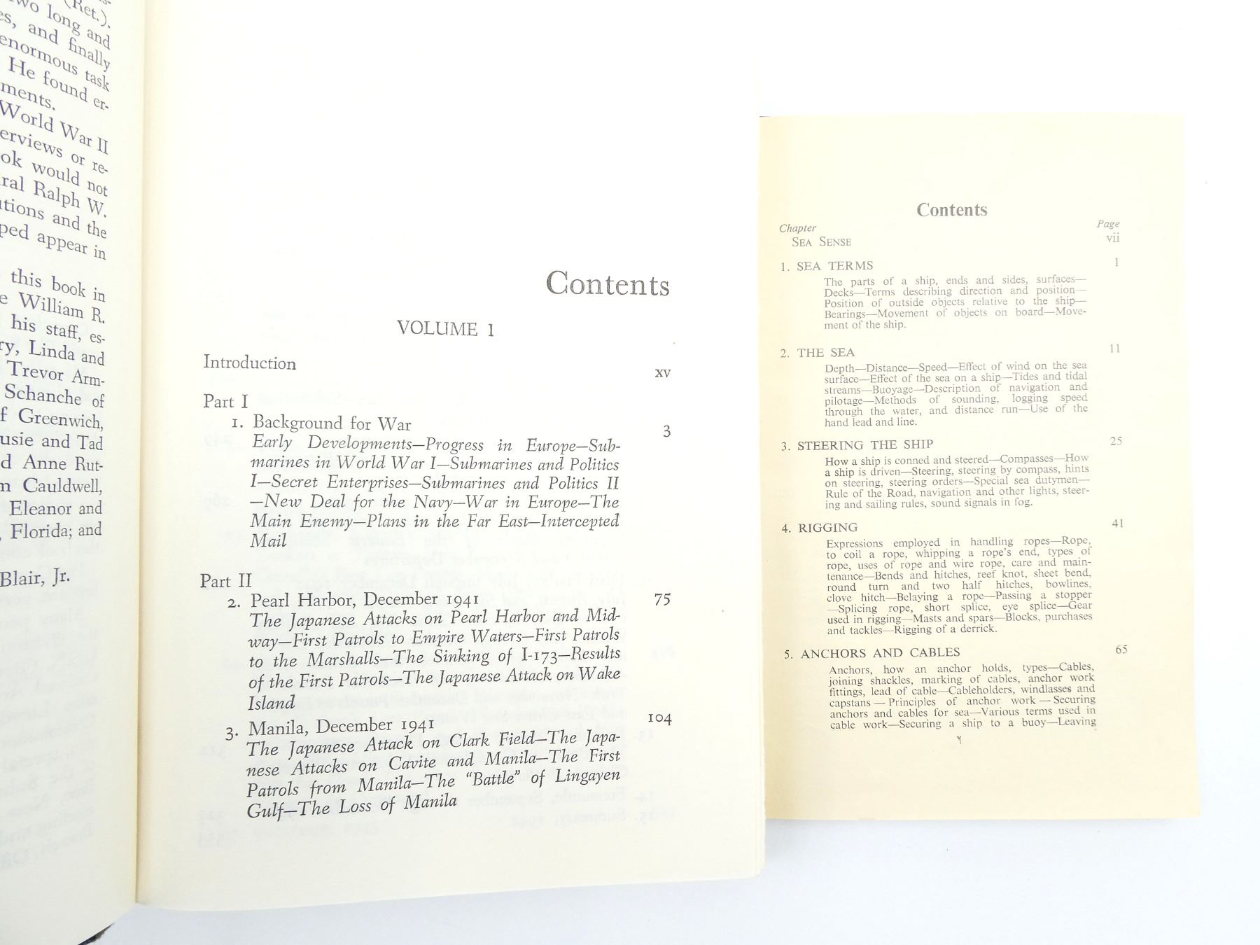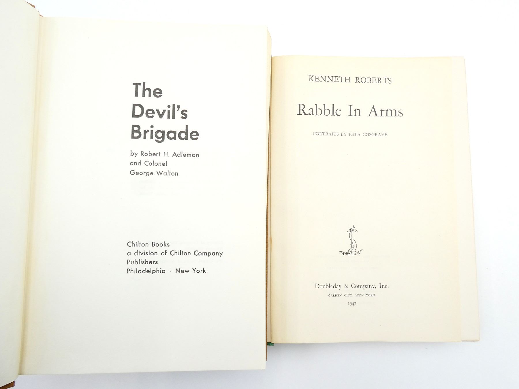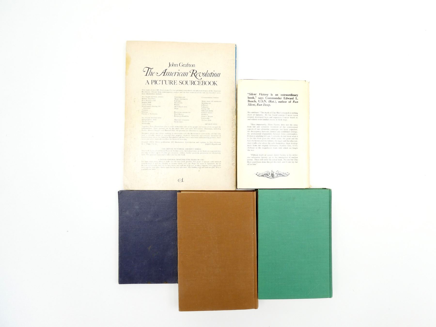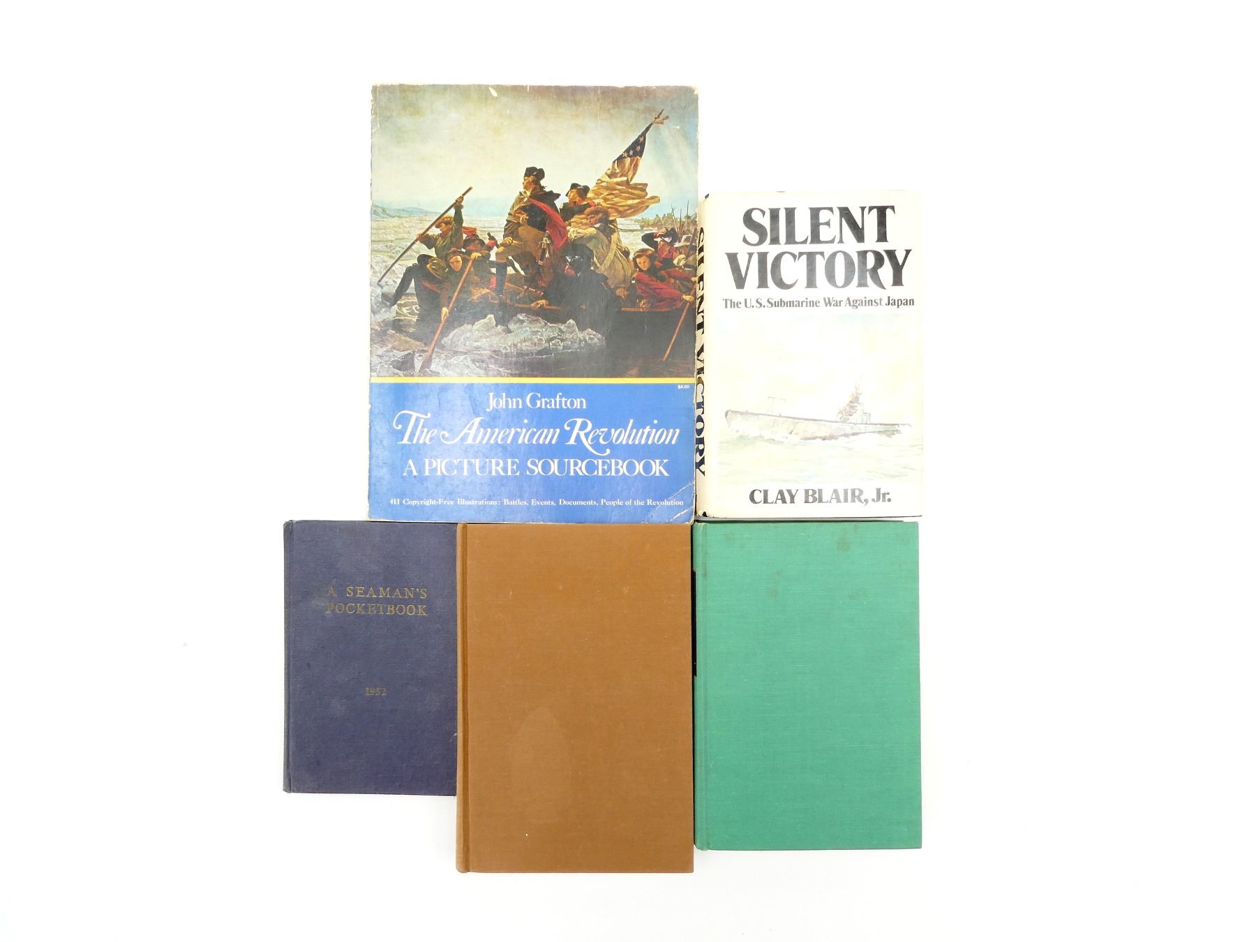 LOT INCLUDES; (1) "A SEAMAN'S POCKETBOOK 1952" BOOK PUBLISHED BY HER MAJESTY'S STATIONERY OFFICE, HARD COVER, REPRINTED 1958, (1) "SILENT VICTORY, THE U.S. SUBMARINE WAR AGAINST JAPAN, VOLUME 1" BOOK BY CLAY BLAIR JR., HARD COVER WITH DUST COVER, COPYRIGHT 1975, (1) "RABBLE IN ARMS" BOOK PUBLISHED BY DOUBLEDAY & COMPANY INC., HARD COVER, COPYRIGHT 1947, (1) "THE DEVIL'S BRIGADE" BOOK BY ROBERT H. ADLEMAN & GEORGE WALTON, HARD COVER, COPYRIGHT 1966 & (1) "THE AMERICAN REVOLUTION, A PICTURE SOURCEBOOK" BOOK BY JOHN GRAFTON, SOFT COVER, ISBN: 0-486-23226-3. SEE PHOTOS.