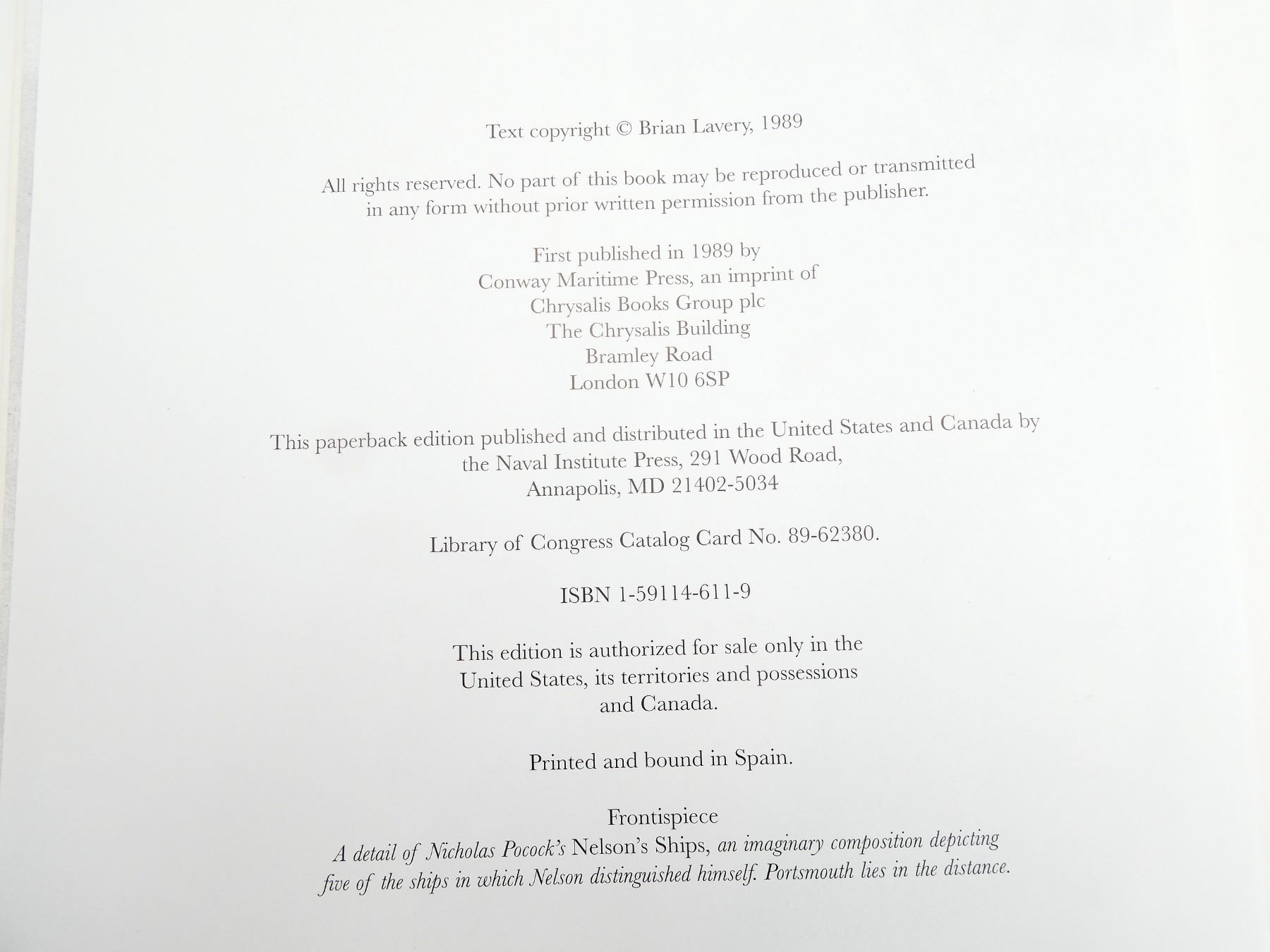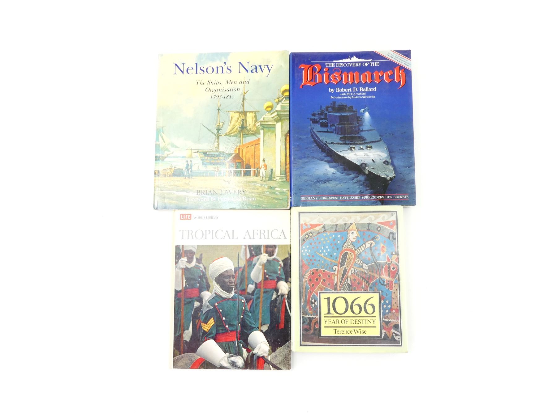 LOT INCLUDES; (1) "NELSON'S NAVY, THE SHIPS, MEN AND ORGANISATION 1793-1815" BOOK BY BRIAN LAVERY, SOFT COVER, ISBN: 1591146119, (1) "THE DISCOVERY OF THE BISMARCK" BOOK BY ROBERT D. BALLARD, HARD COVER WITH DUST COVER, ISBN: 0-670-83587-0, (1) "TROPICAL AFRICA" BOOK BY ROBERT COUGHLAN, HARD COVER, COPYRIGHT 1962 & (1) "1066 YEAR OF DESTINY" BOOK BY TERENCE WISE, HARD COVER WITH DUST COVER, ISBN: 0-85045-320-8. SEE PHOTOS.