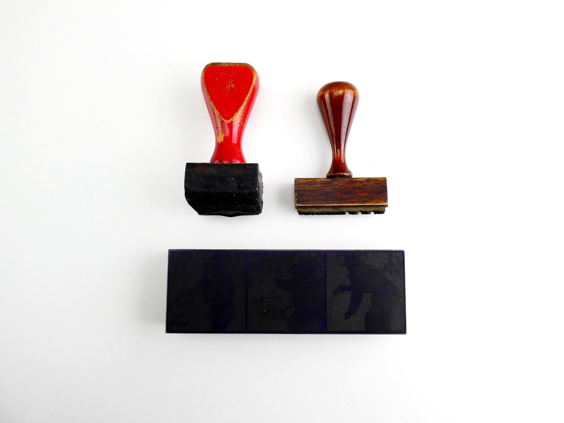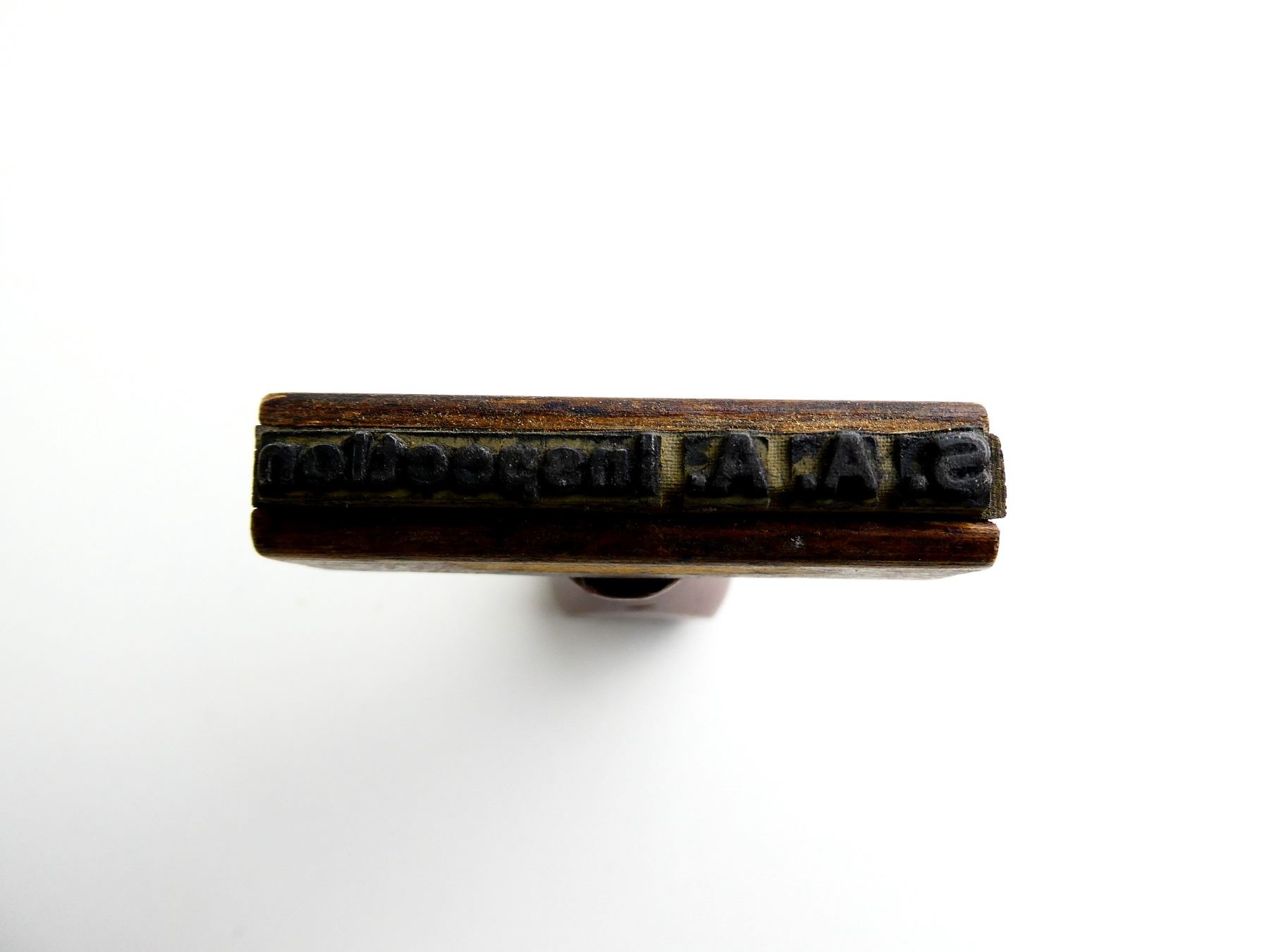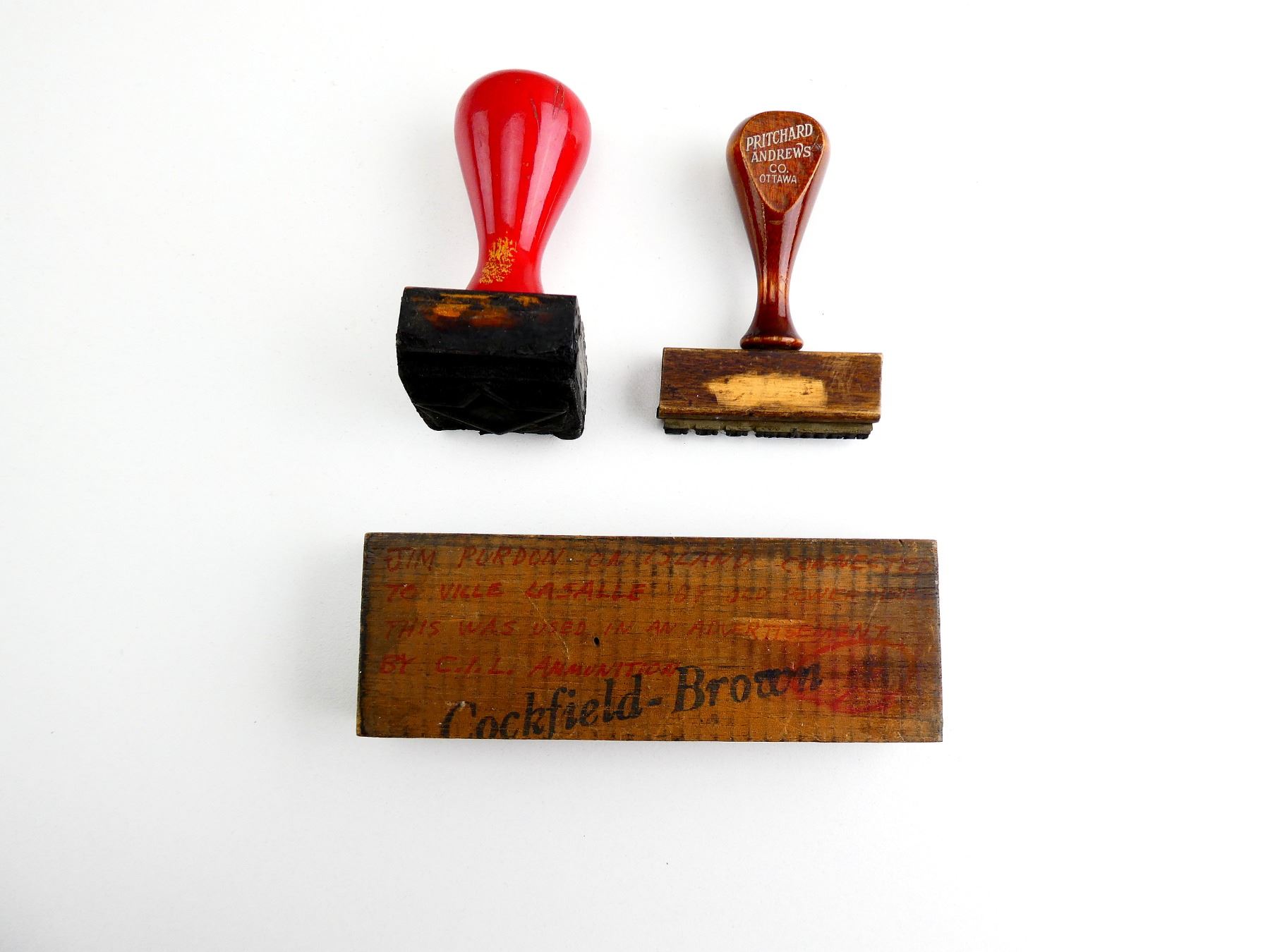 LOT INCLUDES; (1) 1950'S STYLE CANADIAN MILITARY MAPLE LEAF PROOF MARK STAMP, WOODEN HANDLE, SHOWS AGE / WEAR, OAL APPROX. 3.5", (1) S.A.A. INSPECTION STAMP, WOODEN HANDLE MARKED: "PRITCHARD ANDREWS CO. OTTAWA", OAL APPROX. 3" & (1) ADVERTISING PRINTING PLATE FOR C.I.L. AMMUNITION, THE SHOOTER PICTURED IS JAMES PURDON, WOODEN CONSTRUCTION, MARKED: "COCKFIELD-BROWN" & VARIOUS OTHER FAINT / UN-CLEAR MARKINGS, APPROX. 5 1/8" X 1.75" X 7/8". SEE PHOTOS.