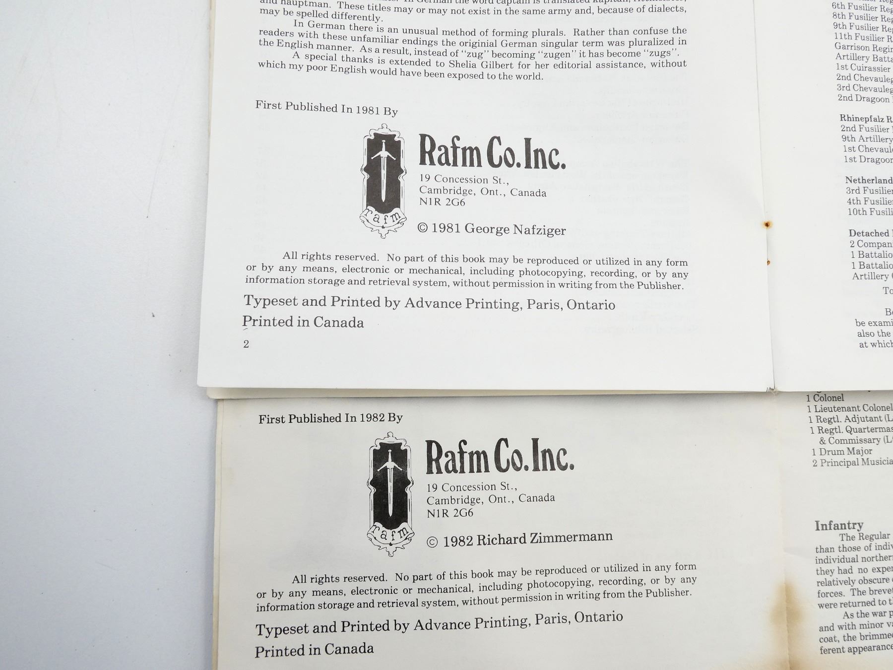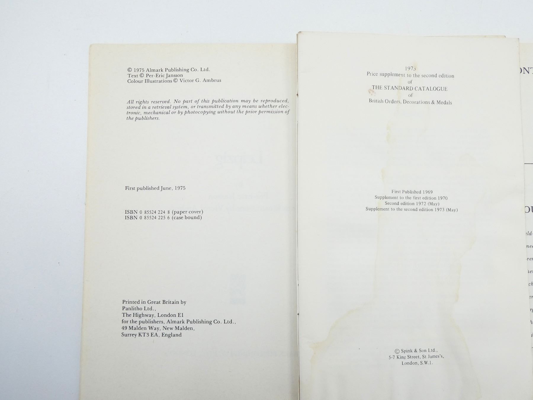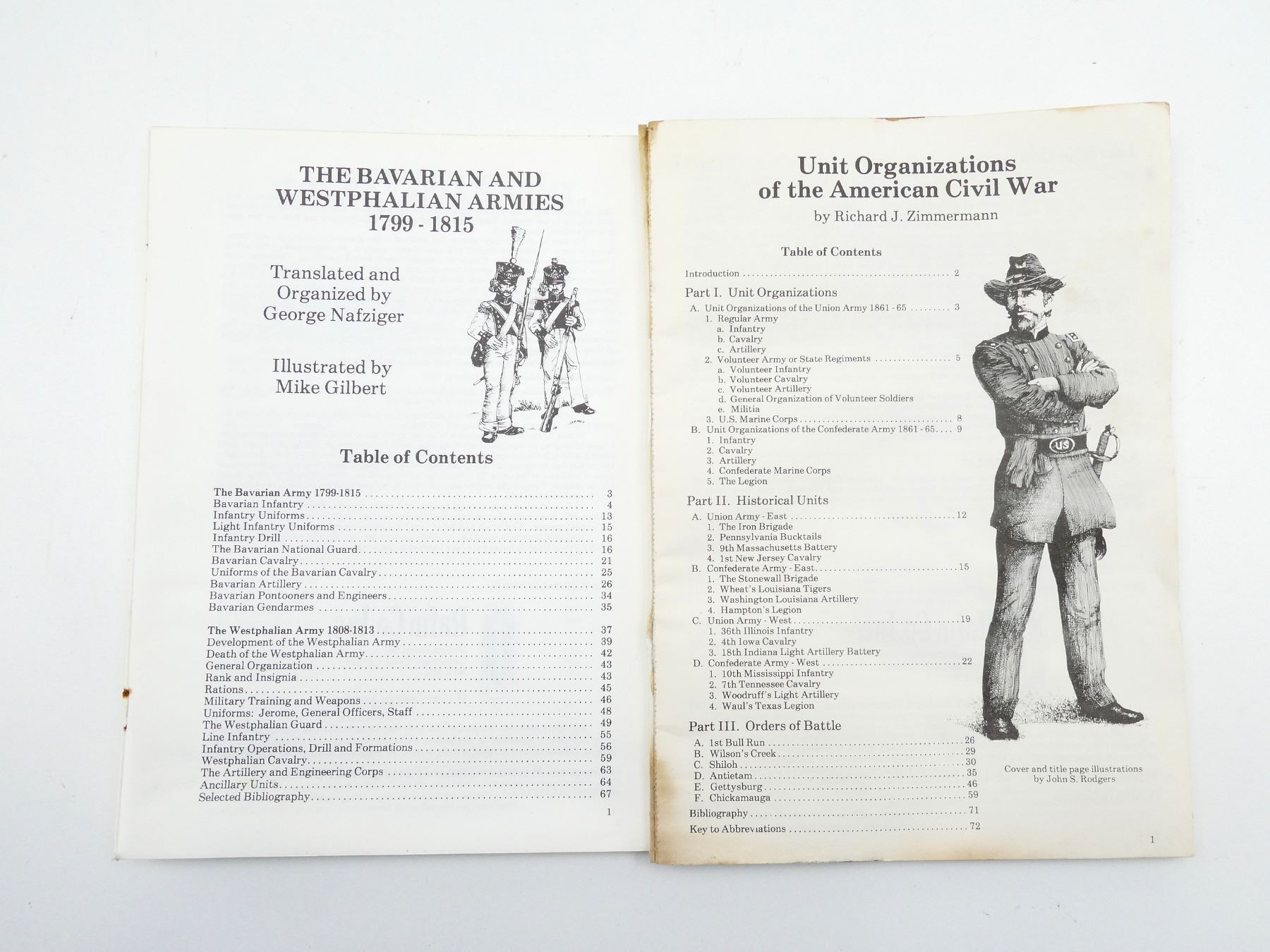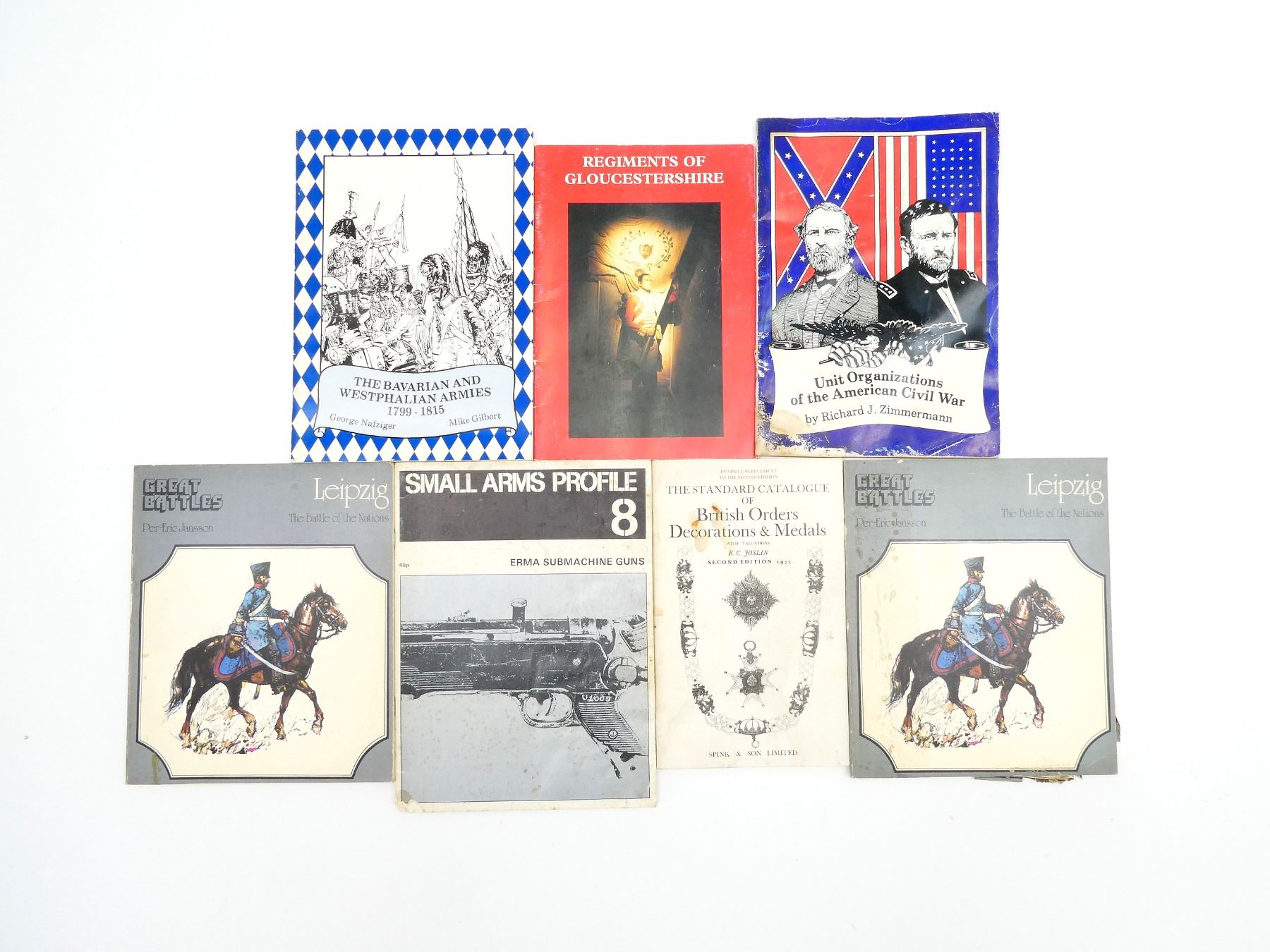SOFT COVERS, LOT INCLUDES; (1) "THE STANDARD CATALOGUE OF BRITISH ORDERS, DECORATIONS & MEDALS WITH VALUATIONS, 1973 PRICE SUPPLEMENT TO THE SECOND EDITION" CATALOGUE, BY E. C. JOSLIN, COPYRIGHT 1973, (2) "GREAT BATTLES, LEIPZIG, THE BATTLE OF THE NATIONS" BOOKS BY PER-ERIC JANSSON, ISBN: 0-85524-224-8, (1) "SMALL ARMS PROFILE 8, ERMA SUBMACHINE GUNS" BOOK PUBLISHED BY PROFILE PUBLICATIONS LTD, COPYRIGHT 1972, (1) "REGIMENTS OF GLOUCESTERSHIRE" BOOK PUBLISHED BY ENGLISH LIFE PUBLICATIONS LTD., ISBN: 0-85101-283-3, (1) "THE BAVARIAN AND WESTPHALIAN ARMIES 1799-1815" BOOK BY GEORGE NAFZIGER & MIKE GILBERT, COPYRIGHT 1981 & (1) "UNIT ORGANIZATIONS OF THE AMERICAN CIVIL WAR" BOOK BY RICHARD J. ZIMMERMANN, COPYRIGHT 1982. SEE PHOTOS.