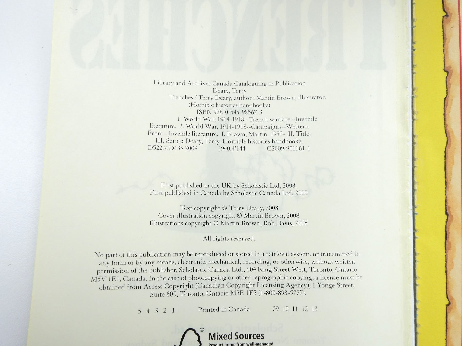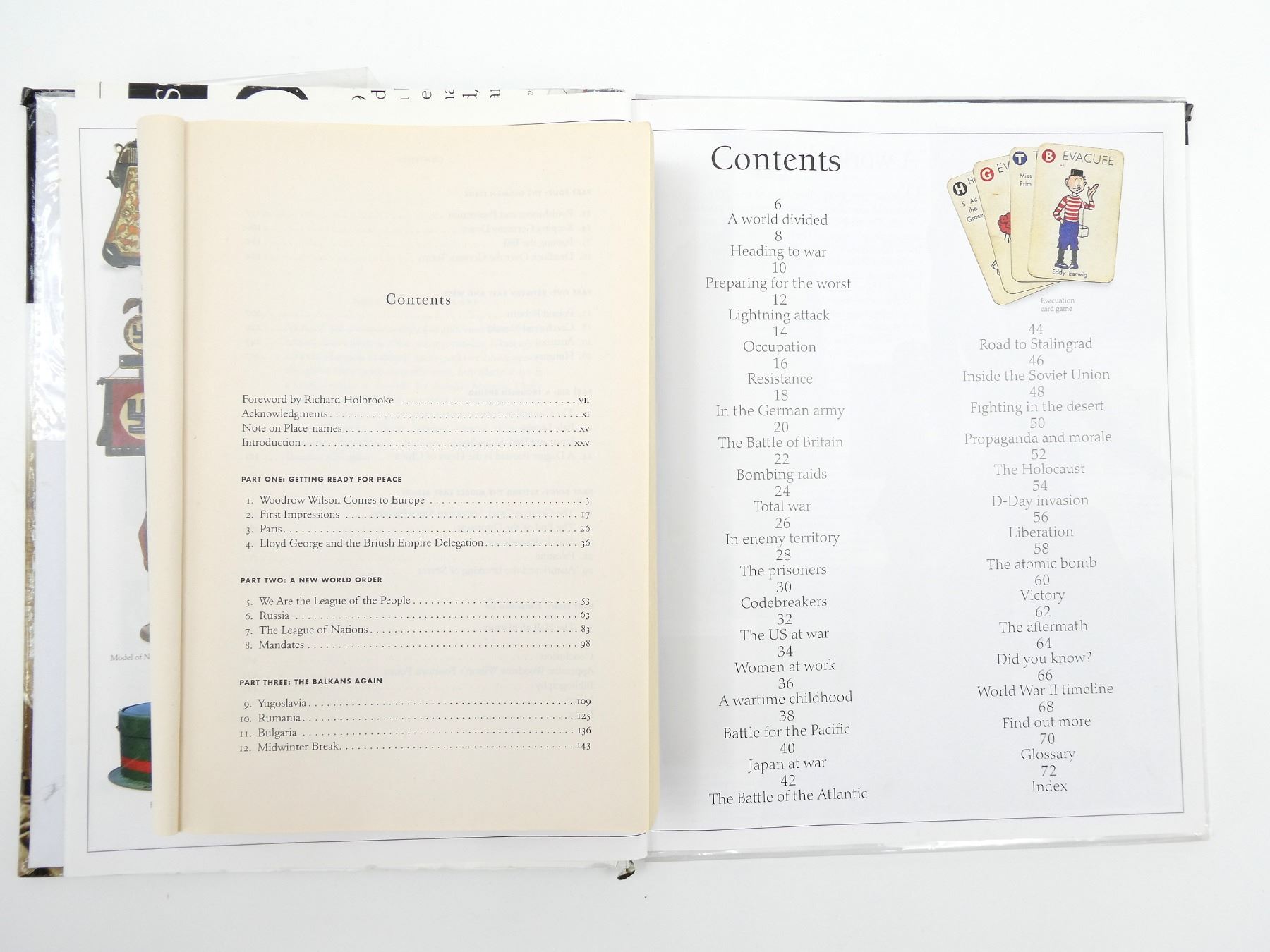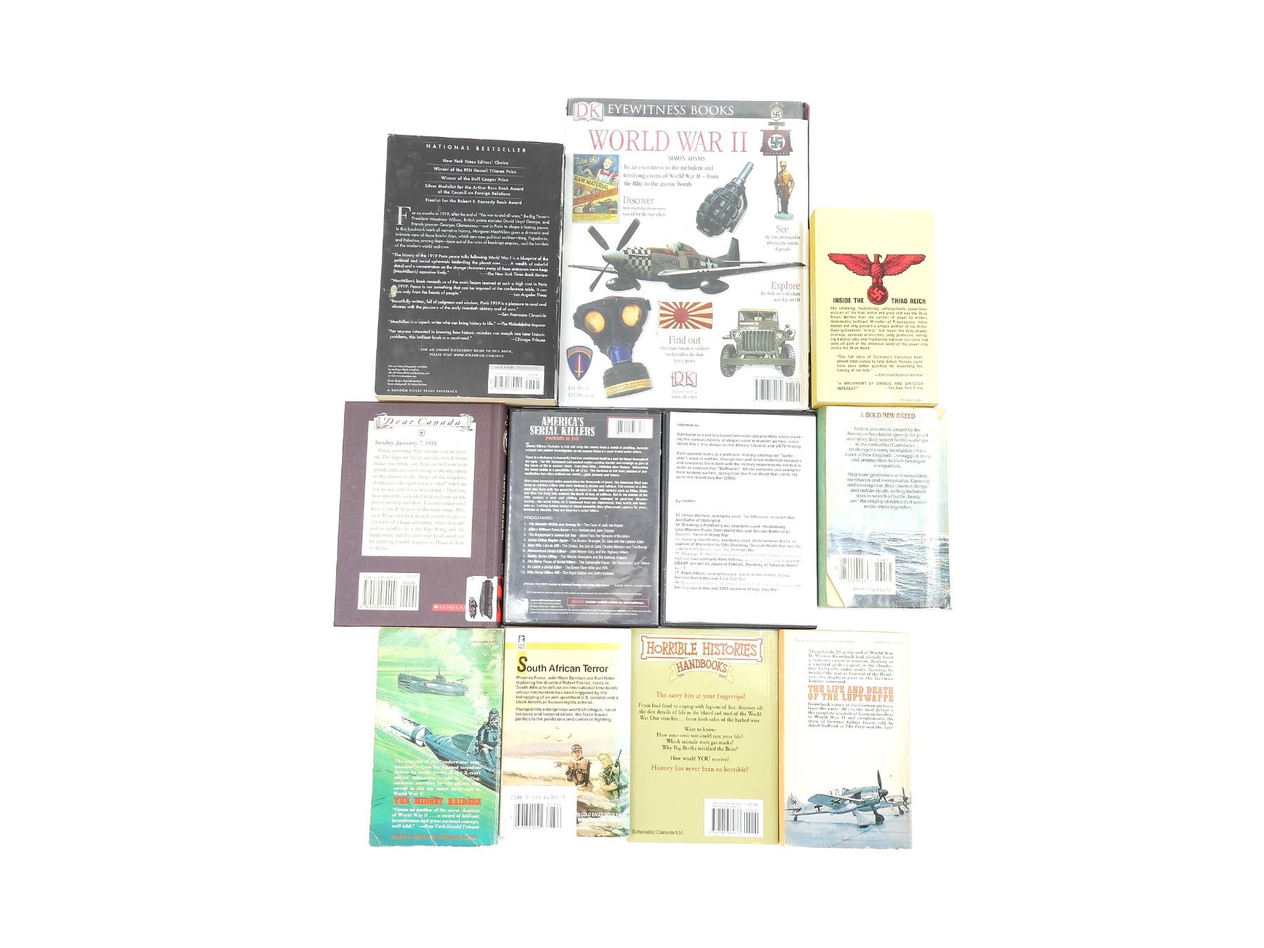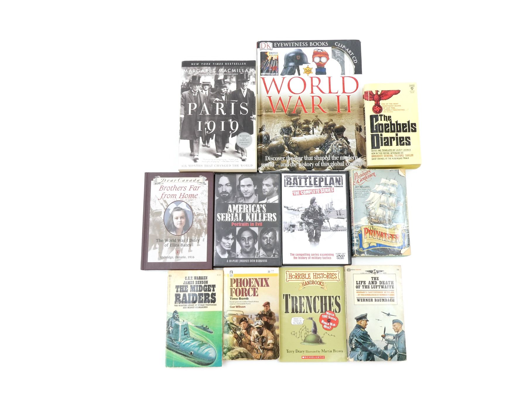 LOT INCLUDES; (1) "EYEWITNESS WORLD WAR II" BOOK BY SIMON ADAMS, HARD COVER, ISBN: 978-0-7566-3008-9, (1) "PARIS 1919" BOOK BY MARGARET MACMILLAN, SOFT COVER, ISBN: 0-375-76052-0, (1) "DEAR CANADA, BROTHER FAR FROM HOME" BOOK BY JEAN LITTLE, HARD COVER, ISBN: 0-439-96900-X, (1) "HORRIBLE HISTORIES HANDBOOKS, TRENCHES" BOOK BY TERRY DEARY, SOFT COVER, ISBN: 978-0-545-98567-3, (1) "THE GOEBBELS DIARIES" BOOK BY LOUIS P. LOCHNER, SOFT COVER, COPYRIGHT 1971, (1) "THE MIDGET RAIDERS" BOOK BY G.E.T. WARREN & JAMES BENSON, SOFT COVER, SBN: 345-03035-4-125, (1) "PHOENIX FORCE TIME BOMB" BOOK BY GAR WILSON, SOFT COVER, ISBN: 0-373-61322-9, (1) "THE LIFE AND DEATH OF THE LUFTWAFFE" BOOK BY WERNER BAUMBACH, SOFT COVER, 1967, (1) "THE PRIVATEER" BOOK BY JON WILLIAMS, SOFT COVER, ISBN: 0-440-16811-2 & (2) DVDS, UN-TESTED, MAY NOT BE COMPLETE. SEE PHOTOS.
