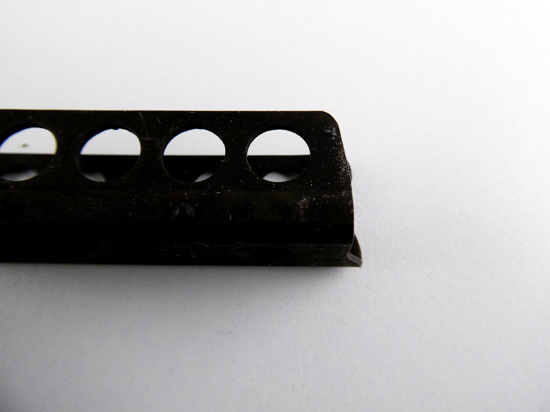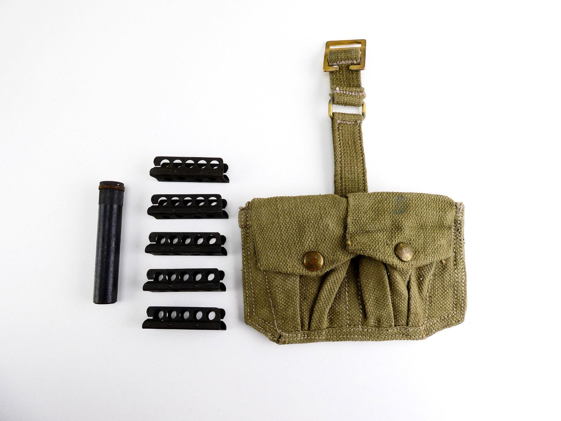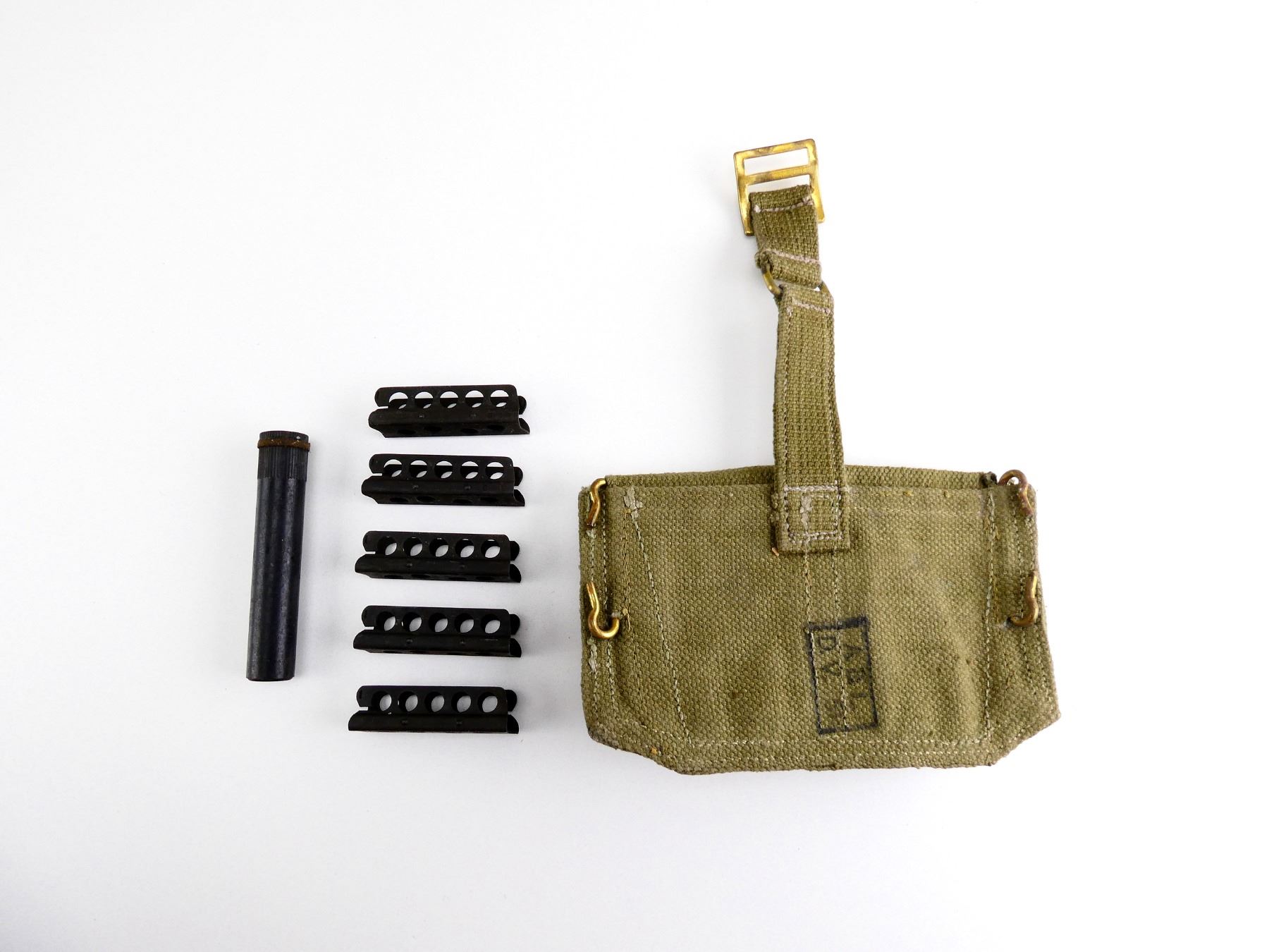 LOT INCLUDES; (1) BELGIAN LEE ENFIELD GREEN CANVAS AMMO POUCH, MARKED: "A.B.L., D.V., '51", 2-POCKET WITH METAL BELT HOOKS, (1) BLACK POLYMER OILER, TIP OF SPOON BROKEN & (5) .303 BR STRIPPER CLIPS, 5-RND, BLUED STEEL, VARIOUS MARKINGS. SEE PHOTOS.