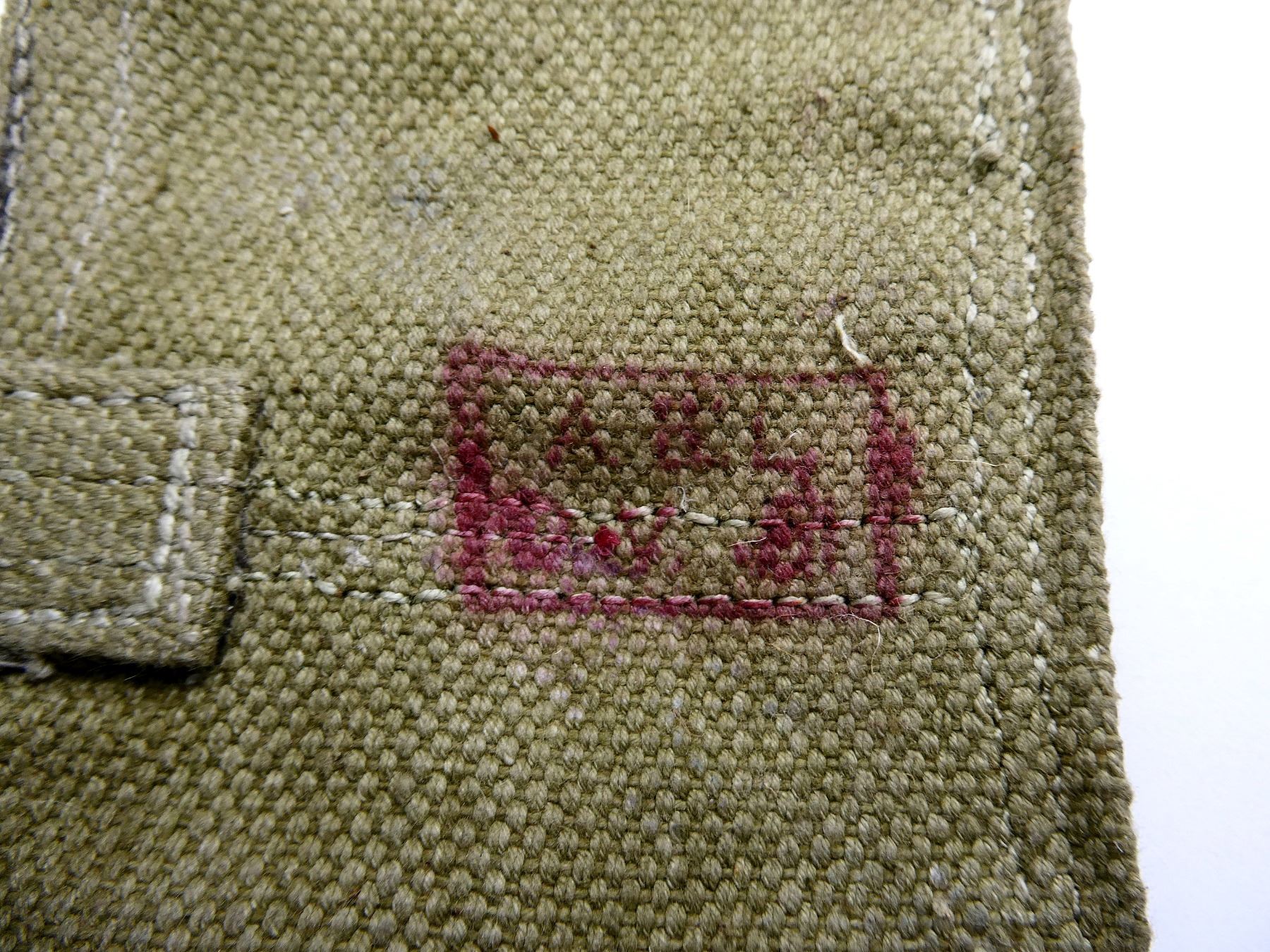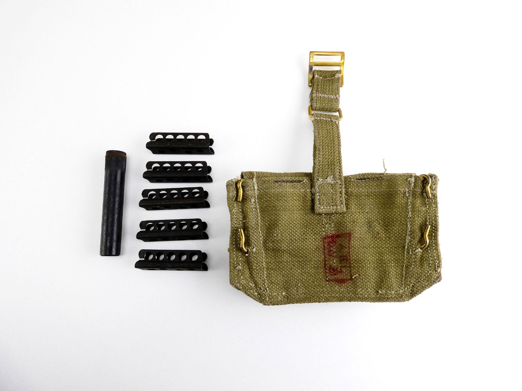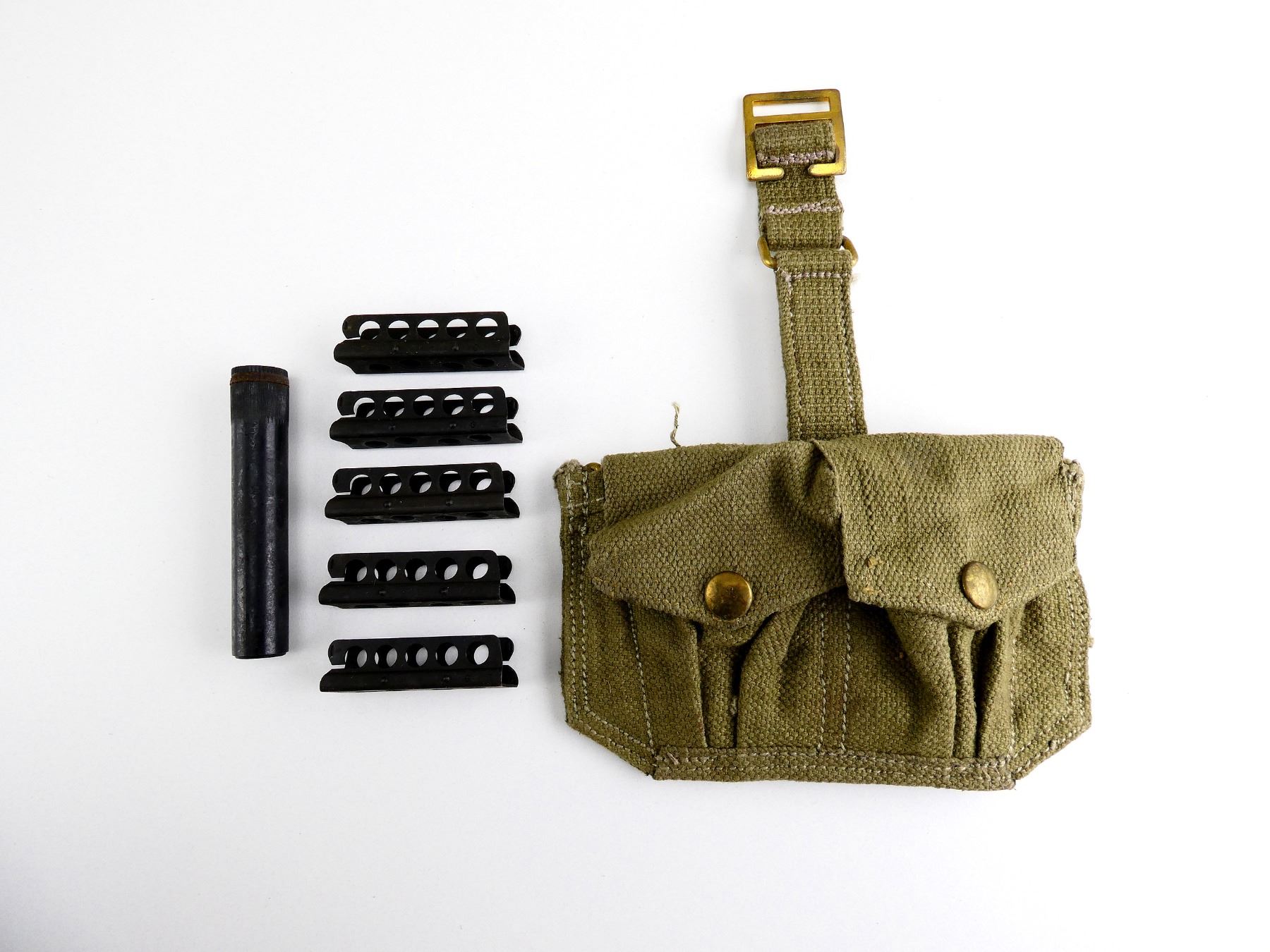 LOT INCLUDES; (1) BELGIAN LEE ENFIELD GREEN CANVAS AMMO POUCH, MARKED: "A.B.L., D.V., '51", 2-POCKET WITH METAL BELT HOOKS, (1) BLACK POLYMER OILER & (5) .303 BR STRIPPER CLIPS, 5-RND, BLUED STEEL, VARIOUS MARKINGS. SEE PHOTOS.