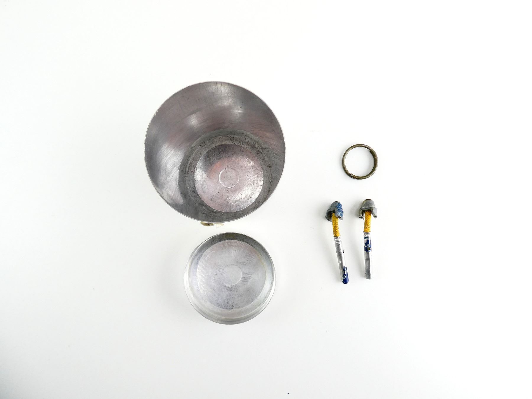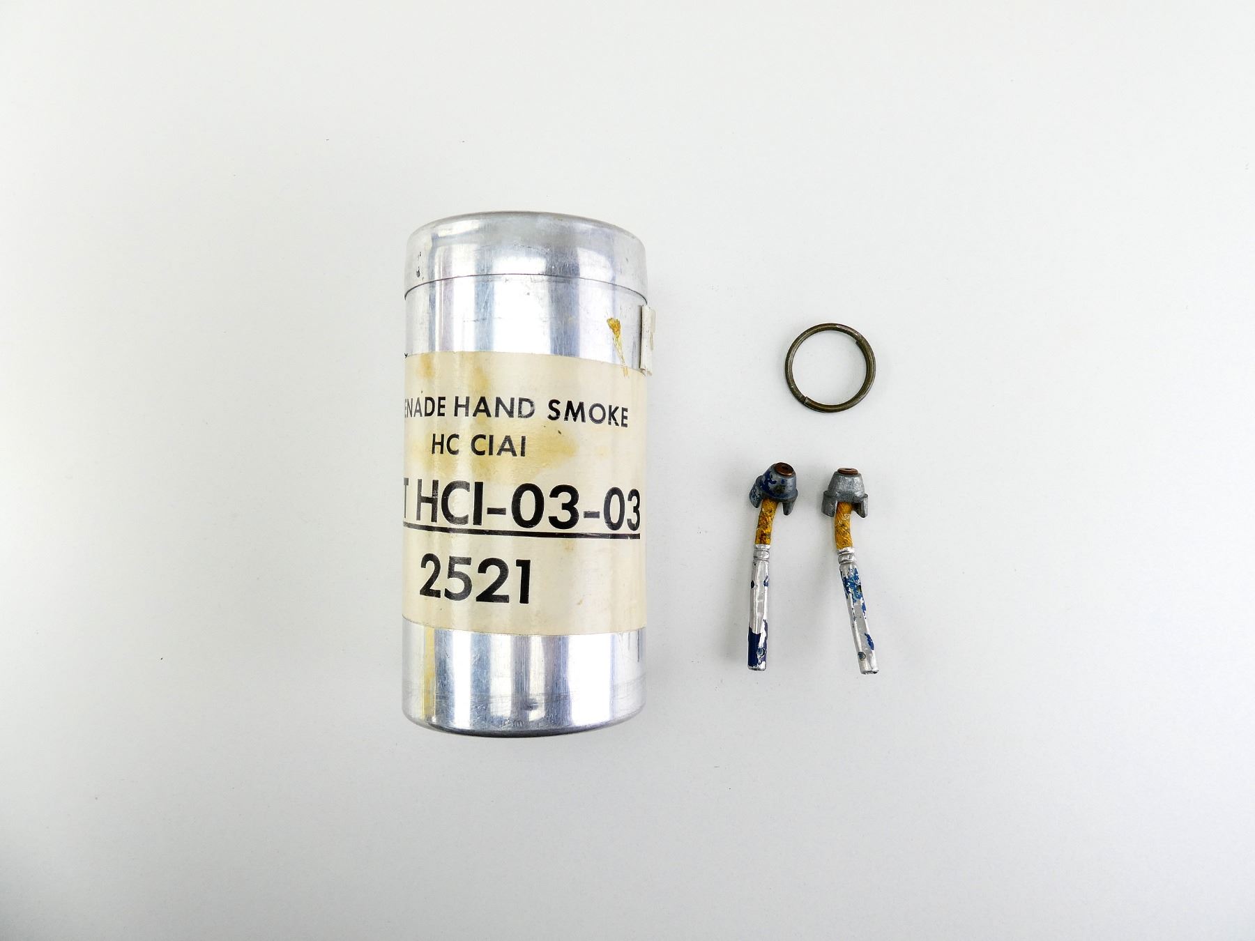 LOT INCLUDES; (2) BRITISH MILITARY MILLS BOMB DUMMY FUZES, MARKED: "DRILL, III", OALS APPROX. 2 7/8", (1) GREEN PAINTED PULL RING & (1) CANADIAN MILITARY ALUMINUM SMOKE GRENADE CANISTER, MARKED: "GRENADE HAND SMOKE HC C1A1, LOT HCI-03-03, 2521", APPROX. 2 7/8" DIA. & OAL APPROX. 5 5/8". SEE PHOTOS.