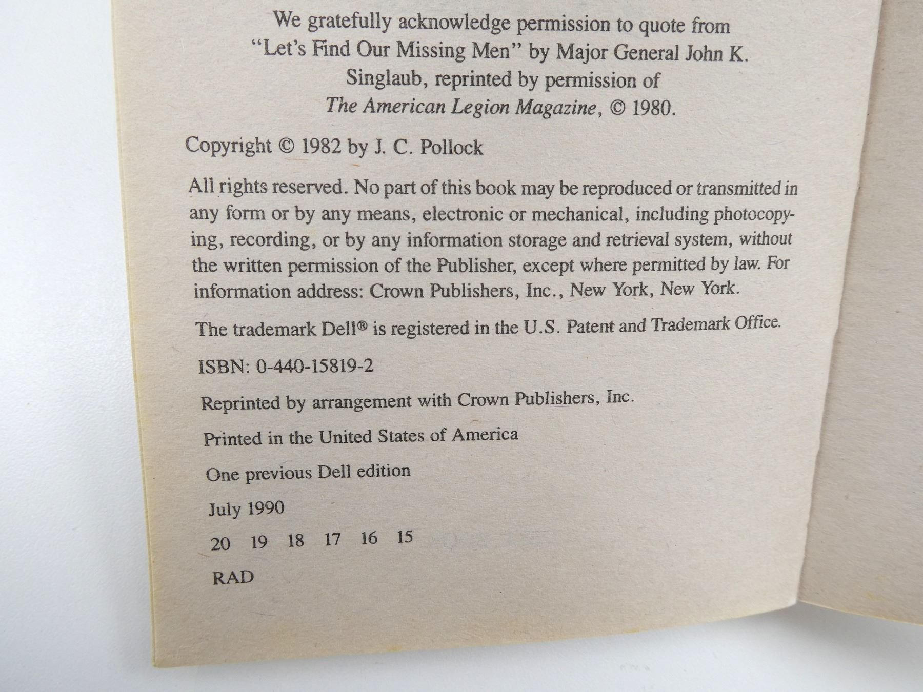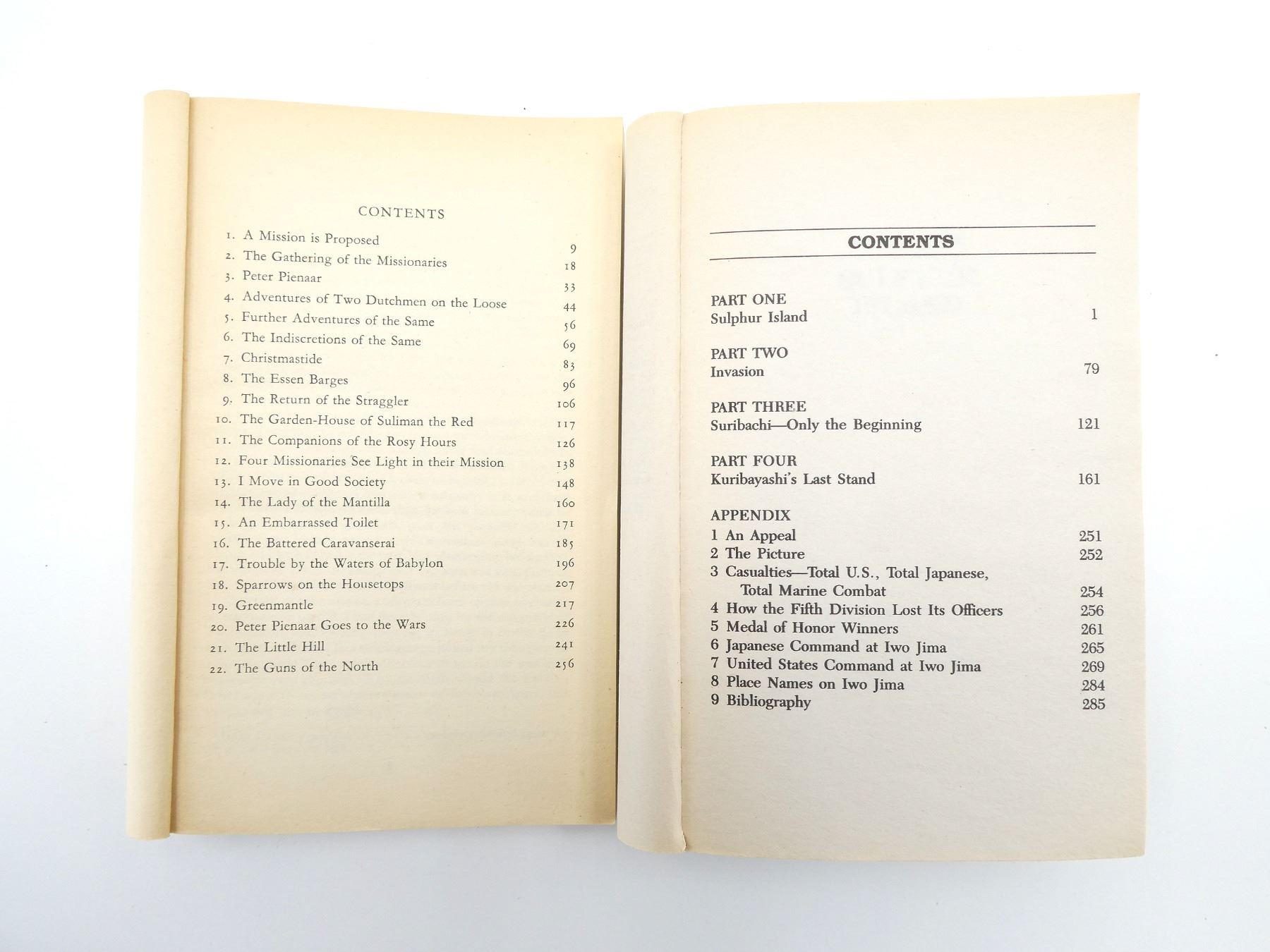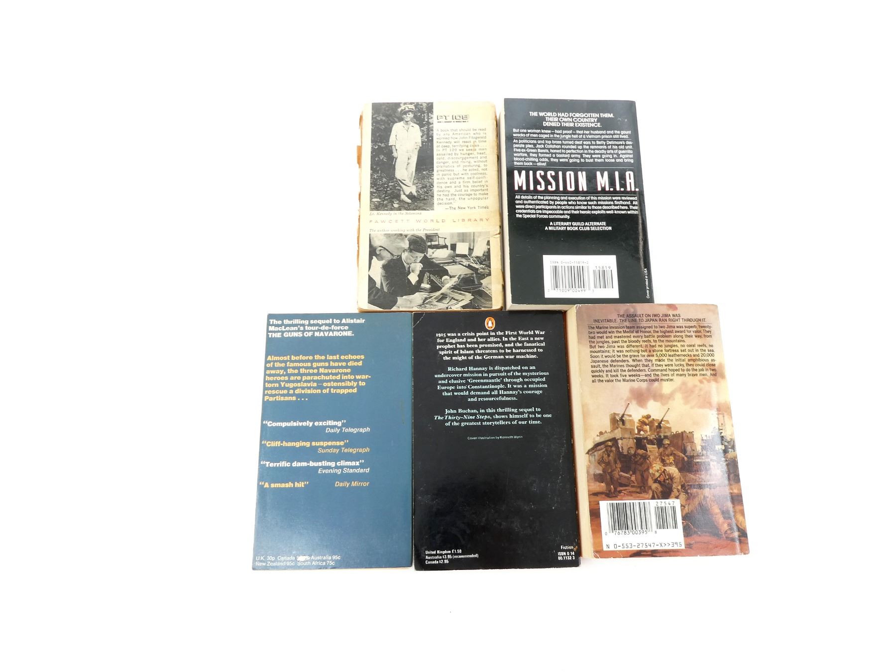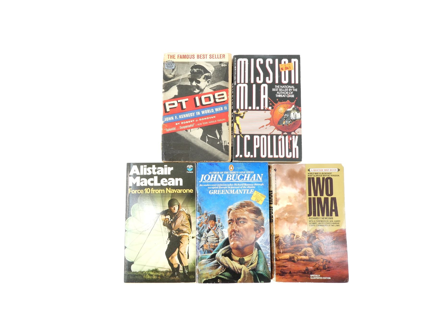 SOFT COVERS, LOT INCLUDES; (1) "IWO JIMA" BOOK BY RICHARD F. NEWCOMB, ISBN: 0-553-27547-X, (1) "MISSION M.I.A." BOOK BY J.C. POLLOCK, ISBN: 0-440-15819-2, (1) "PT 109, JOHN F. KENNEDY IN WORLD WAR II" BOOK BY ROBERT J. DONOVAN, (1) "FORCE 10 FROM NAVARONE" BOOK BY ALISTAIR MACLEAN, COPYRIGHT 1968 & (1) "GREENMANTLE" BOOK BY JOHN BUCHAN, ISBN: 0-14-00-1132-3. SEE PHOTOS.