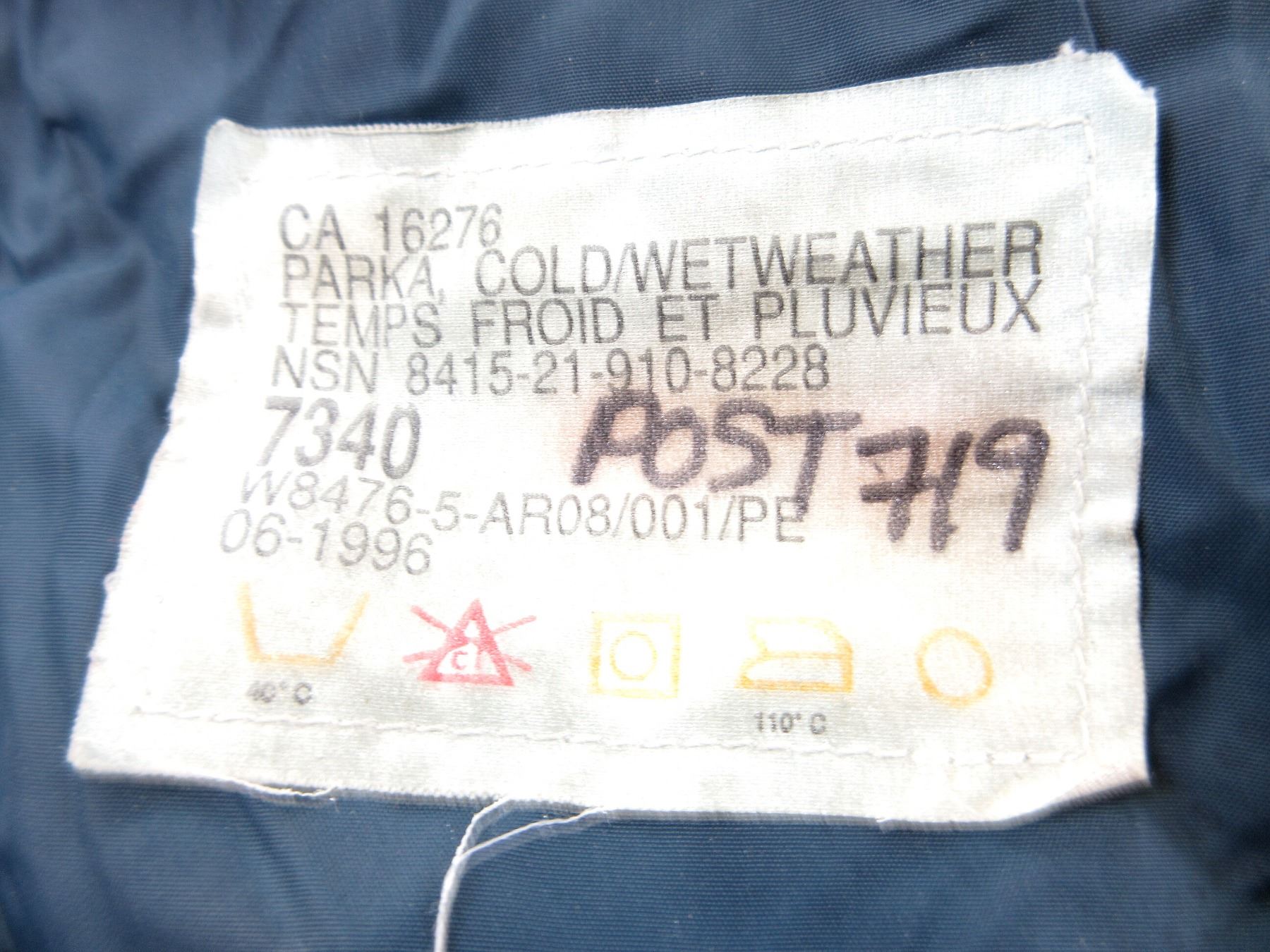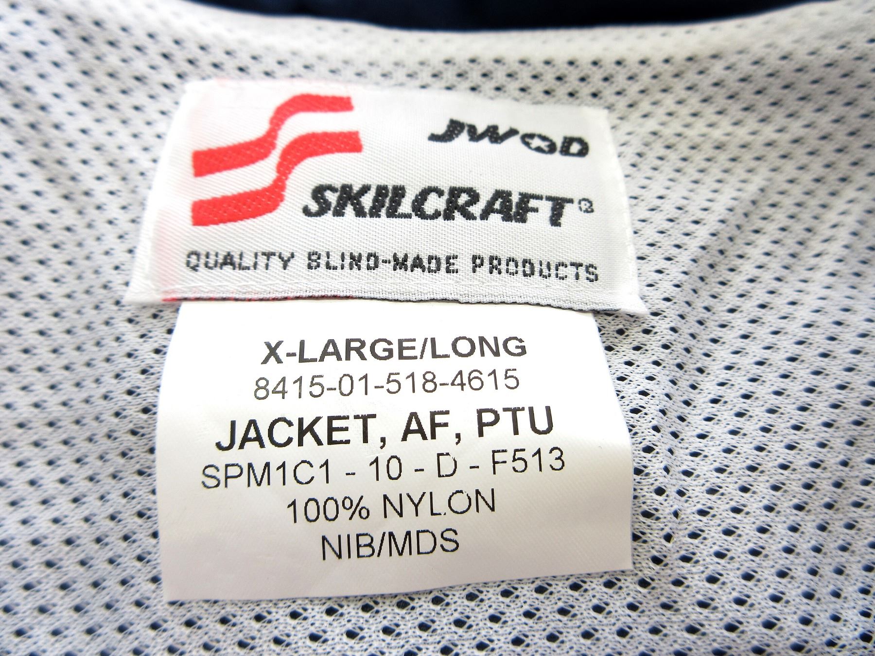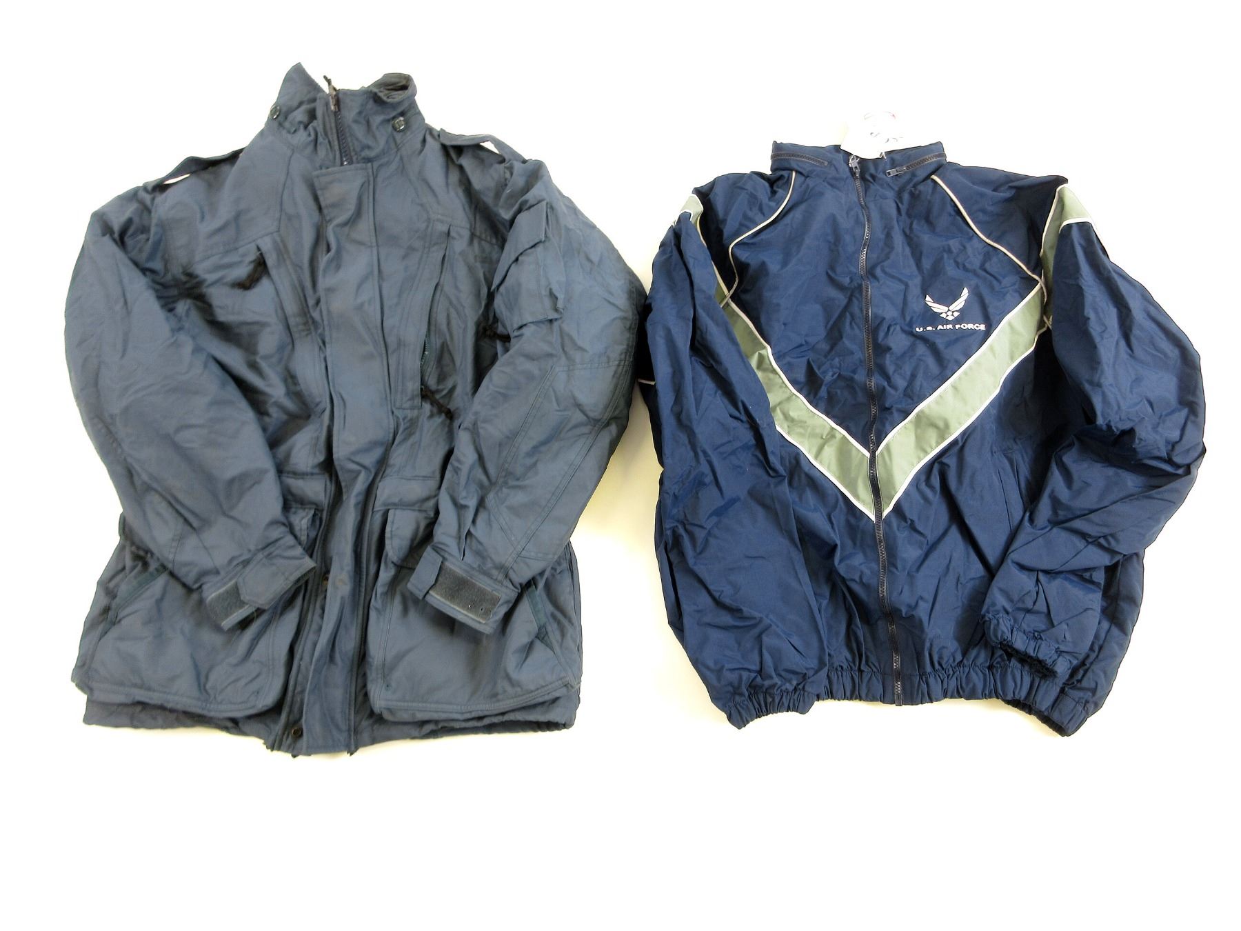LOT INCLUDES; (1) CANADIAN MILITARY BLUE COLD / WET WEATHER PARKA, SIZE MEDIUM-TALL, ZIPPERED-FLY (WORKS), VARIOUS MARKINGS, BUILT IN HOOD, SHOWS WEAR & (1) U.S. AIRFORCE PHYSICAL FITNESS TRAINING JACKET, SIZE XL-LONG, MARKED: "JWOD, SKILCRAFT, X-LARGE/LONG, 8415-01-518-4615, JACKET, AF, PTU" ETC. & VARIOUS OTHER MARKINGS, APPEARS NOS, TAGS STILL ATTACHED. SEE PHOTOS.