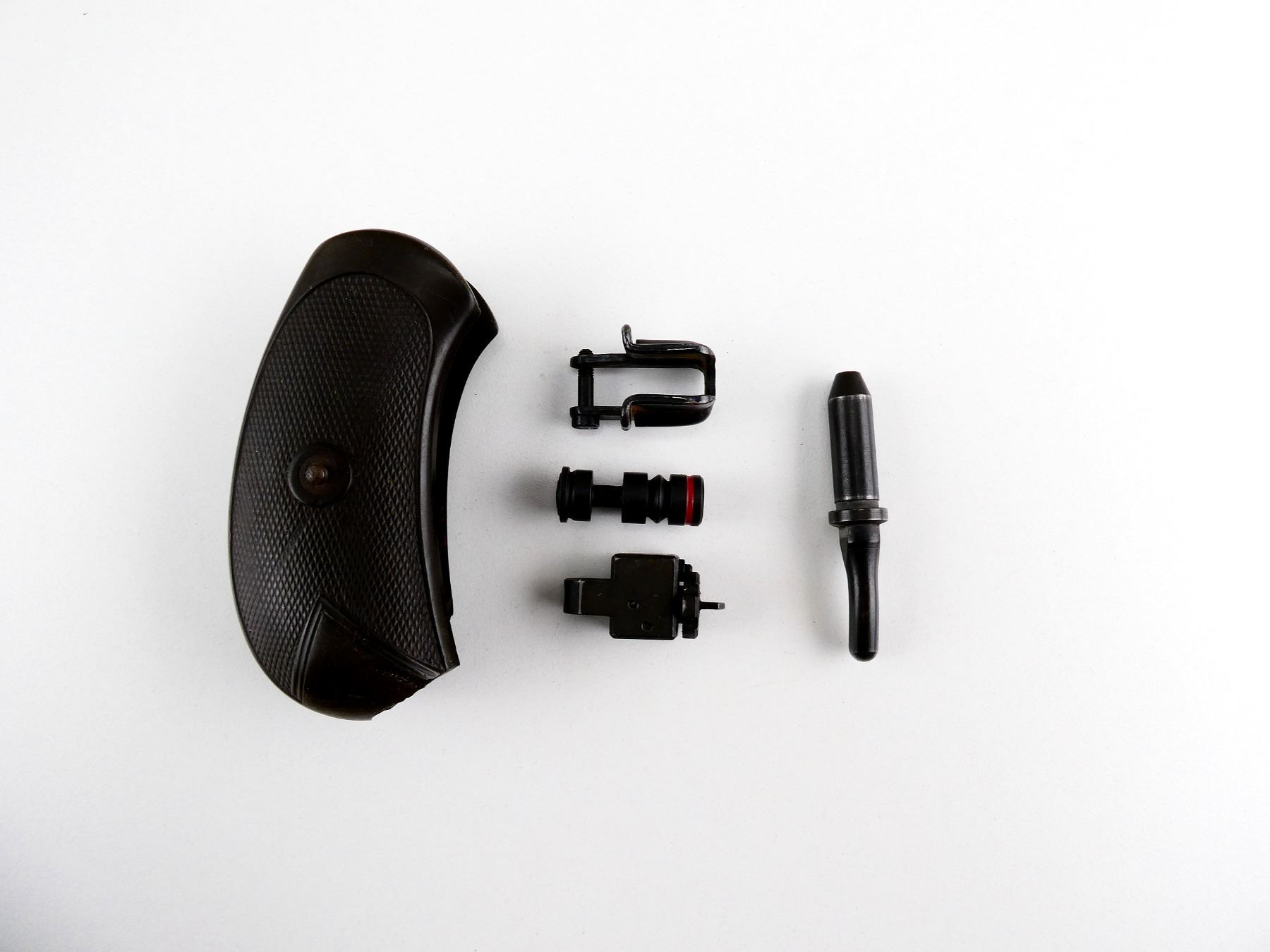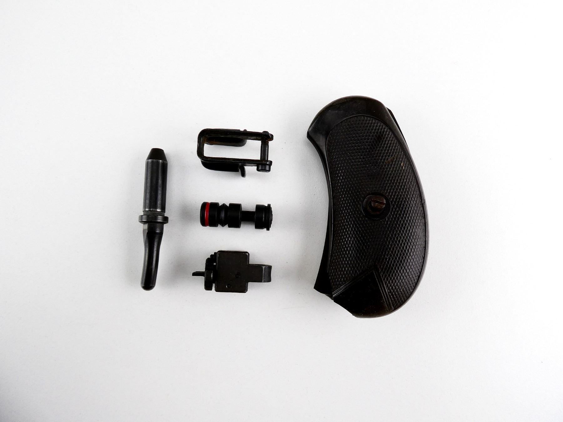 LOT INCLUDES; CZECH MAUSER FRONT SIGHT COVER, CANADIAN C1 SMG COCKING HANDLE, C9 SAFETY, 1919 A4 FRONT SIGHT, WEBLEY BIRDSHEAD GRIPS WITH SCREW (GRIPS CHIPPED), ETC. MAY REQUIRE FITTING. SEE PHOTOS.