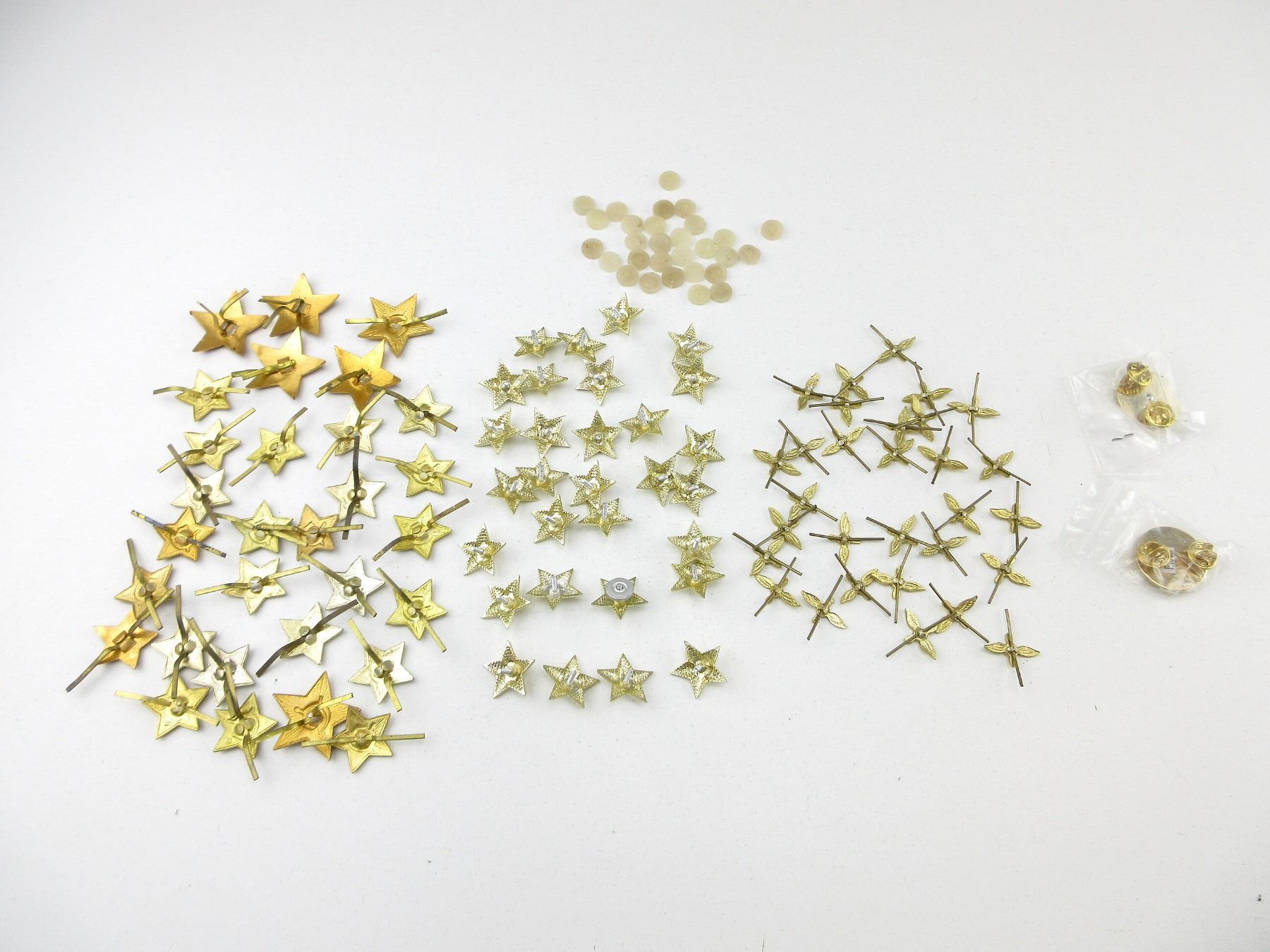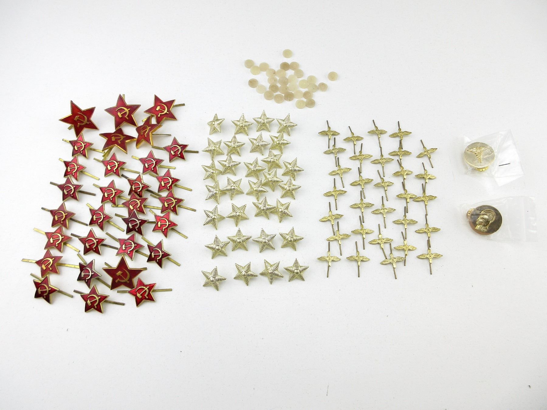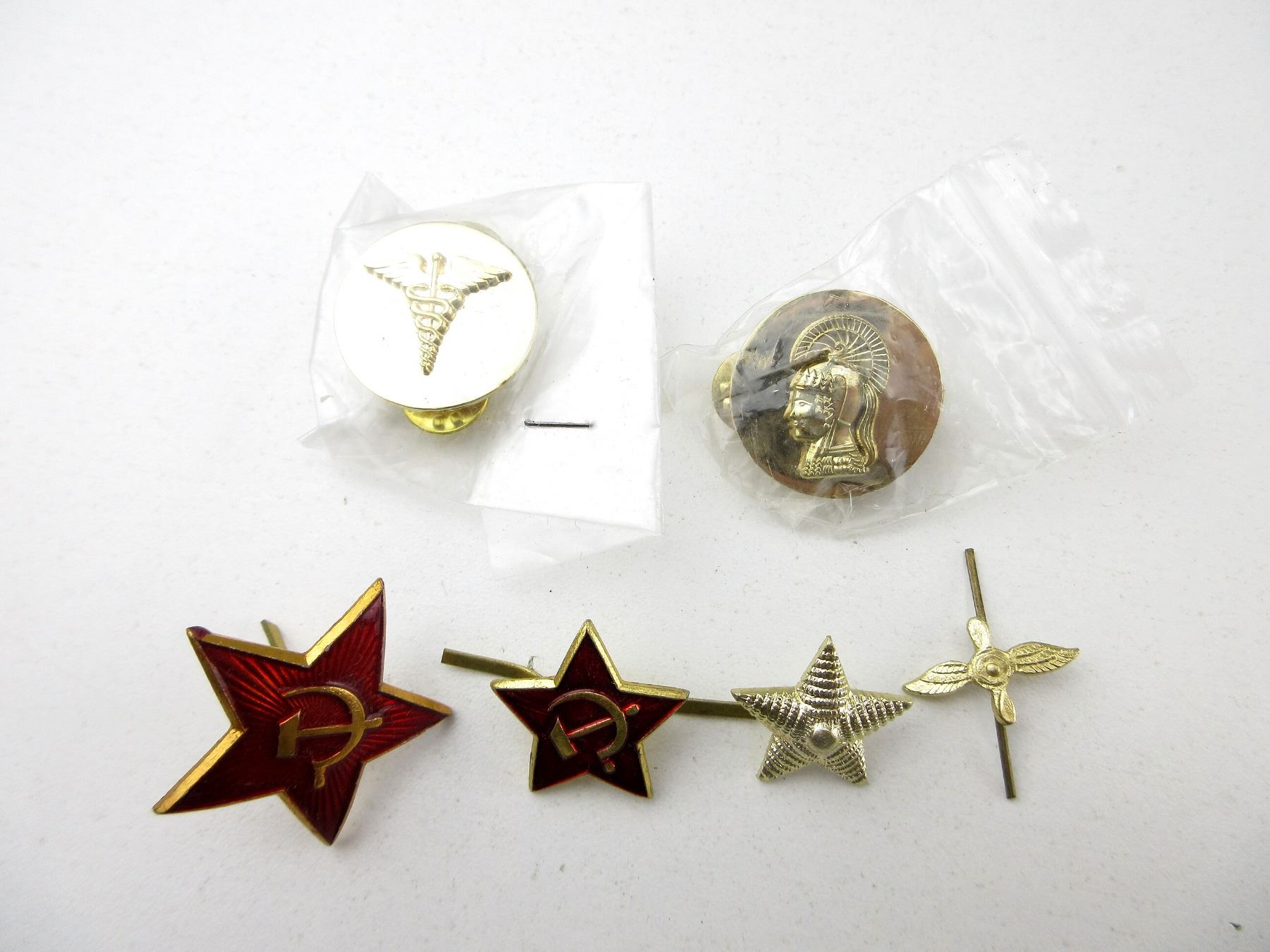 LOT INCLUDES; APPROX. (30) RUSSIAN / COMBLOC RED ENAMELED STARS WITH HAMMER & SICKLE DESIGN BRASS PINS, APPROX. (30) COMBLOC STARS WITH LUG STYLE BACKING, APPROX. (30) RUSSIAN / COMBLOC AIRFORCE PINS, (1) UNKNOWN MILITARY BRASS MEDICAL SYMBOL PIN & (1) UNKNOWN MILITARY BRASS KNIGHT'S HEAD PIN. SEE PHOTOS.