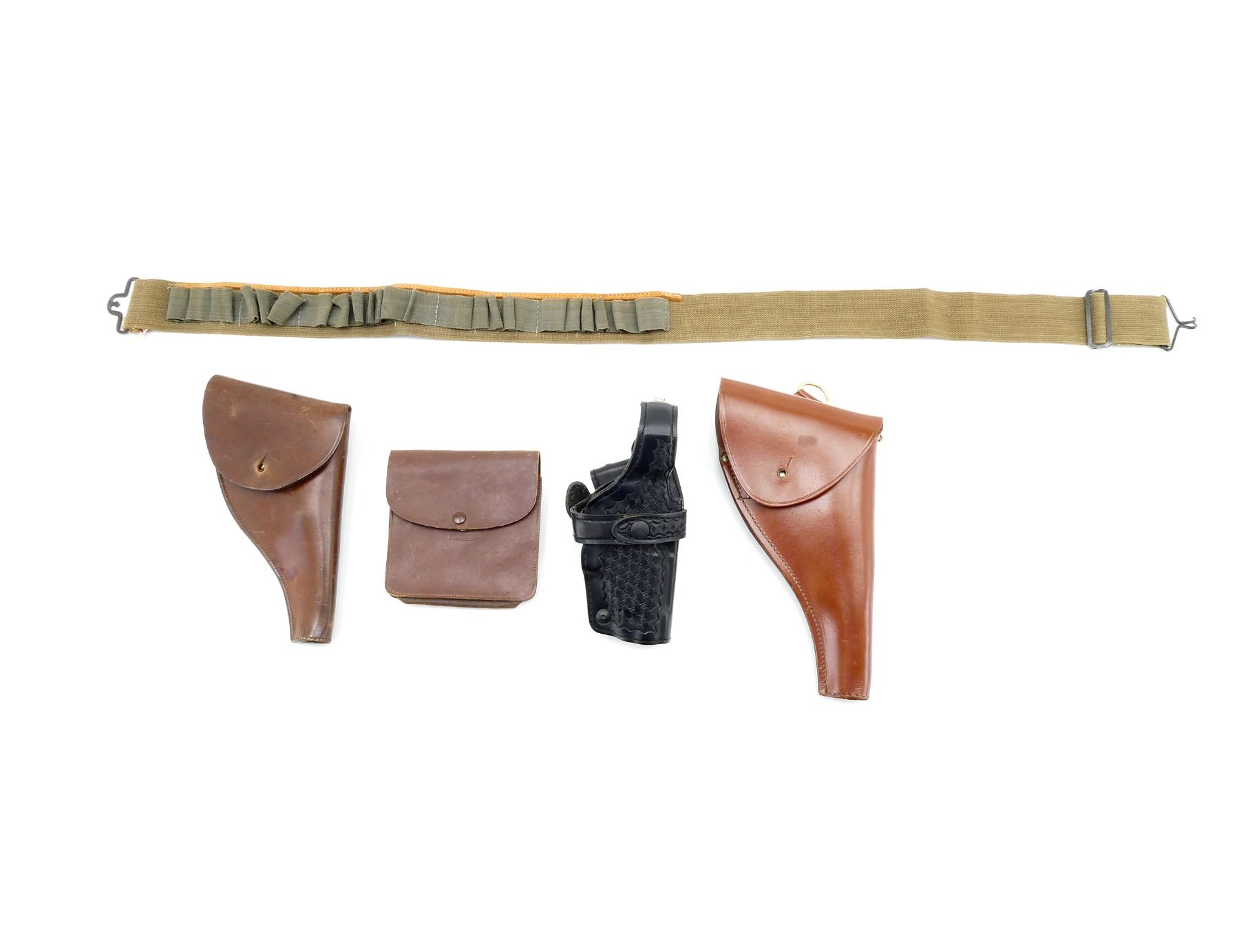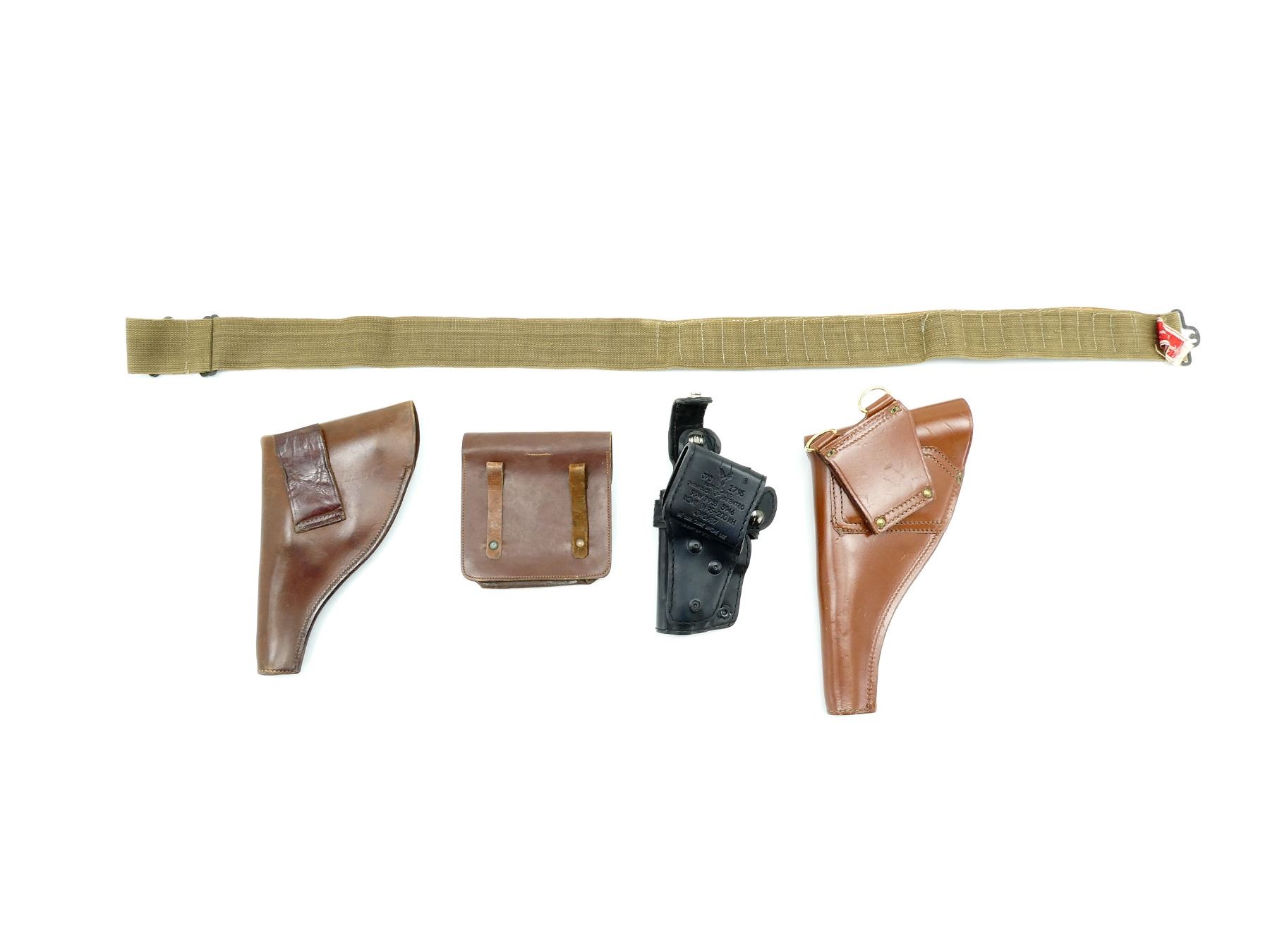 LOT INCLUDES; (4) CANVAS / BROWN LEATHER SLINGS, THREE HAVE NO VISIBLE MARKINGS, ONE MARKED: "ARMSAN", METAL / BRASS FITTINGS, ALL SHOW AGE / WEAR, OALS APPROX. 27" TO 51.75" & (2) BROWN LEATHER BELTS, ONE HAS NO VISIBLE MARKINGS, OTHER MARKED: "W. SOHM, SATTLER, JRSENBACH, 82", BOTH SHOW AGE / WEAR, OALS APPROX. 39.75" & 70.5". SEE PHOTOS.