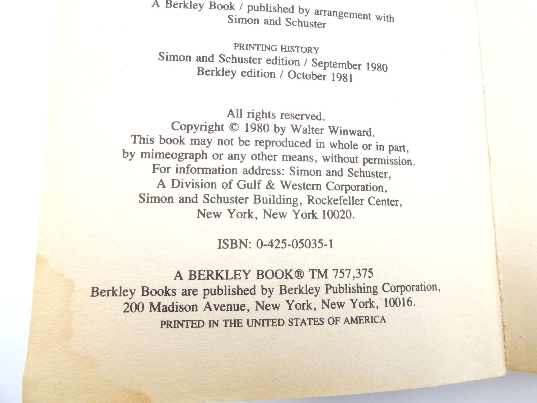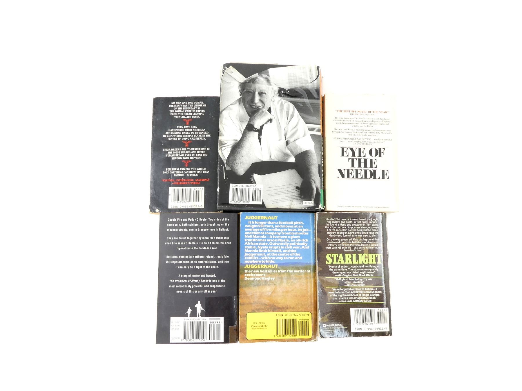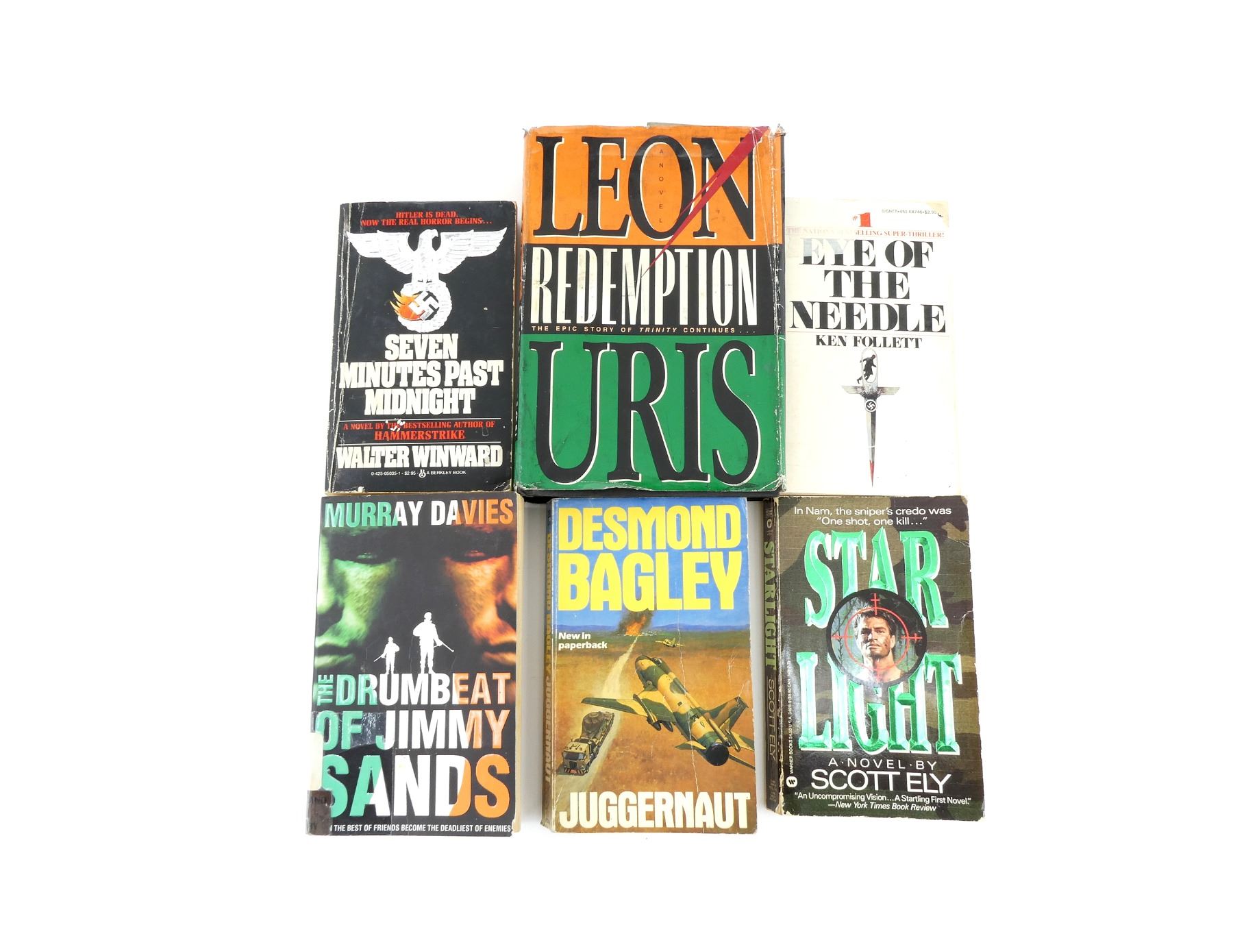 LOT INCLUDES; (1) "SEVEN MINUTES PAST MIDNIGHT" BOOK BY WALTER WINWARD, SOFT COVER, ISBN: 0-425-05035-1, (1) "EYE OF THE NEEDLE" BOOK BY KEN FOLLETT, SOFT COVER, COPYRIGHT 1978, (1) "STAR LIGHT" BOOK BY SCOTT ELY, SOFT COVER, ISBN: 0-446-34911-9, (1) "JUGGERNAUT" BOOK BY DESMOND BAGLEY, SOFT COVER, ISBN: 0-00-617250-4, (1) THE DRUMBEAT OF JIMMY SANDS" BOOK BY MURRAY DAVIES, SOFT COVER, ISBN: 0-00-651155-4 & (1) "REDEMPTION, THE EPIC STORY OF TRINITY CONTINUES…" BOOK BY LEON URIS, HARD COVER WITH DUST COVER, ISBN: 0-06-018333-0. SEE PHOTOS.