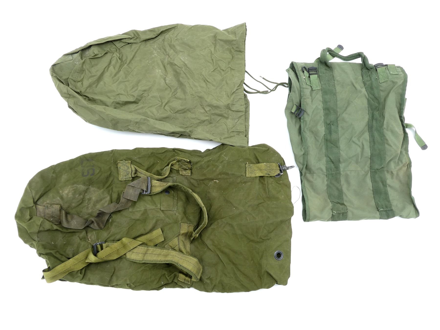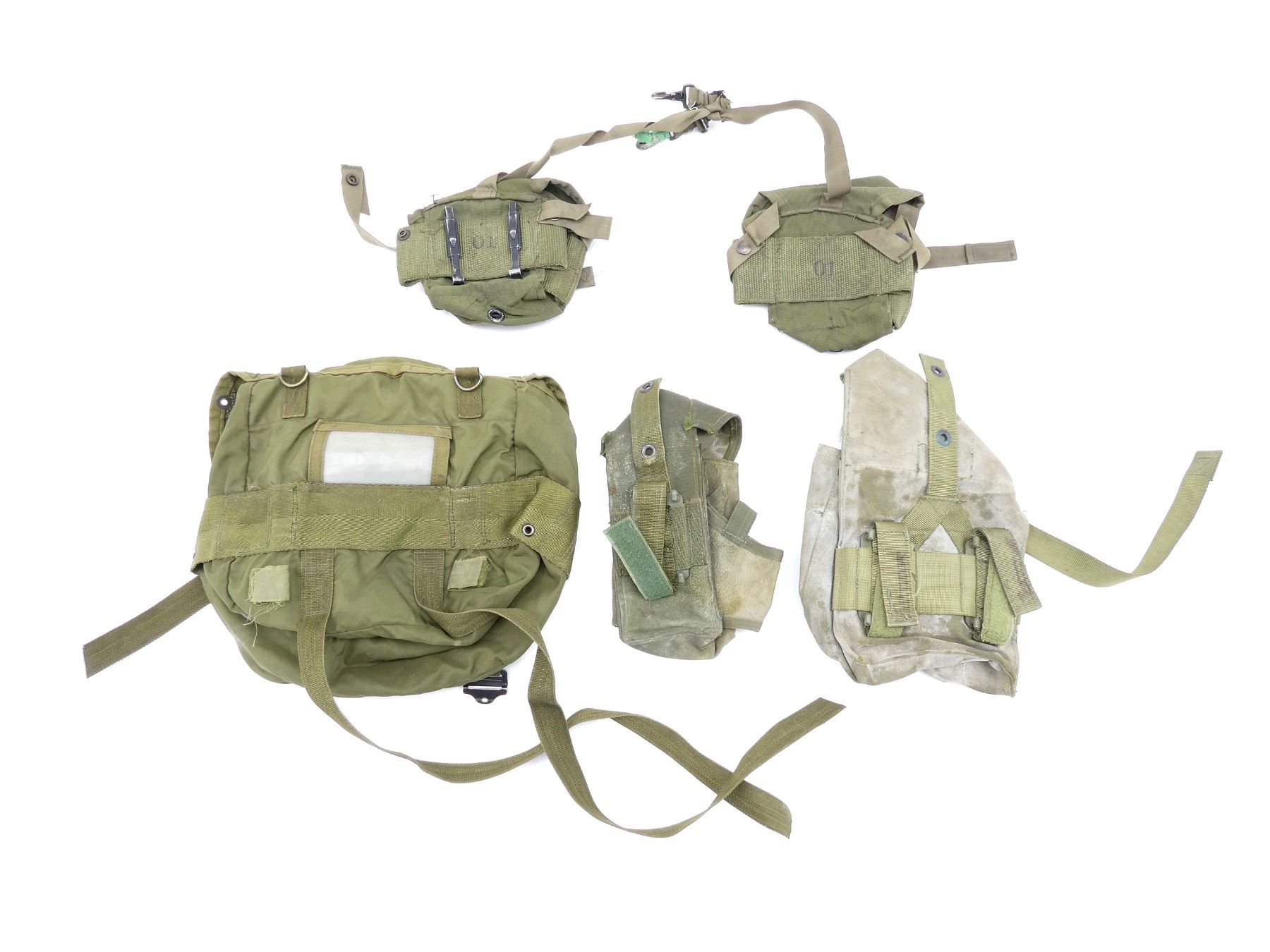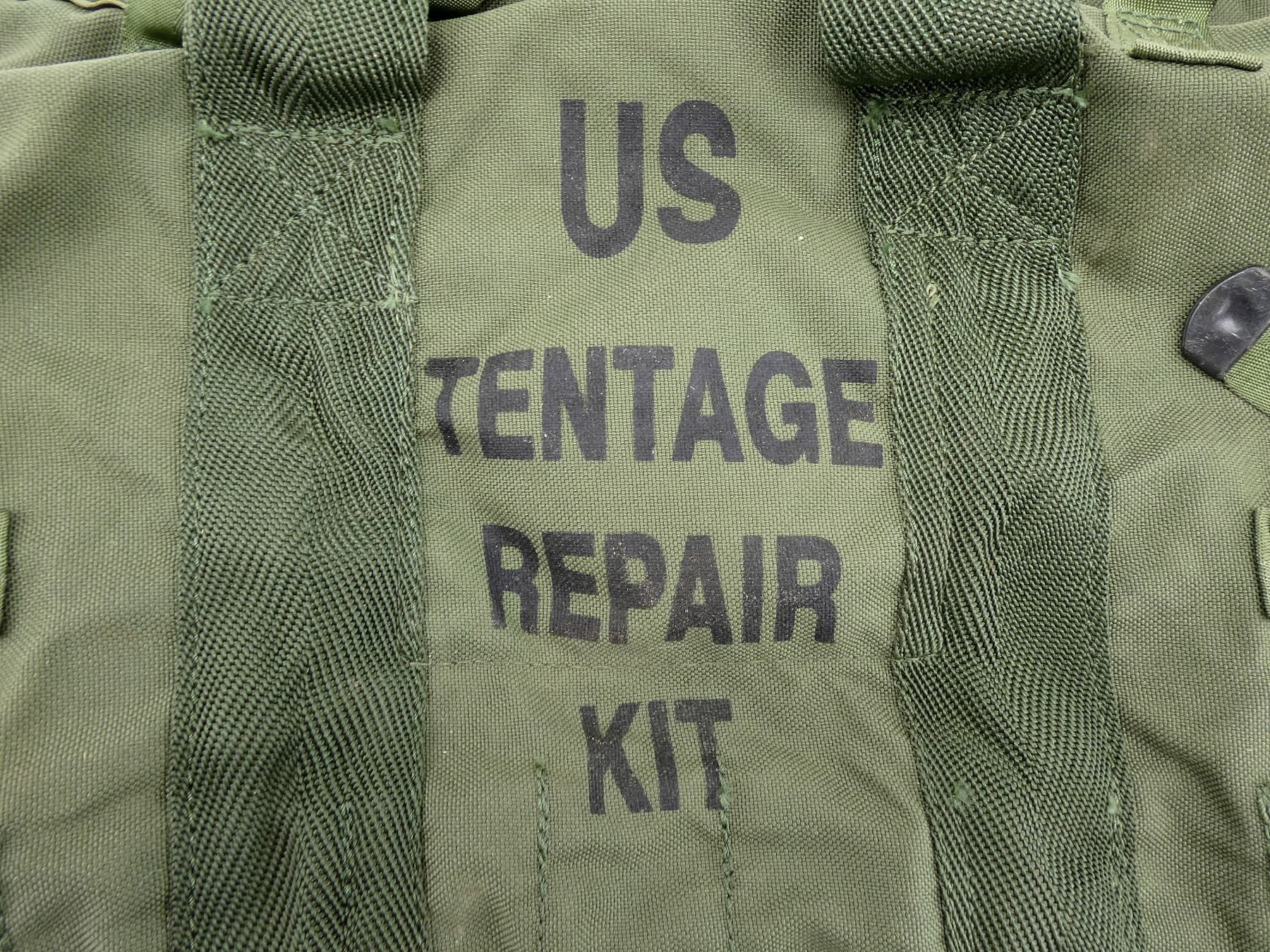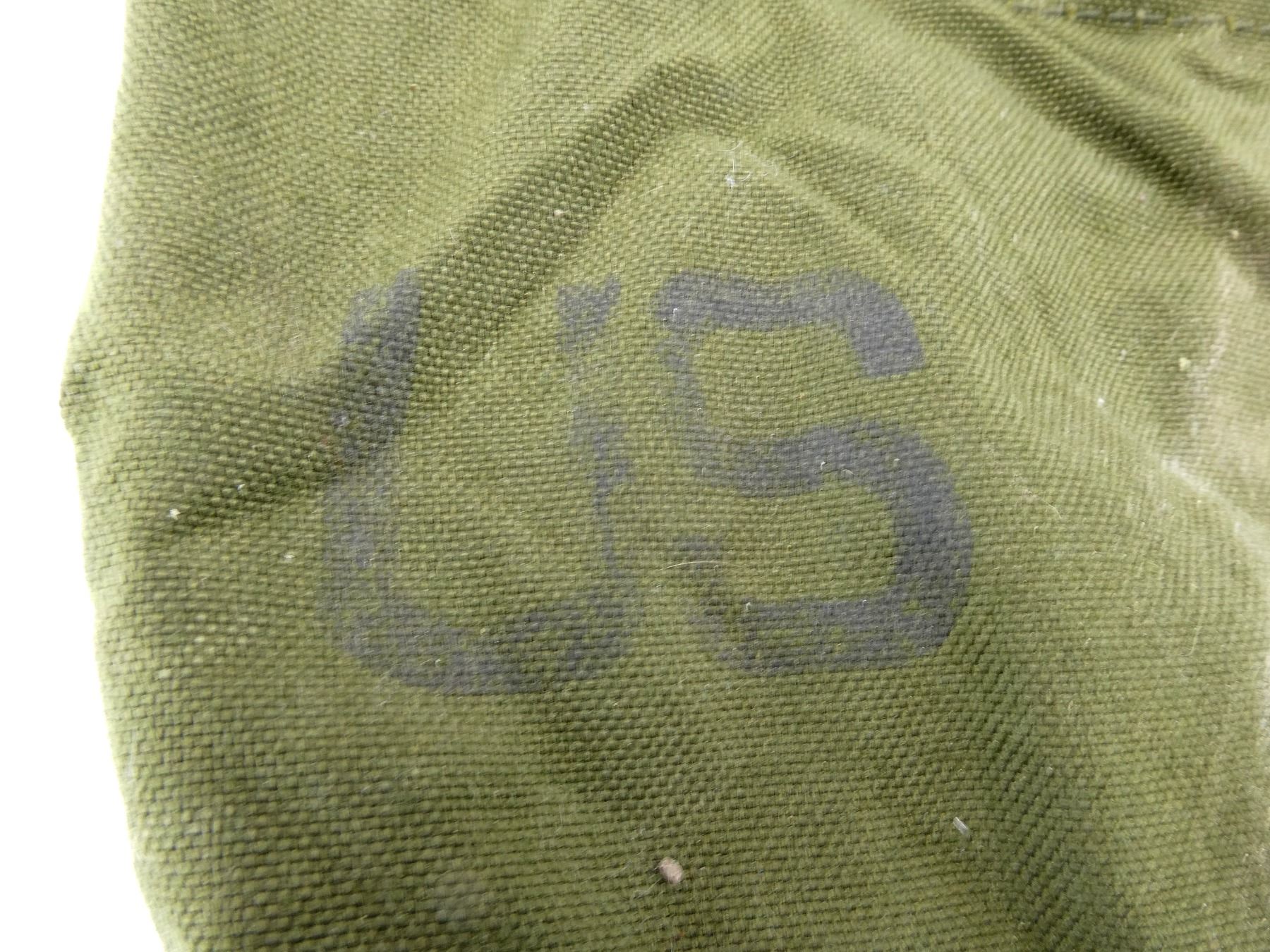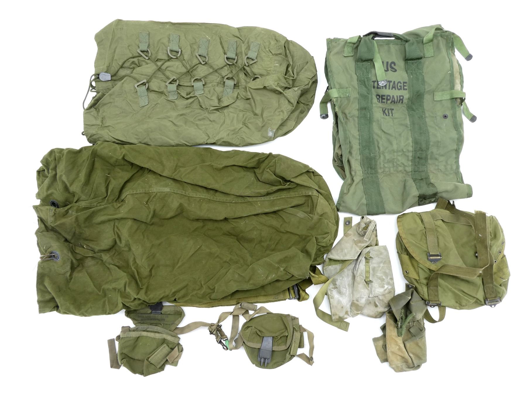 LOT INCLUDES; (1) CANADIAN MILITARY GREEN NYLON COLD WEATHER WATERPROOF SLEEPING BAG COVER, VARIOUS MARKINGS / LABELS, VARIOUS TIES, OAL APPROX. 25", (1) U.S. MILITARY GREEN NYLON DUFFLE BAG, MARKED: "US", WITH SHOULDER STRAPS / CARRY HANDLE, SHOWS AGE / WEAR, OAL APPROX. 35", (1) U.S. MILITARY GREEN NYLON TENT REPAIR TOOL ROLL (NO TOOLS), MARKED: "US, TENTAGE REPAIR KIT" & VARIOUS OTHER MARKINGS, VARIOUS POCKETS / STRAPS / CARRY HANDLES, SHOWS WEAR, OAL APPROX. 51.5", (4) U.S. MILITARY GREEN NYLON / RUBBERIZED CANVAS AMMO POUCHES, VARIOUS SIZES, VARIOUS MARKINGS, SHOWS AGE / WEAR & (1) U.S. MILITARY COMBAT FIELD PACK, VARIOUS FAINT MARKINGS, SHOWS AGE / WEAR. SEE PHOTOS.
