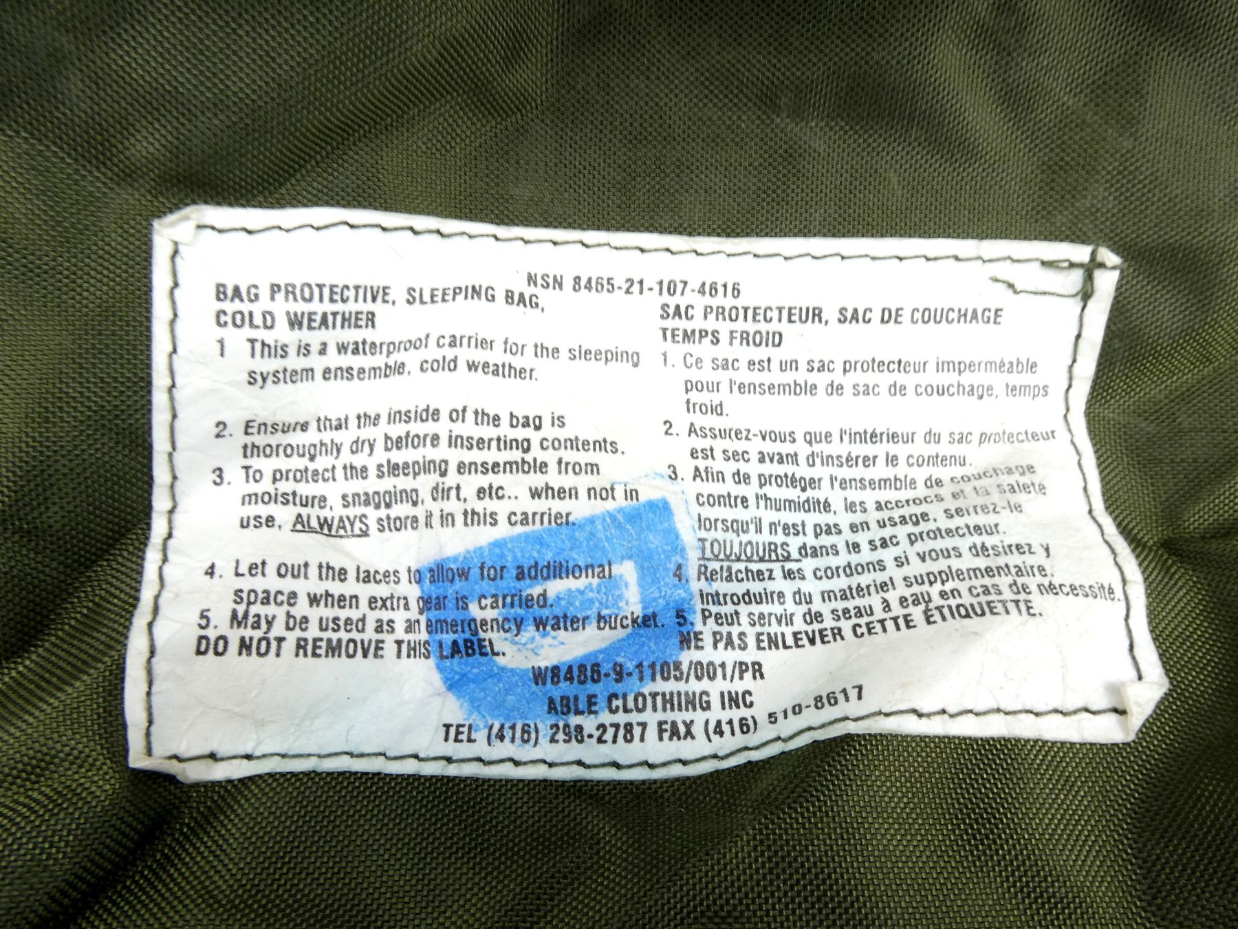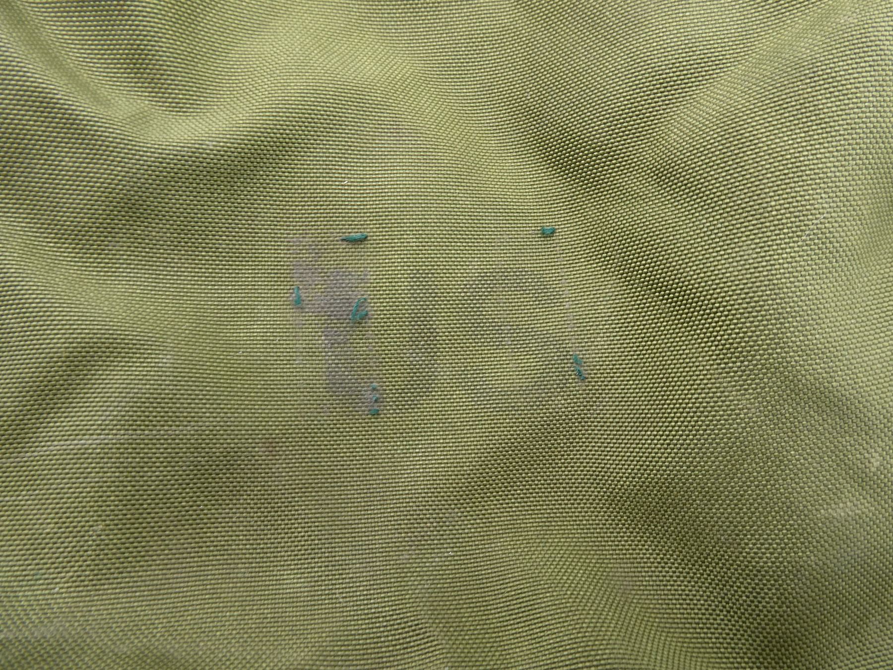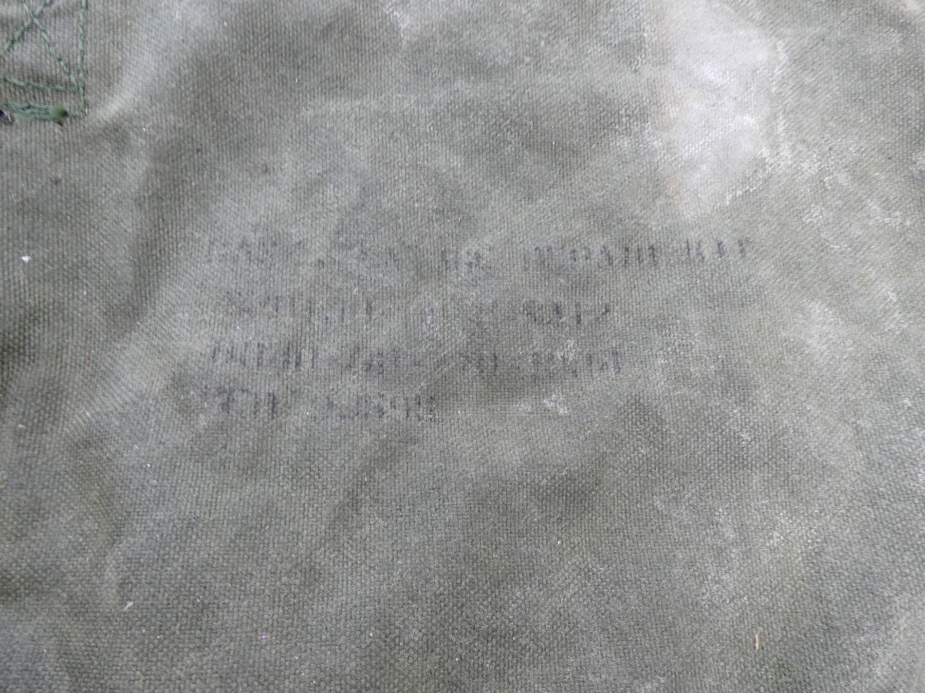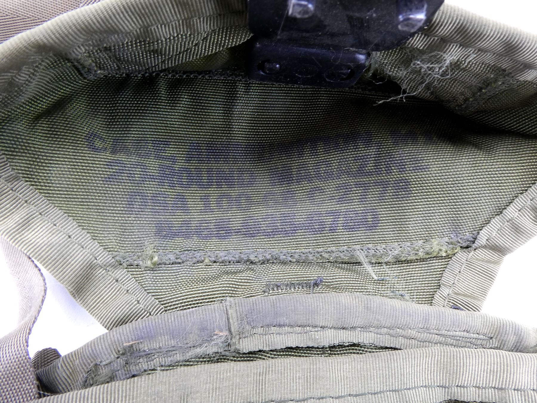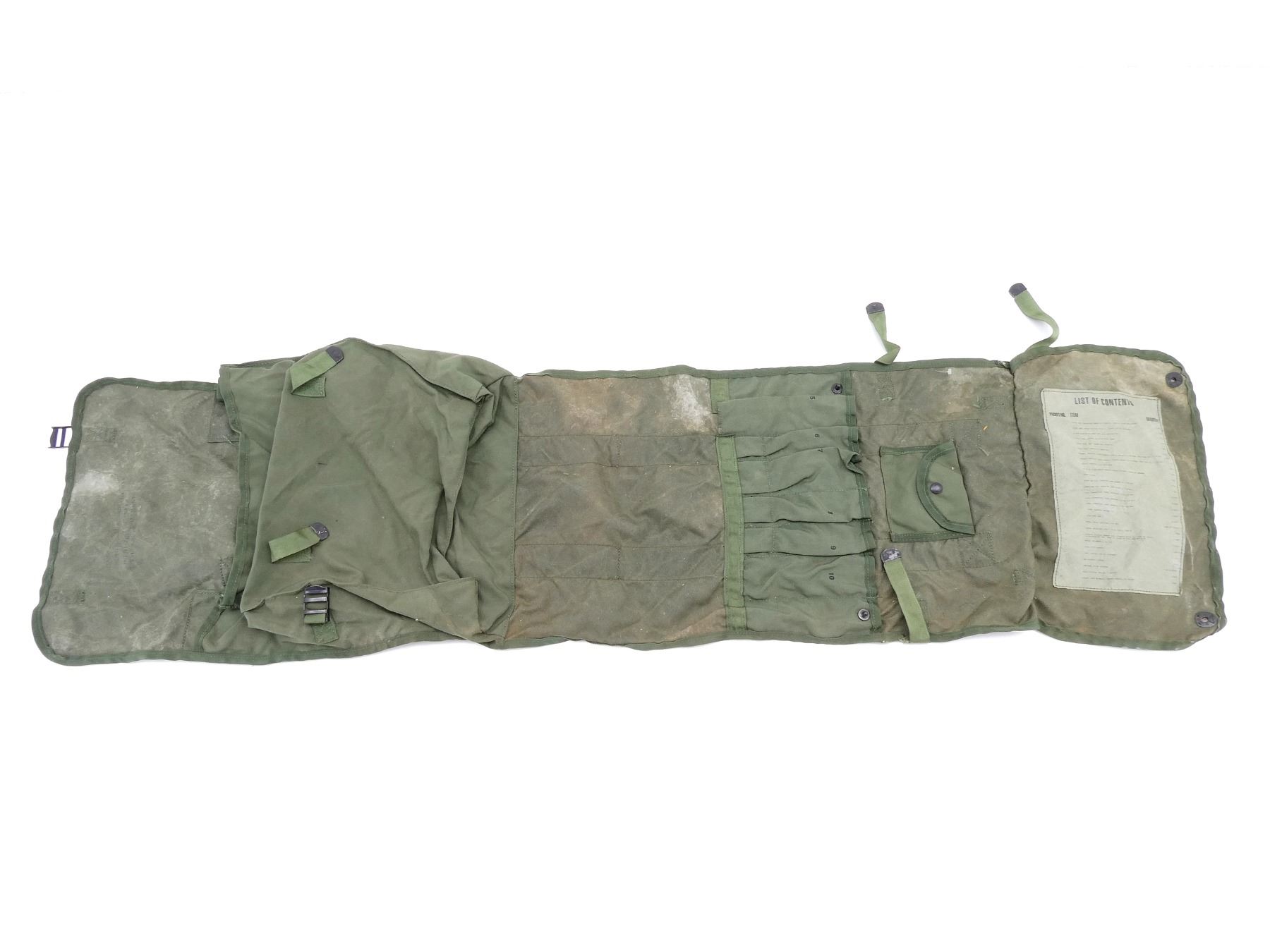 LOT INCLUDES; (1) CANADIAN MILITARY GREEN NYLON COLD WEATHER WATERPROOF SLEEPING BAG COVER, VARIOUS MARKINGS / LABELS, VARIOUS TIES, OAL APPROX. 25", (1) U.S. MILITARY GREEN NYLON DUFFLE BAG, MARKED: "US", WITH SHOULDER STRAPS / CARRY HANDLE, SHOWS AGE / WEAR, OAL APPROX. 35", (1) U.S. MILITARY GREEN NYLON TENT REPAIR TOOL ROLL (NO TOOLS), MARKED: "US, TENTAGE REPAIR KIT" & VARIOUS OTHER MARKINGS, VARIOUS POCKETS / STRAPS / CARRY HANDLES, SHOWS WEAR, OAL APPROX. 51.5", (4) U.S. MILITARY GREEN NYLON / RUBBERIZED CANVAS AMMO POUCHES, VARIOUS SIZES, VARIOUS MARKINGS, SHOWS AGE / WEAR & (1) U.S. MILITARY COMBAT FIELD PACK, VARIOUS FAINT MARKINGS, SHOWS AGE / WEAR. SEE PHOTOS.