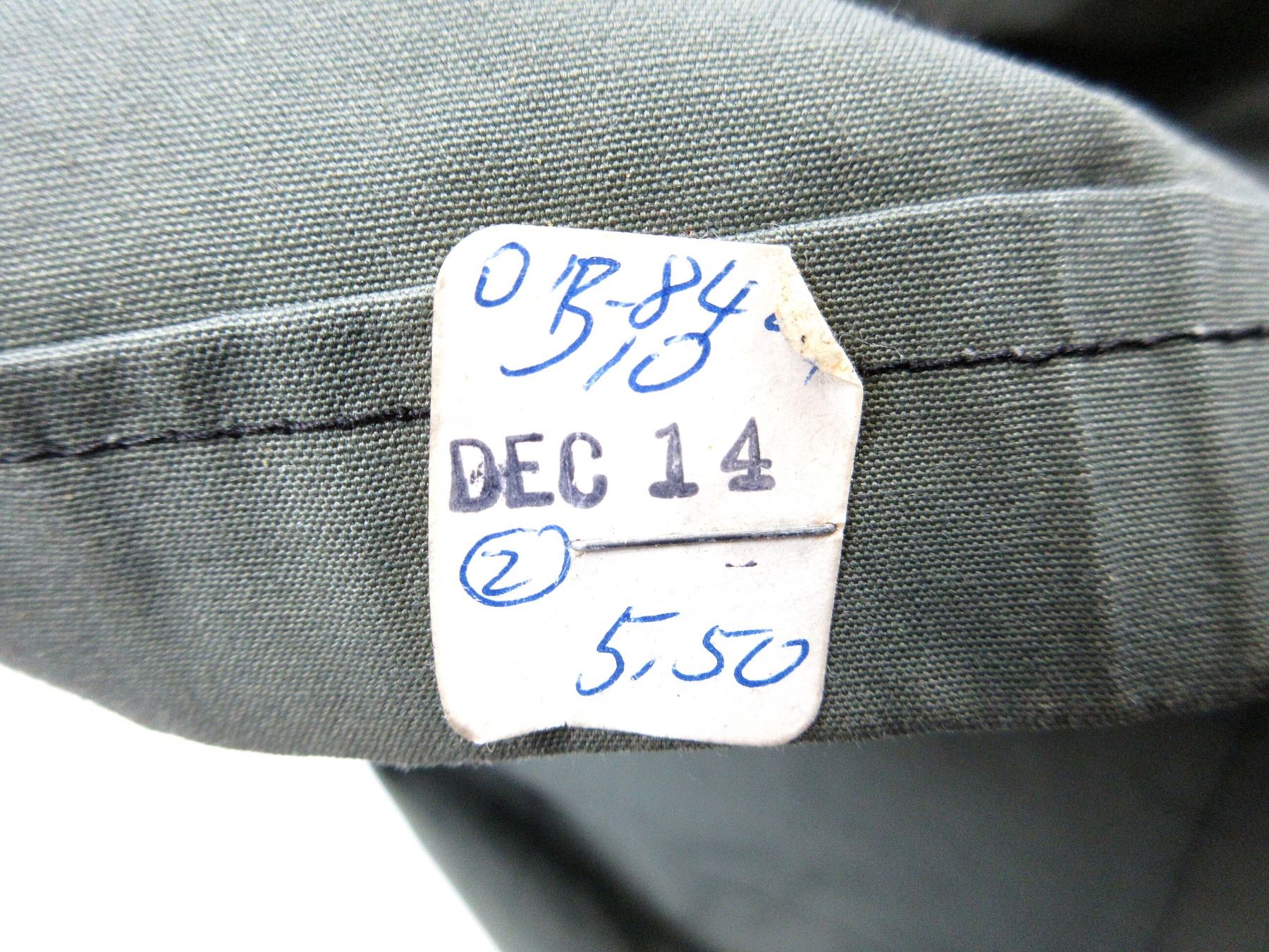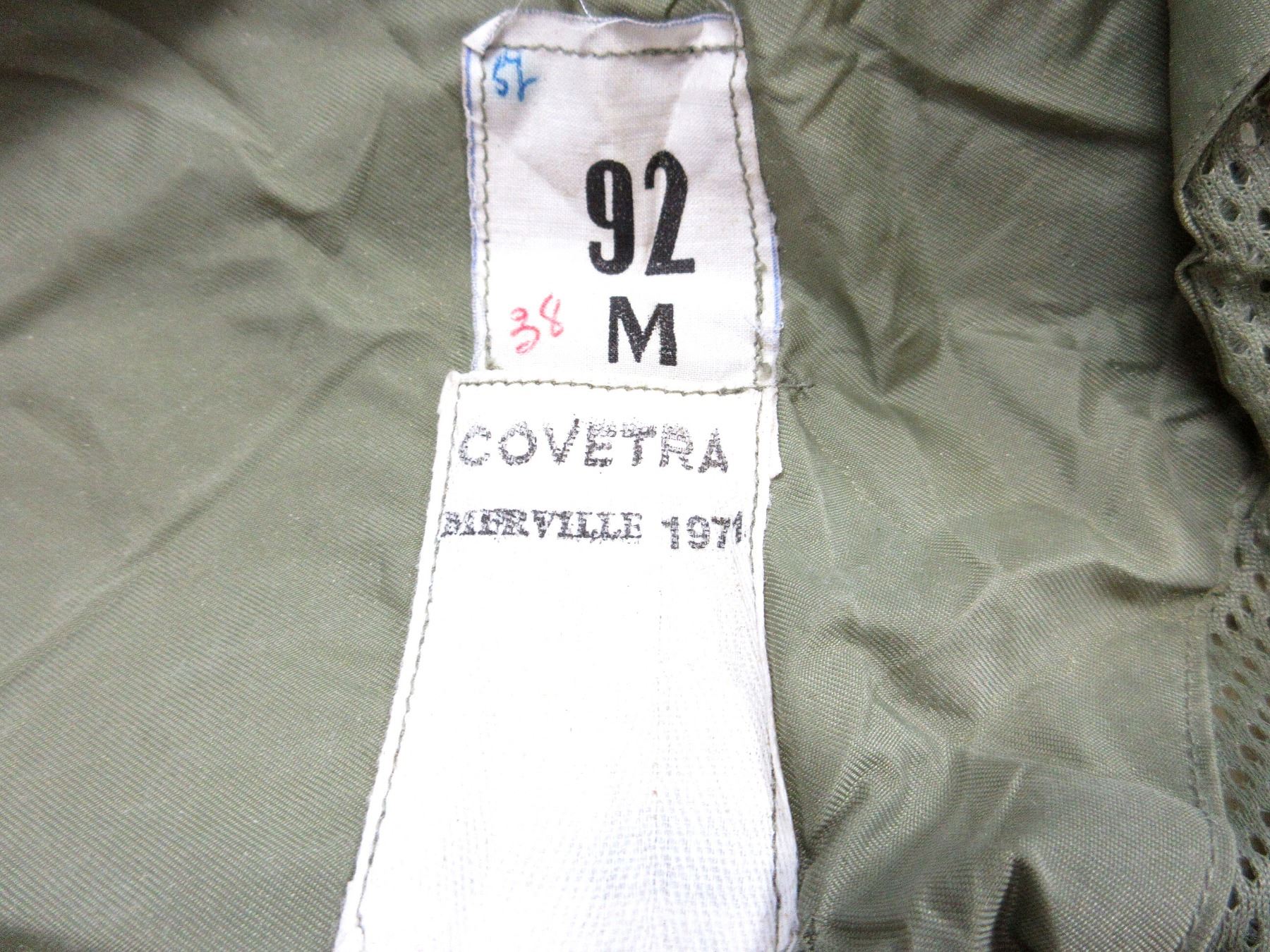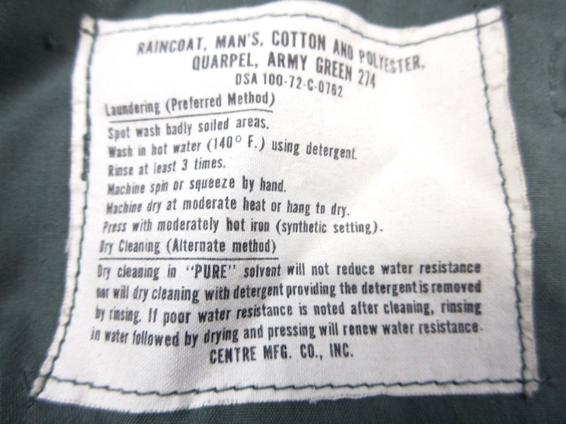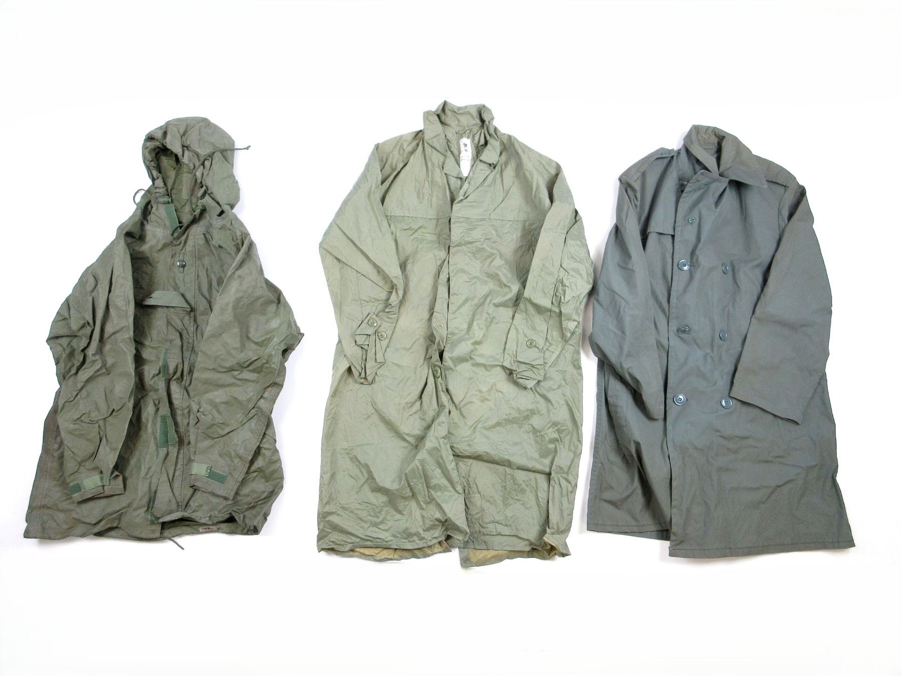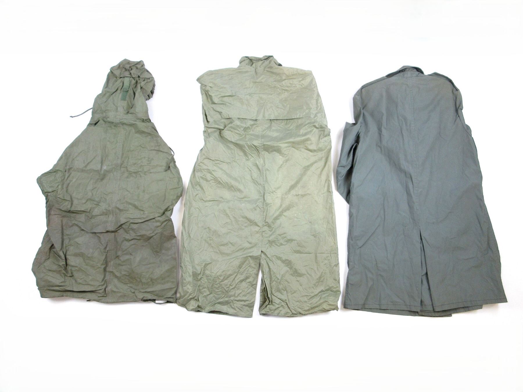 LOT INCLUDES; (1) CANADIAN MILITARY GREEN RUBBERIZED NYLON WET WEATHER COAT, SIZE SMALL-XSHORT, MARKED: "8405-21-907-9705, 6732" ETC., VELCRO / ZIPPERED-FRONT (WORKS), BUILT IN HOOD, SHOWS AGE / WEAR, (1) FRENCH MILITARY RAINCOAT MARKED: "92, M, COVETRA, MERVILLE 1971" & VARIOUS OTHER MARKINGS, BUTTON FRONT, SHOWS WEAR, SHOULDER WIDTH APPROX. 17" & (1) U.S. MILITARY RAINCOAT, MARKED: "RAINCOAT, MAN'S, COTTON AND POLYESTER, QUARPEL, ARMY GREEN 274" ETC., SIZE 36S, BUTTON FRONT, SHOWS SLIGHT WEAR. SEE PHOTOS.