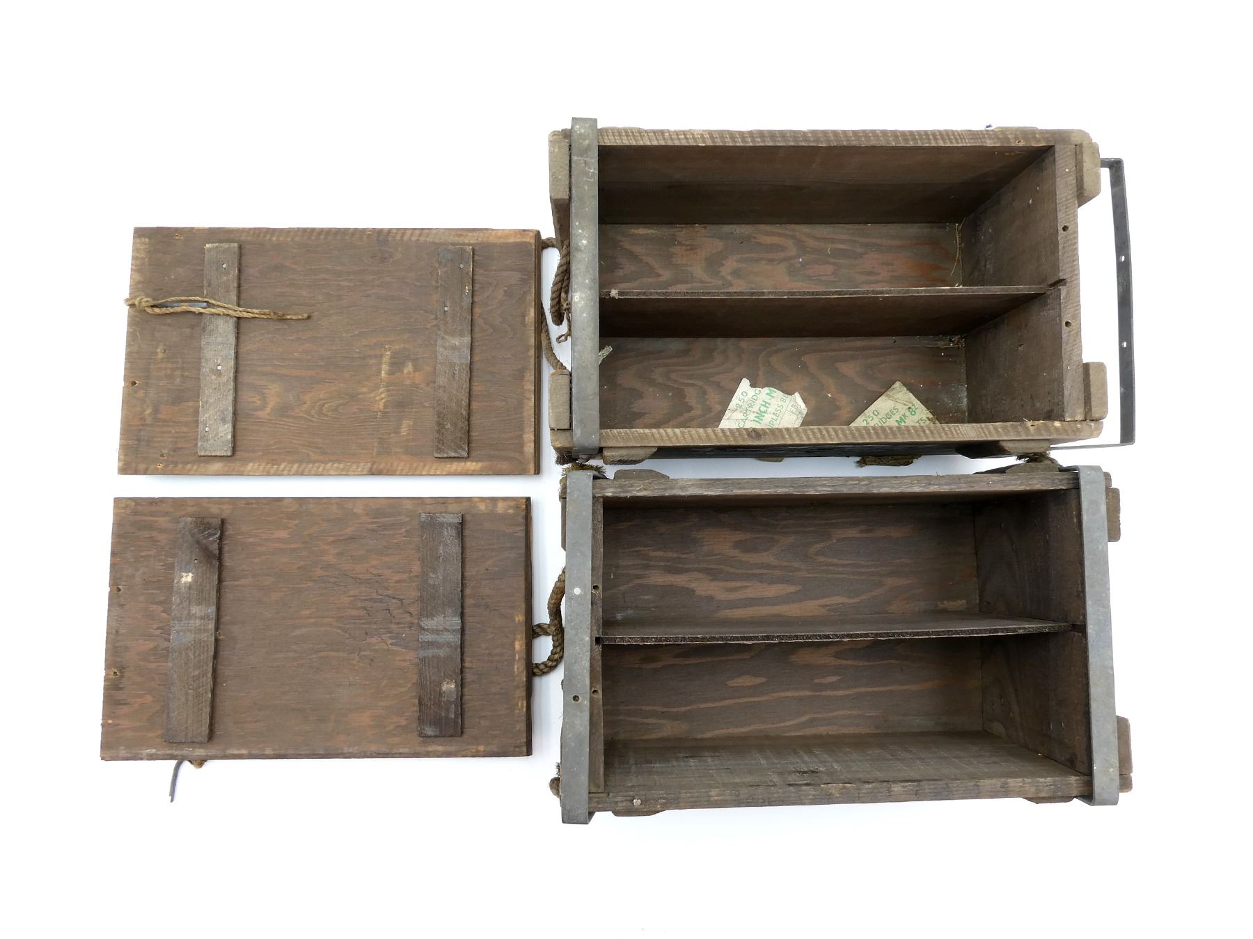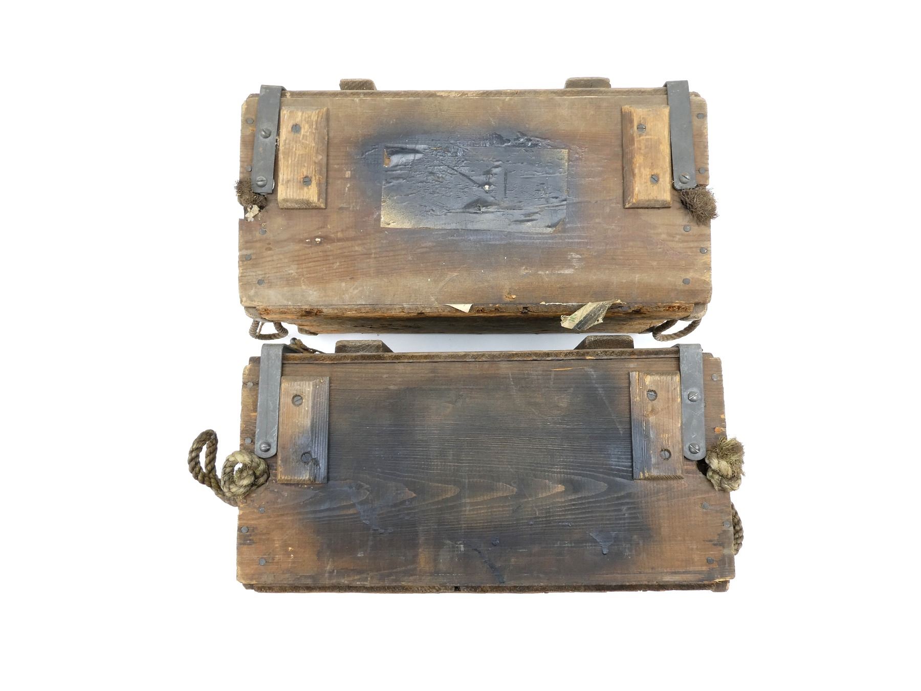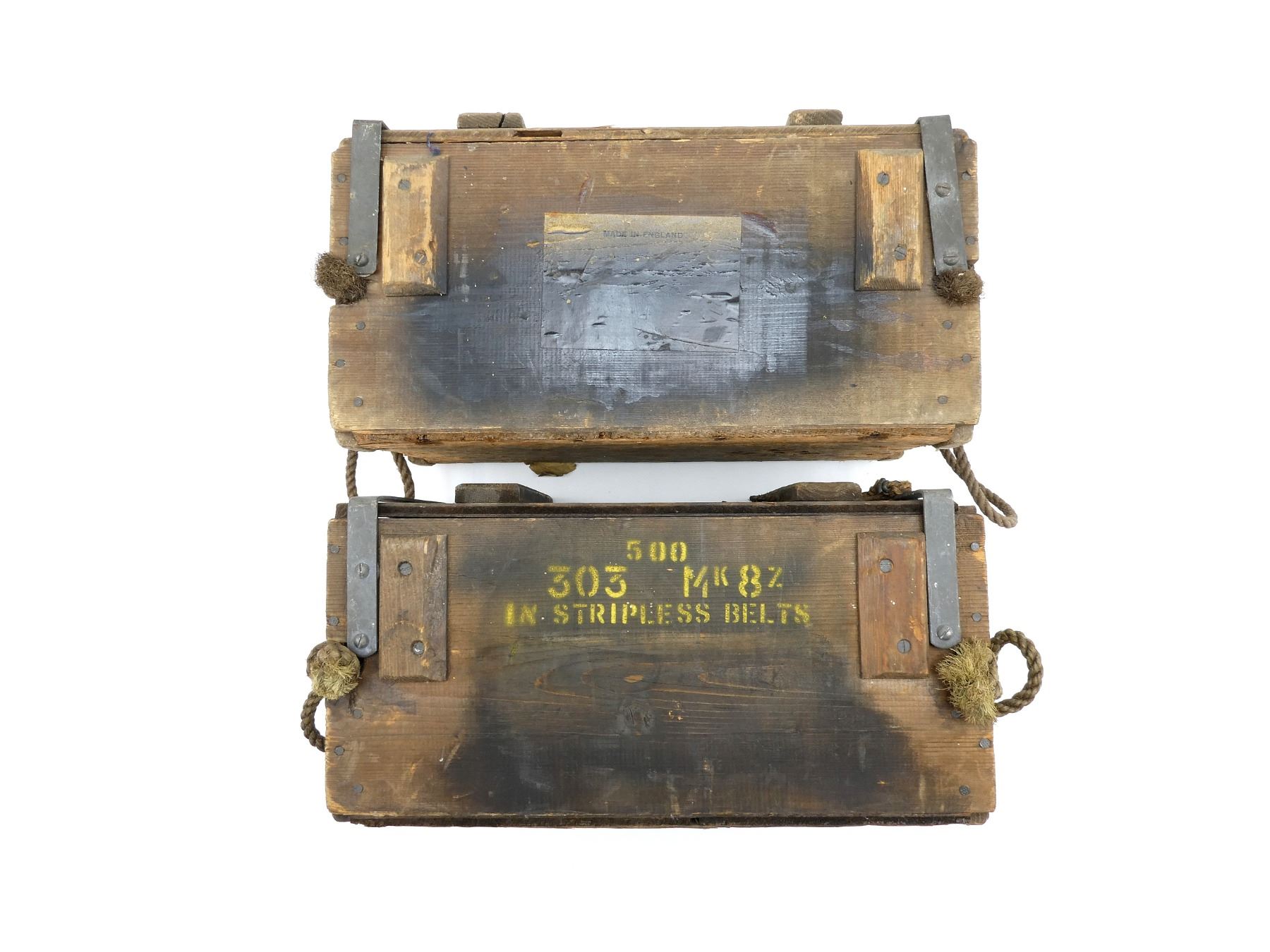 LOT INCLUDES: (2) BROWN PAINTED WOODEN AMMO CRATES WITH LIDS, MARKED: "500 303 MK8Z IN STRIPLESSBELTS", VARIOUS FAINT / UN-CLEAR MARKINGS / STICKERS, METAL HINGES / LATCHES, ROPE CARRY HANDLES, APPROX. 17" X 9.5" X 8.25". SEE PHOTOS.